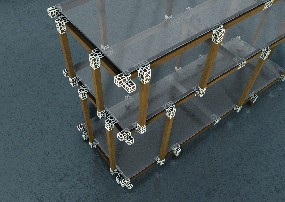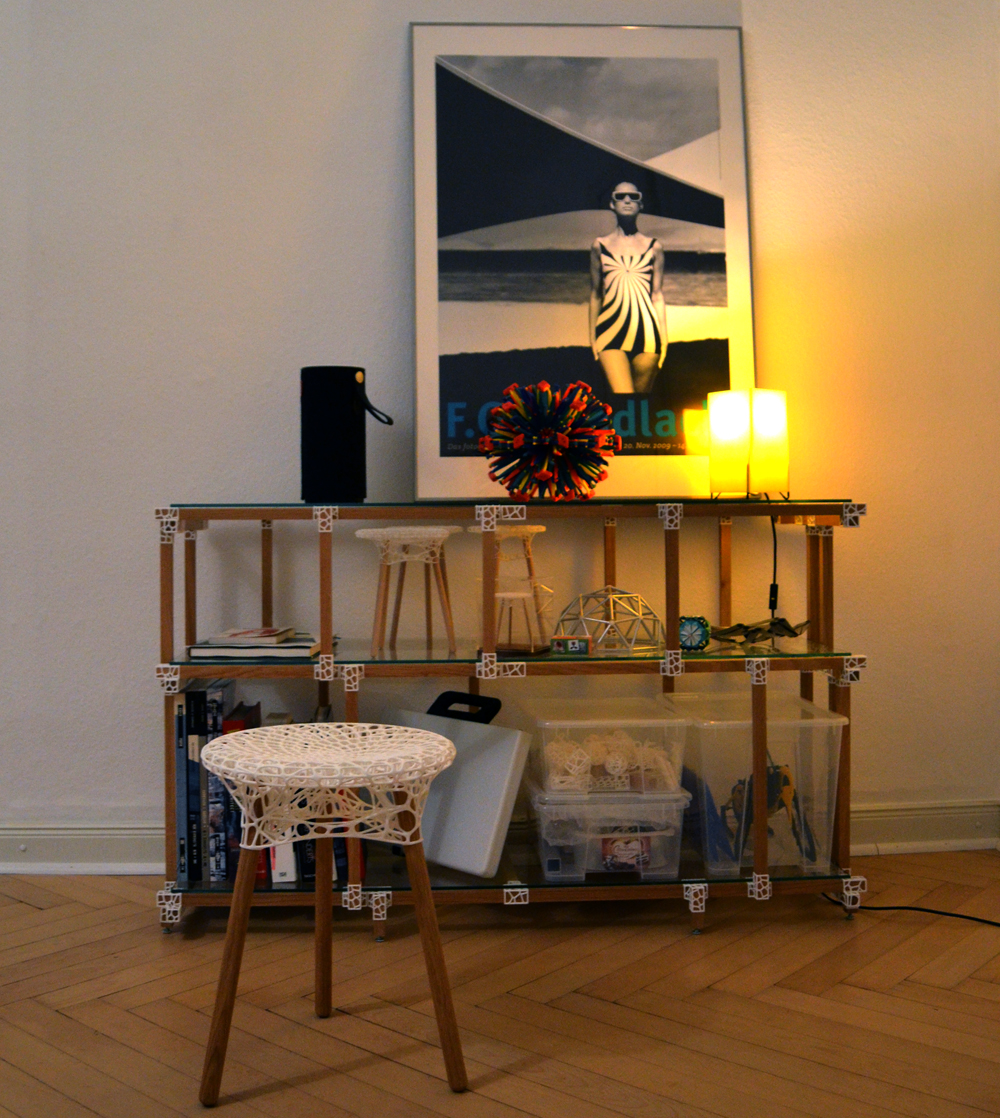 Das Regal ist gewollt schlicht und filigran gehalten. Es wird einfach gesteckt und kommt ohne zusätzliche Versteifung und Verschraubungen aus. Die hierfür entworfenen Verbinder folgen der gleiche Idee des Voronoi Algorithmus wie beim Hocker.