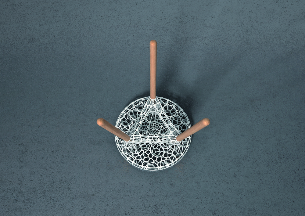 Aufbauend auf dem Voronoi-Algorithmus ist die Sitzfläche des Hockers dem Kräfteverlauf der aufkommenden Lasten entsprechend gestaltet. Die scheinbar unregelmäßigen Zellstrukturen verdichten sich optimal an höher belasteten Regionen und verlaufen frei von großen Zellstrukturen mit geringer Belastung bis hin zur regelmäßigen Gestaltung der oberen Sitzfläche. Dadurch entsteht ein besonders materialeffizienter und mit lediglich 800gr Gewicht, sehr leichter und dennoch eleganter Dreibein-Hocker im selektiven Lasersinter Verfahren.