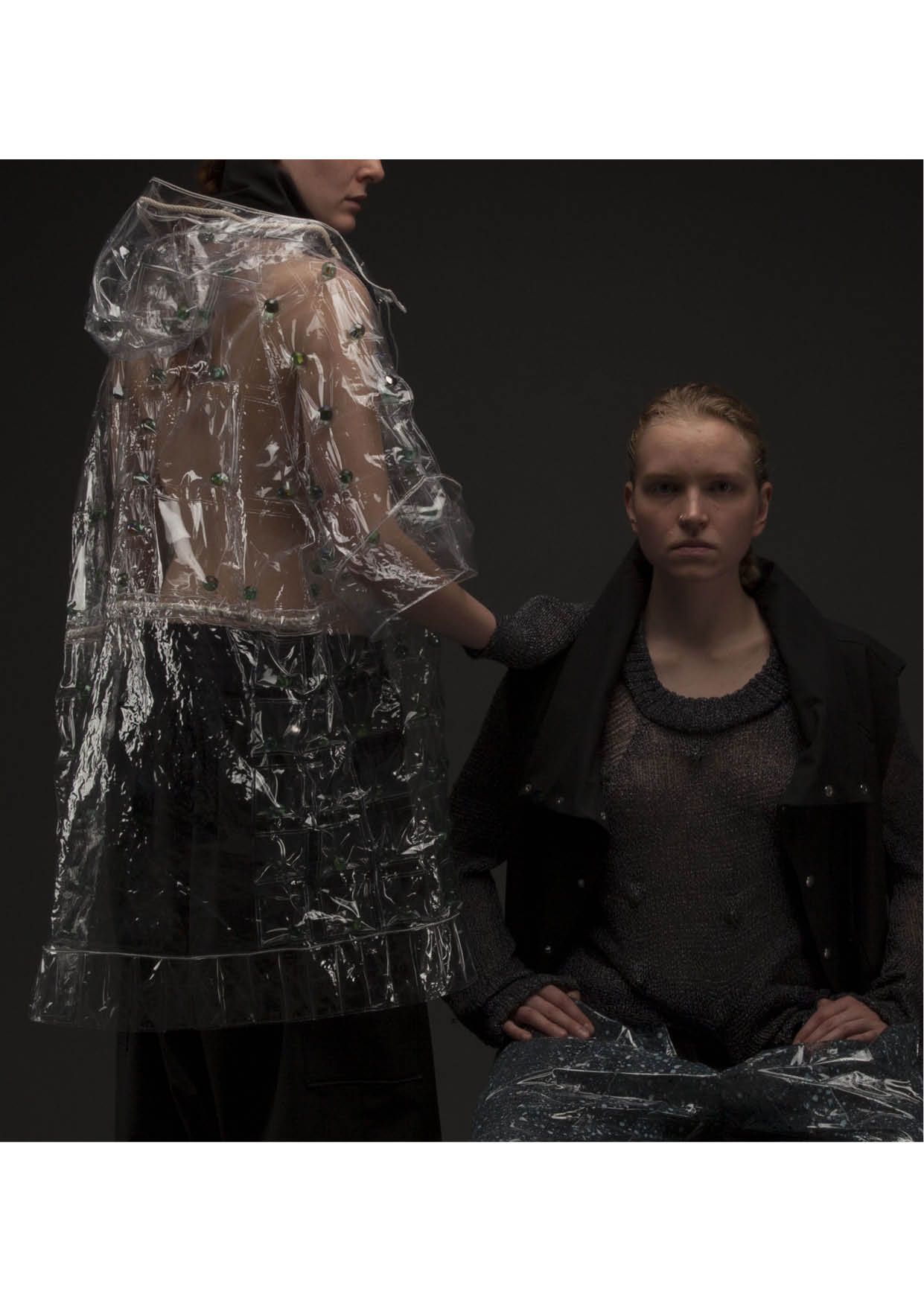 The project „Remaster“ starts with the choice of a classic piece of clothing, which is important to me personal. I chose the „Hubertusmantel“ of my father, it is a special kind of coat, which is worn by many Austrian men on special occasions. The coat is formal and made out of loden. By reconstructing the piece of cloth I found out that it has a total different processing than normal coat constructions. The sleeves are finished with lining as a separate piece of clothing, as well as the corpus. The armhole has a open construction, because the coat has it’s origin in hunting clothes, the arm construction was created to guarantee mobility to shoot. I started to work with this mobility, by giving the wearer the possibility of moving. That fact was the starting point of my collection of two sewn outfits and drawn collection of 20 looks. Two important inspirations for „remaster“ are the photo box of my family with pictures of my working relatives on the farm and the research of this specific coat and sleeve construction. Important for my design was home, tradition, handicraft and generations. Most people leave home, but we all take values, moments and family backgrounds with us. This makes every person special. By showing my stock, I try to combine the feeling of where I come from with the fact that the world is open to me. With the use of a crafting technique with straw and a modern design I remastered my personal classic in my collection.