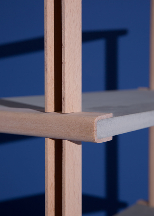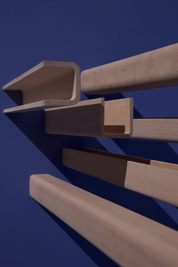 The basis of the work is the tool of production: With a vacuum press plywood profiles are made, forming the basis for a furniture collection. In each of the minimal designs, the character of the constructive element – the open profile – is in the foreground.