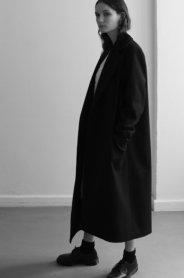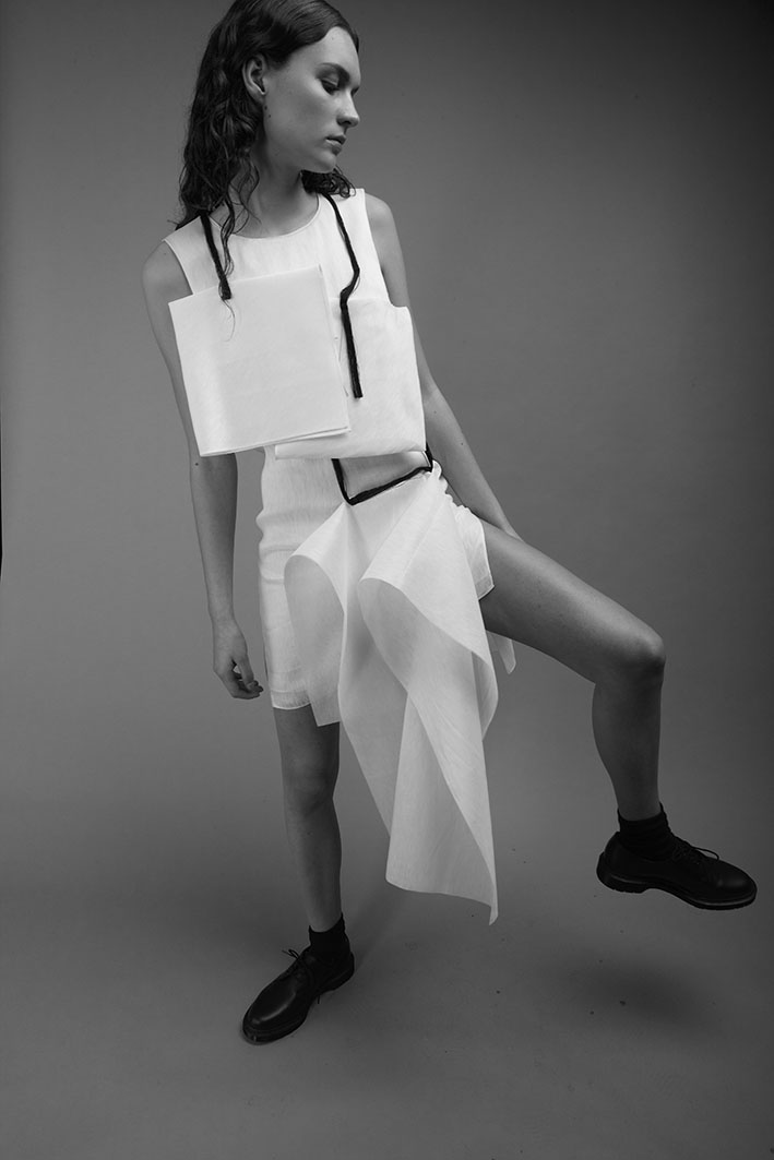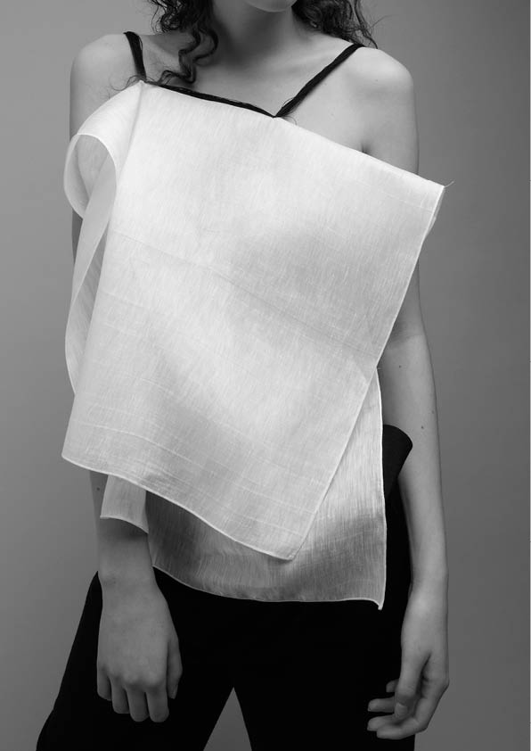 It‘s about keeping things simple and straight. It‘s about a desperate seeking for easiness. The collection quotes the plain rag or scarf as one of our primal and simplest clothing items. It‘s reduced to the flat plain, a simple white square. Black filament threads come as brushlike strokes. In the form of straps that hang the white plains, they might even induce an archaic or naive reminiscence. The collection is greeting rapidness and takes it as a major design element, with silhouettes that appear sketchily, which emphasize the material charakter of the cloth, to turn it into something that gives confidence and ease.
