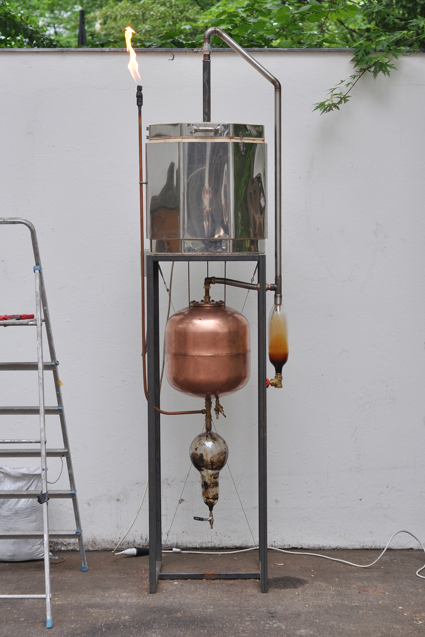 Diesen Prozess wollte er in seinem Projekt nicht nur intellektuell untersuchen, sondern handwerklich-ästhetisch umsetzen. In ersten Entwürfen entwickelte er seine eigene Miniatur-Kokerei. Er ging dabei von einem Keramikofen als Basis aus. Im Zentrum und Kern des Ofens steckte die Retorte. Sie beinhaltet die Kohle, schirmt sie ab von Sauerstoff und schützt sie so vor dem Verbrennen. Zwei mundgeblasene Glaskolben fangen den bei der Destillation entstehenden Teer und andere Flüssigkeiten auf. Ein großer, mit Wasser gefüllter Kupferbehälter funktioniert als Kühlelement. Gase, die nicht verflüssigt werden, werden über ein besonderes Rohr ausgeleitet und bei ihrem Austritt verbrannt.