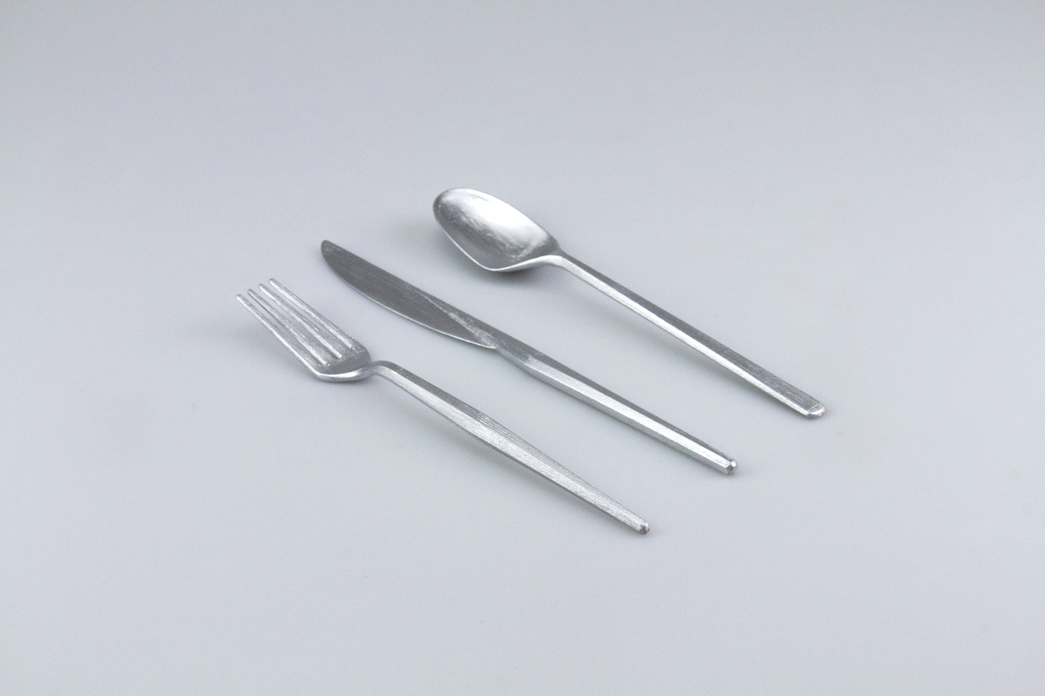 Bei dem finalen Entwurf bleibt bei dem Griff der Gabel der regelmäßige sechseckige Querschnitt bestehen, da die Gabel am beweglichsten in der Hand liegen muss. Der Griff des Messers wird noch ein Stück über die Klinge geführt, so dass man eine breitere Auflagefläche hat, um besser Druck beim Schneiden ausüben zu können. Des Weiteren ist der Griff seitlich gestaucht, um möglichst wenig Spiel in der Hand zu haben und so die Klinge besser führen zu können. Der Griff des Löffels ist wiederum gegen das Ende hin abgeflacht und vereinfacht es so den Löffel waagerecht zu halten.