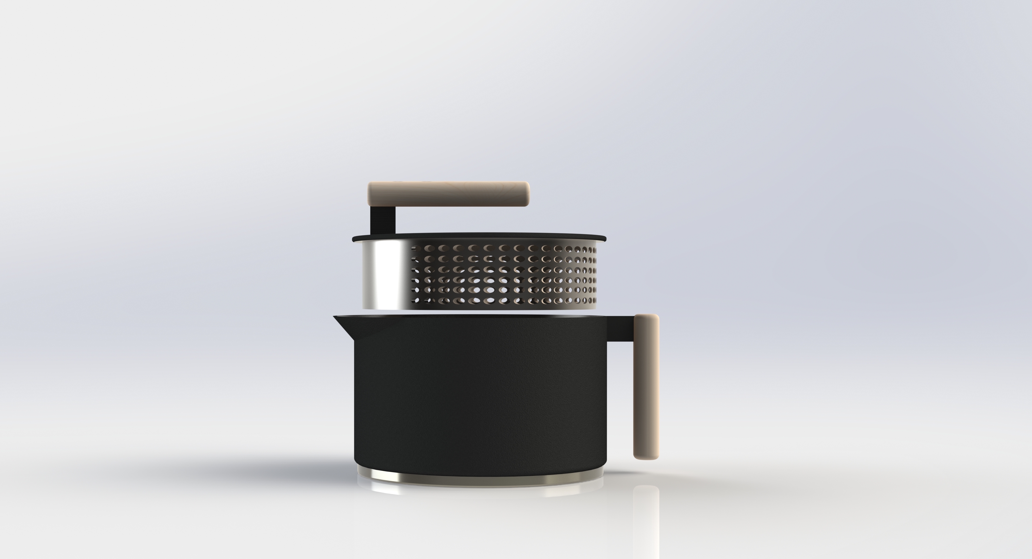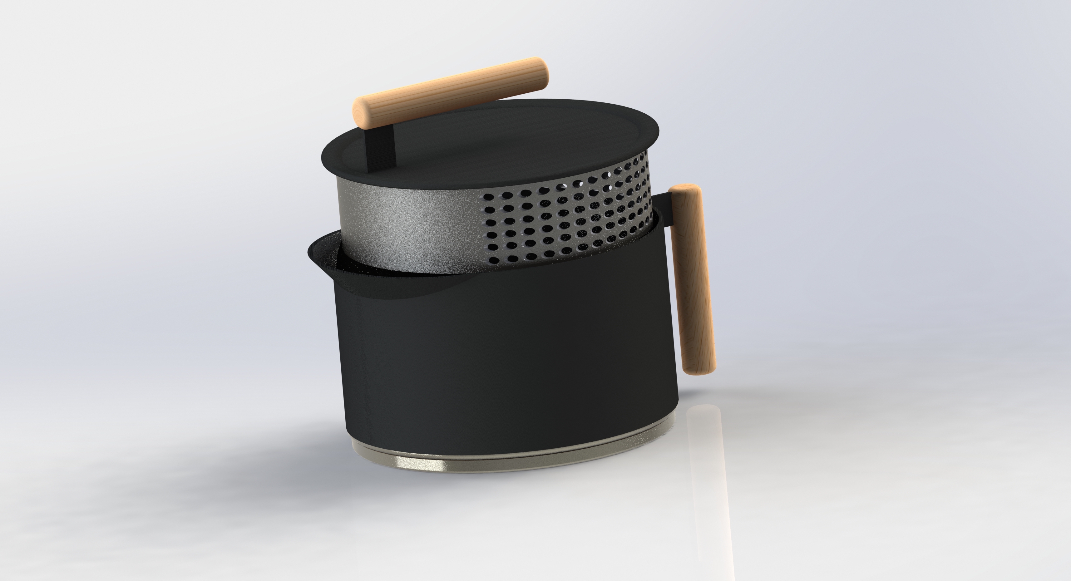 Zunächst entstand ein Modell aus Pappe um die ersten finalen Ideen zu diesem Projekt maßstabsgetreu zu visualisieren. Dadurch wurden vermeintliche Problemzonen wie z.B. die Verortung der Griffe und die Länge des Siebes sichtbar. Ein ausführliches Beratungsgespräch mit dem Leiter der Metallwerkstatt war es möglich einen genauen und simplen Bauplan zur Fertigung des Topfes zu erstellen. Es entstand zunächst ein 75 cm langes und 14 cm breites Stahlblech, das zur einer Röhre mit dem Durchmesser von 20 cm Ø umgeformt wurde. Eine Ronde mit ebendiesem Durchmesser dient als Bodenplatte. Für den Aufbau des Deckels begann ich mit dem Abkanten eines 72 cm langen und 4 cm breiten Streifen aus Stahlblech, um zunächst Löcher für das Sieb zu bohren.