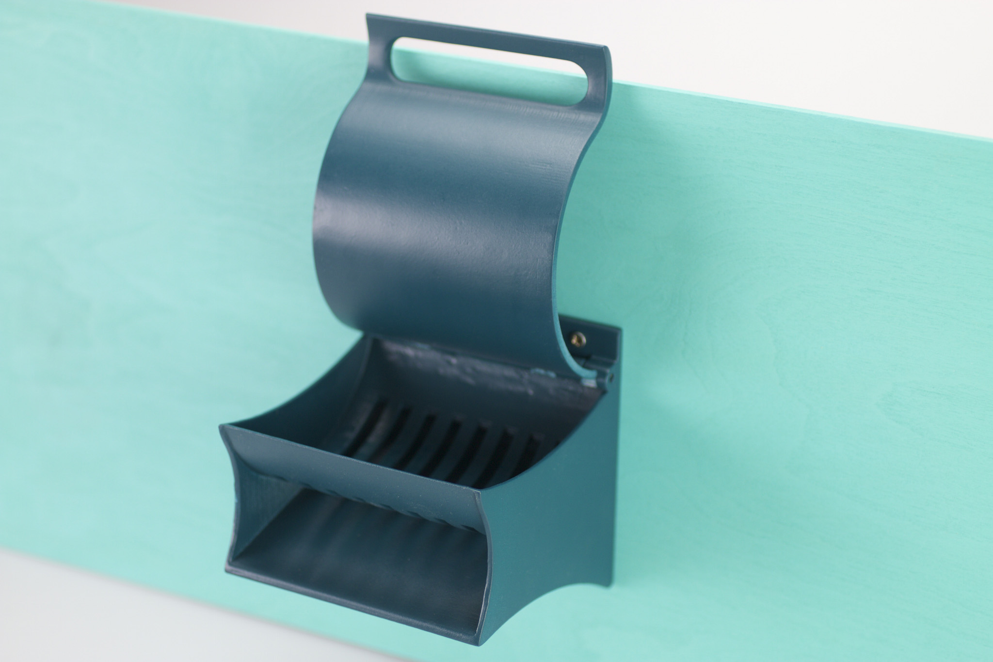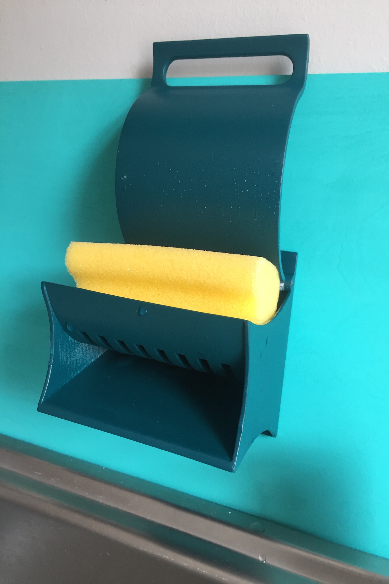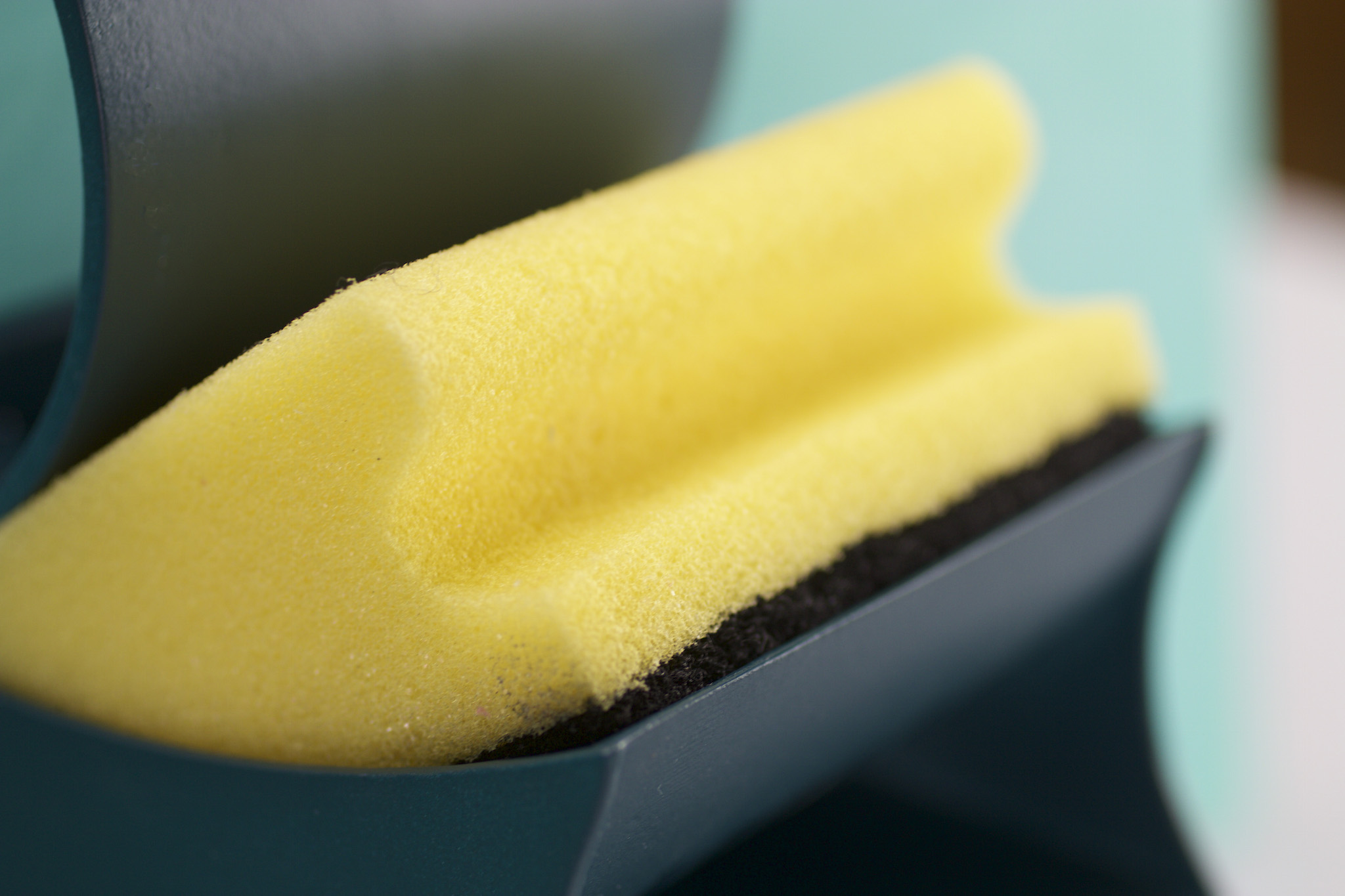 Nicht etwa im Badezimmer oder der Toilette sind die meisten Bakterien zu finden: Der Schwamm ist die größte Keimschleuder im gesamten Haushalt. Oft benutzt man den Schwamm nur wenige Tage bis man feststellt, dass er vollgesogen ist, unangenehm riecht oder eine schmutzige Farbe angenommen hat. Die Problemzone Schwamm ist das Thema des Entwurfs. Es soll eine Ablage für den Schwamm gestaltet werden, die eine Distanz herstellt und gleichzeitig die Haltbarkeit verlängert, um ihn wieder zum Freund in der Küche zu machen. Nach den ersten Recherchen und Modellen wurde klar, dass das zu gestaltende Objekt eine Ablage für den Schwamm wird, die gleichzeitig unterstützen soll, ihn auszupressen. Wichtig bei den ersten Modellen war also herauszufinden, welche Ausdrücktechnik sich dafür am besten eignet. Dafür wurden andere Küchengeräte, wie die Knoblauchpresse als Vorlage genutzt und deren Technik in die Schwammstation übersetzt. Es zeigte sich, dass gleichmäßiger Druck auf die gesamte Fläche des Schwamms ausgeübt werden muss, um das Wasser vollständig auszudrücken.