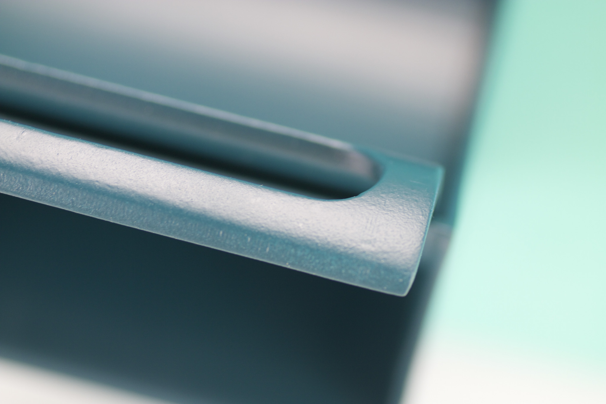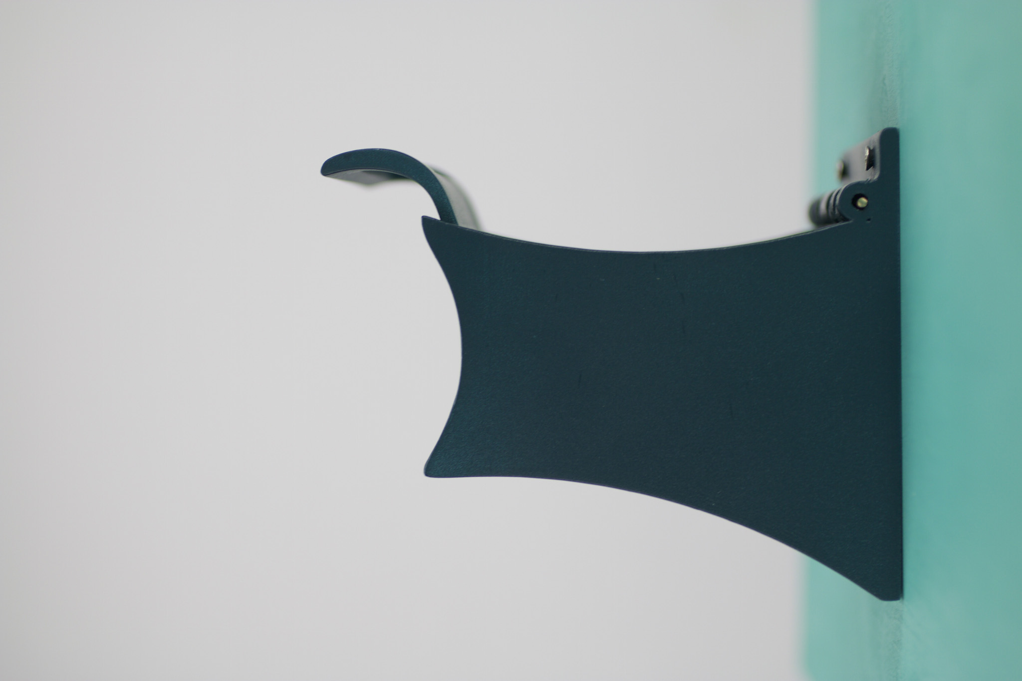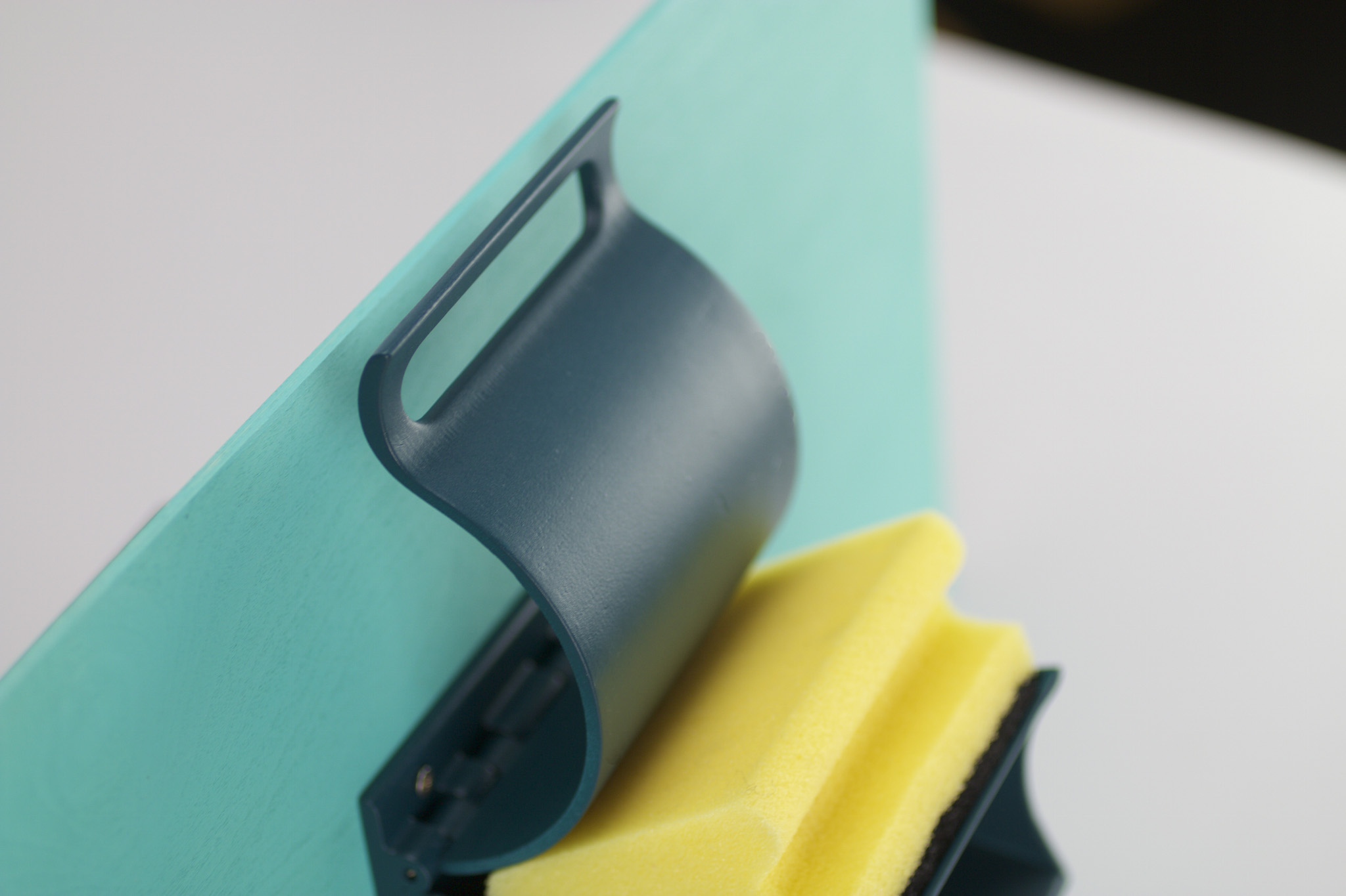 Durch die stabile Anbringung an der Wand wird ein effektives Ausdrücken gewährleistet. Der Griffist notwendig, damit die Kraft auf den Schwamm umgewandelt wird. Für Squeeze wurde ABS (Kunststoff) gewählt, da es ein Material ist, das keine Bakterien aufnimmt. Um keine unhygienischen Rückstände des Schwamms sichtbar zu machen, ist das Material dunkeltürkis eingefärbt. Durch die Löcher in der Ablage, kann das ausgedrückte Wasser abfließen und wird über die Schräge ins Waschbecken geleitet. Die Form wurde entsprechend der Welle, die den Schwamm ausdrückt, angelegt. Der Prototyp „Spueeze“ ist eine Ablage für den Schwamm. Nach dem Abwaschen legt man den Schwamm in Spueeze und drückt den Hebel zum Ausdrücken herunter. Das überschüssige Wasser wird in das Waschbecken geleitet. Spueeze macht es möglich, den Schwamm auszudrücken, ohne ihn dabei in die Hand nehmen zu müssen.