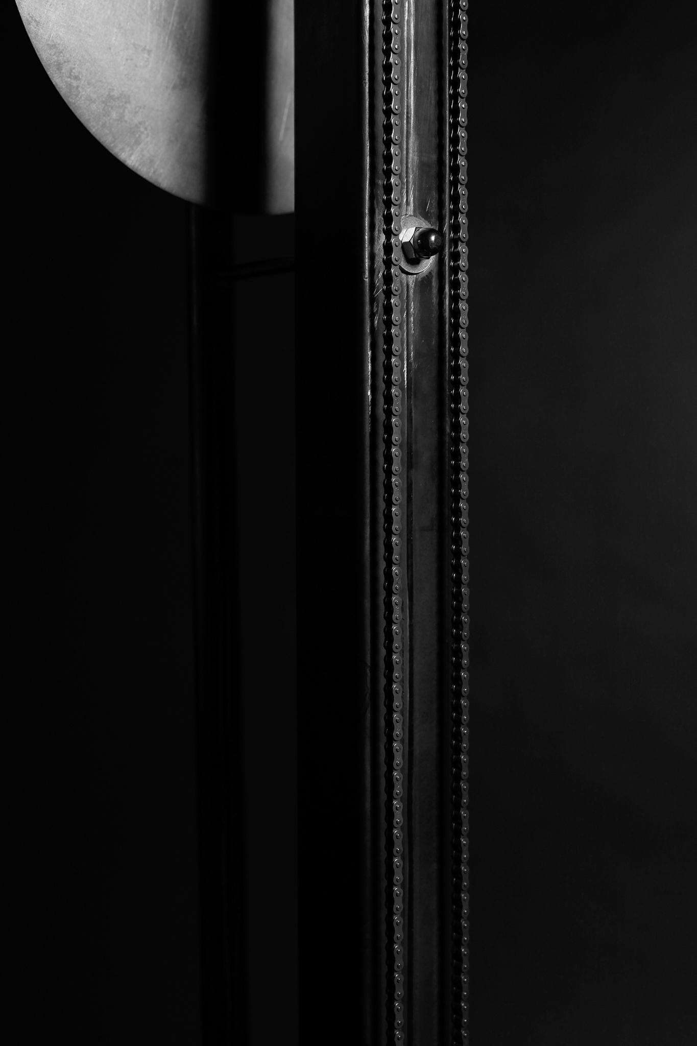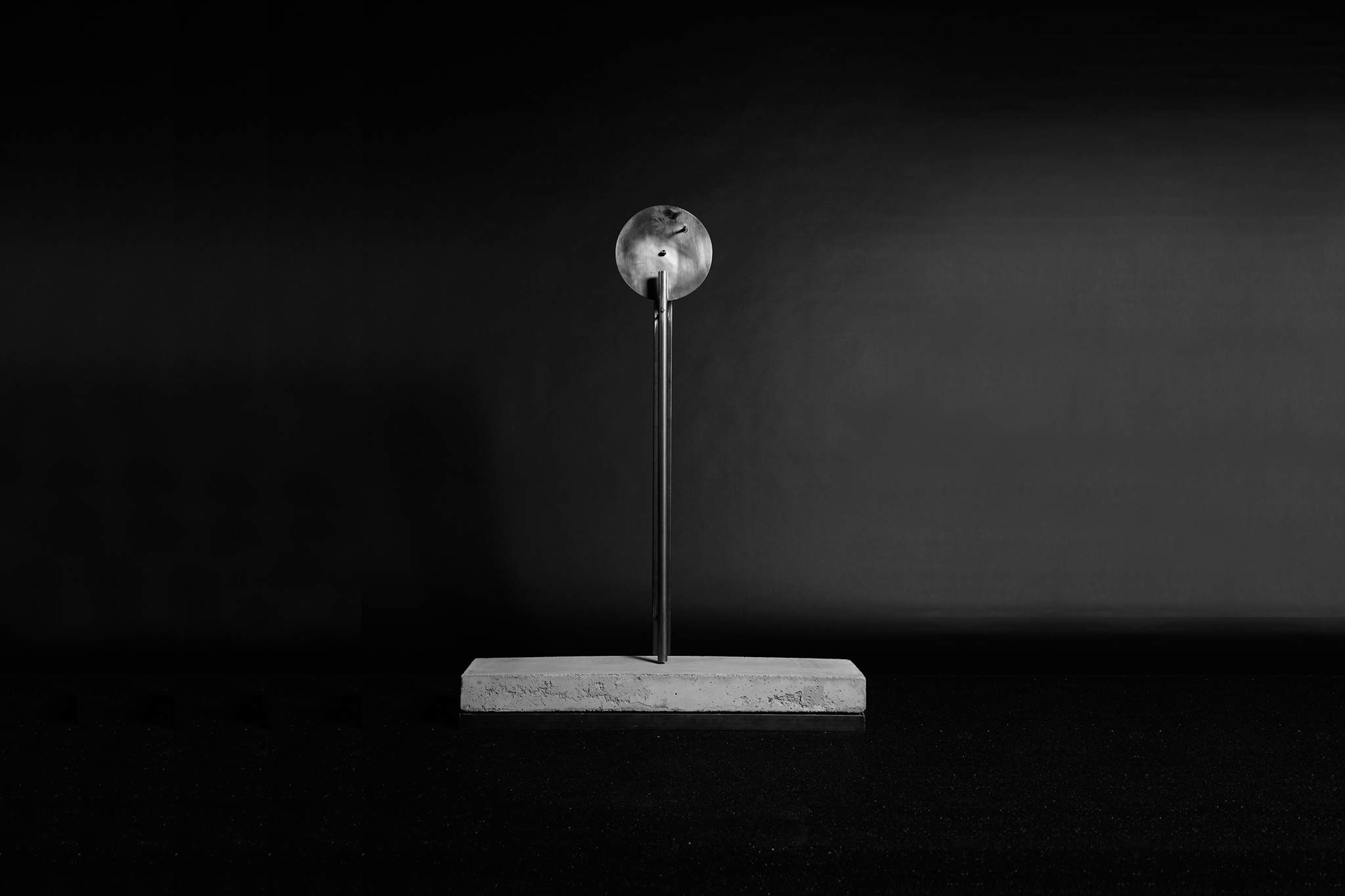 Im Inneren des Rundrohprofils sind zwei UV LED´s, die durch eine Knopfbatterie versorgt werden, verbaut. Die für den Rezipienten von aussen nicht sichtbare Lichtquelle pendelt so im kurzen Abstand über den im unteren Abschnitt integrierten Betonguss. Die Oberfläche des Standfusses wurde mit einem transparentem Gemisch aus Nachleuchtpigmenten und Klarlack glasiert. Durch die im Pendel integrierten UV LED´s wird so die einlackierte Betonoberfläche zum Aufladen gebracht. Resultat dieser Reaktion ist ein phosphorisierender Lichtstreifen, welcher nach dem Kontakt mit dem ultraviolettem Licht langsam erlischt.