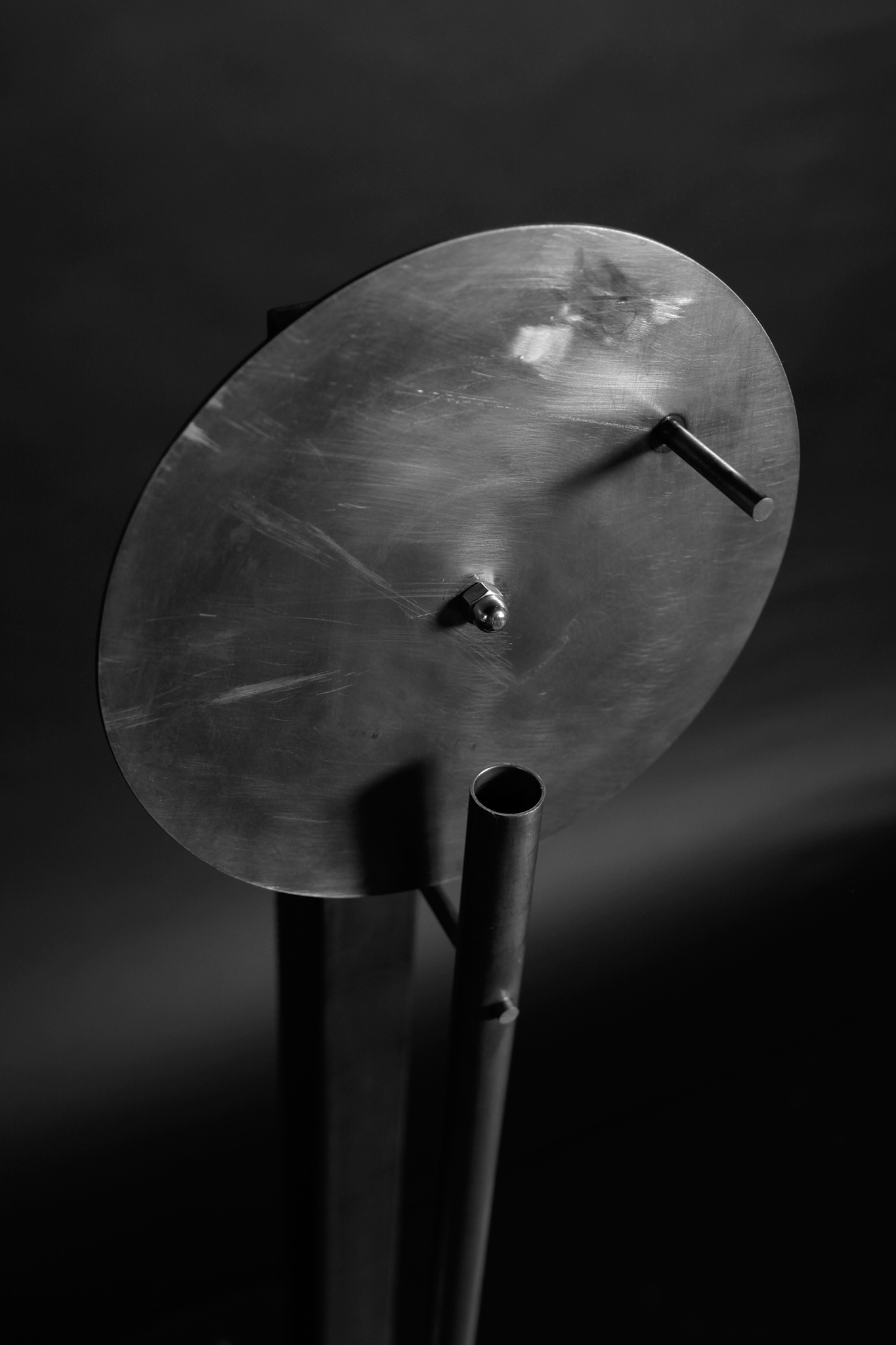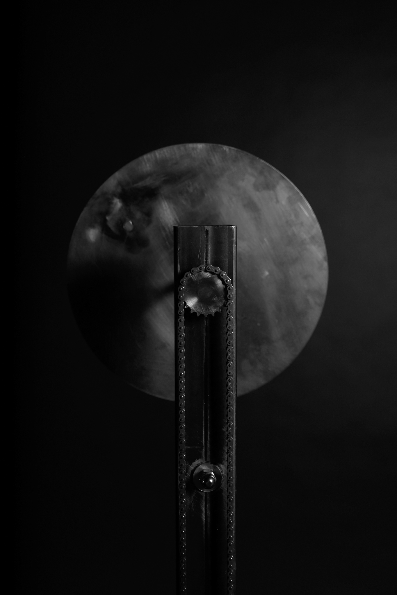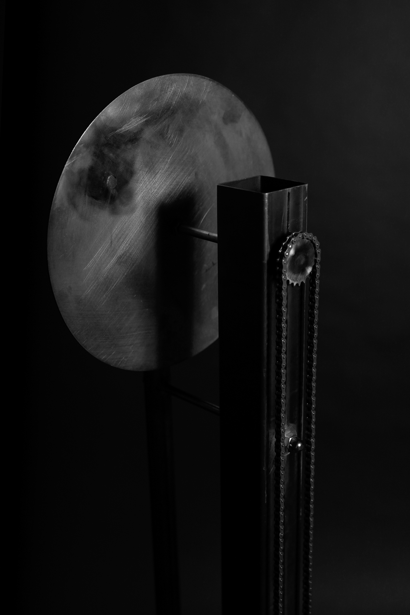 Die im oberen Bereich verschraubte Exzenterscheibe wird durch den im Rücken befestigten Kettenantrieb zum Drehen gebracht. Das langsame kreisen der Zahnräder beeinflusst die Geschwindigkeit des Mitnehmers, welcher auf der Vorderfläche der Baustahlscheibe verschweisst wurde. Im geplanten Minutentakt wird so das 1000mm lange Pendel aufgezogen und zum schwingen gebracht.
