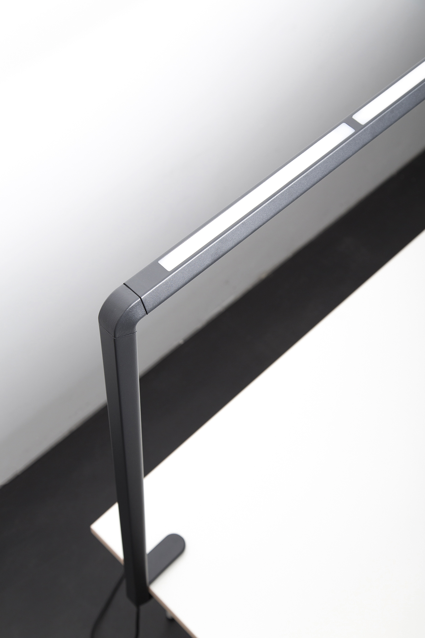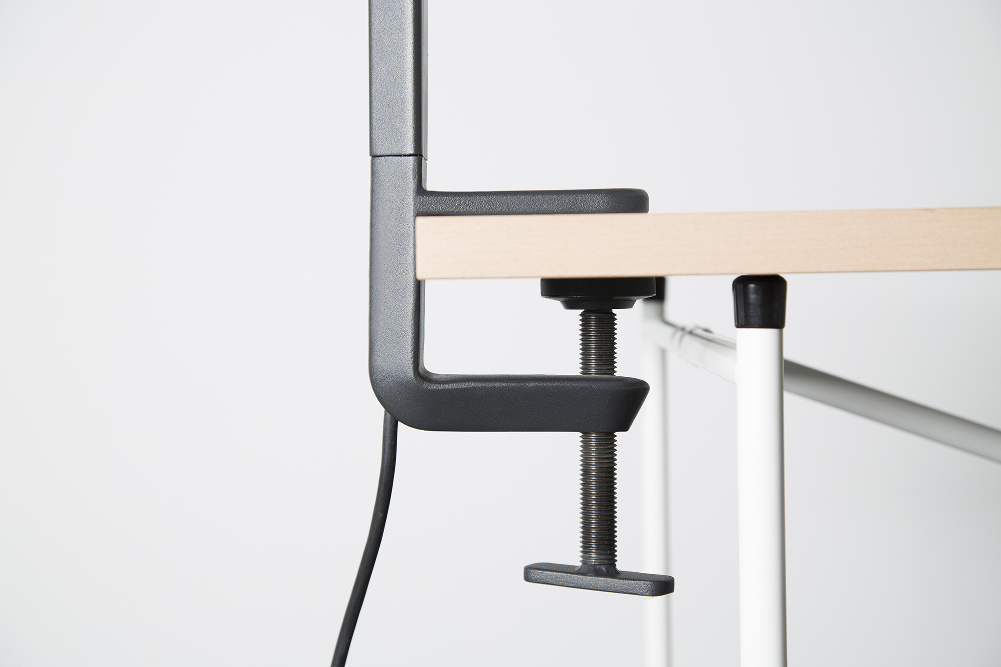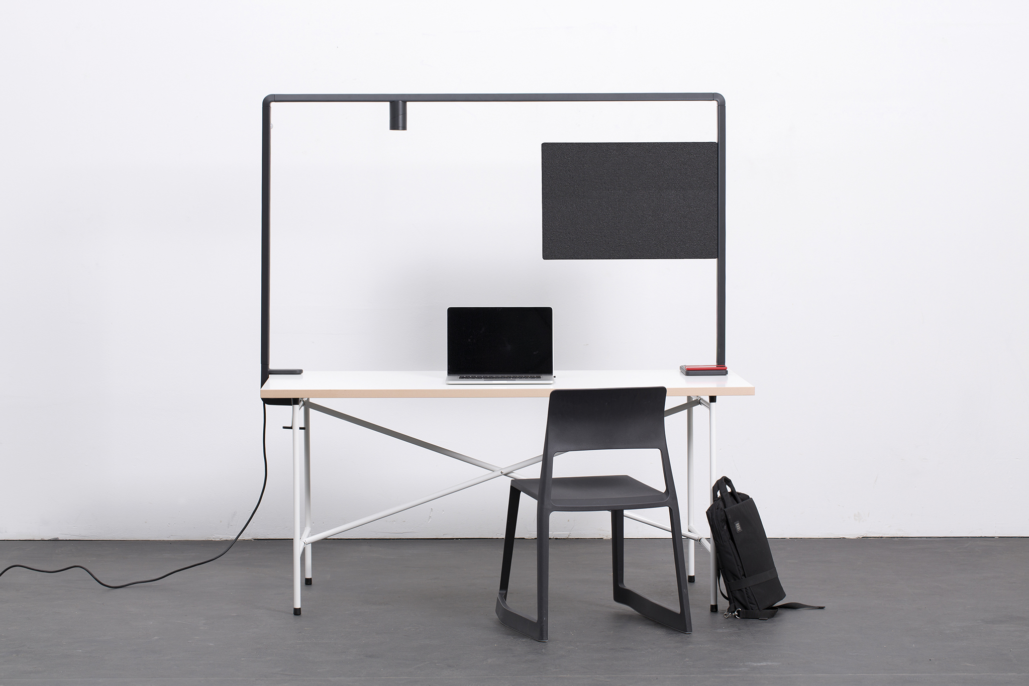 Ein klemmbares Profil sorgt für die optimale Raumbeleuchtung und ersetzt herkömmliche Deckenbeleuchtung. Zusätzlich können Lichtmodule zur individuellen Arbeitsplatzbeleuchtung eingesetzt werden. Das Lichtprofil wird über den Standfuß gesteuert. Dieser dient gleichzeitig als Ladestation für elektronische Geräte. Die Lichtmodule werden kabellos über induktive Energieübertragung mit Strom versorgt und können frei innerhalb des Profiles platziert werden. Bei Bedarf sorgen Sichtschutzpaneele für die entsprechende Privatsphäre.