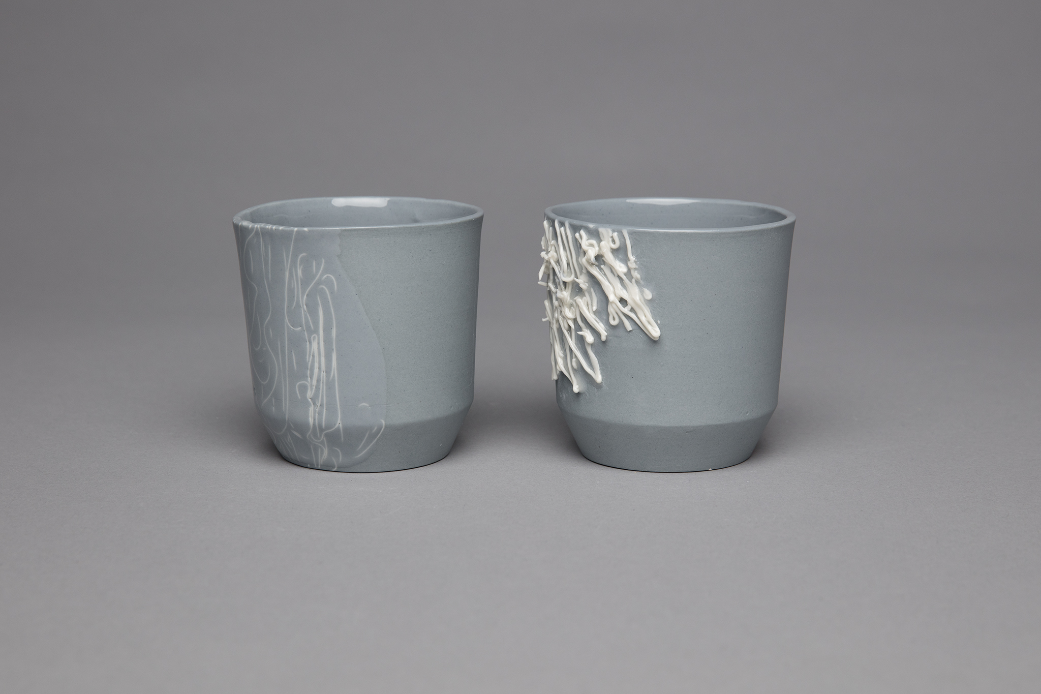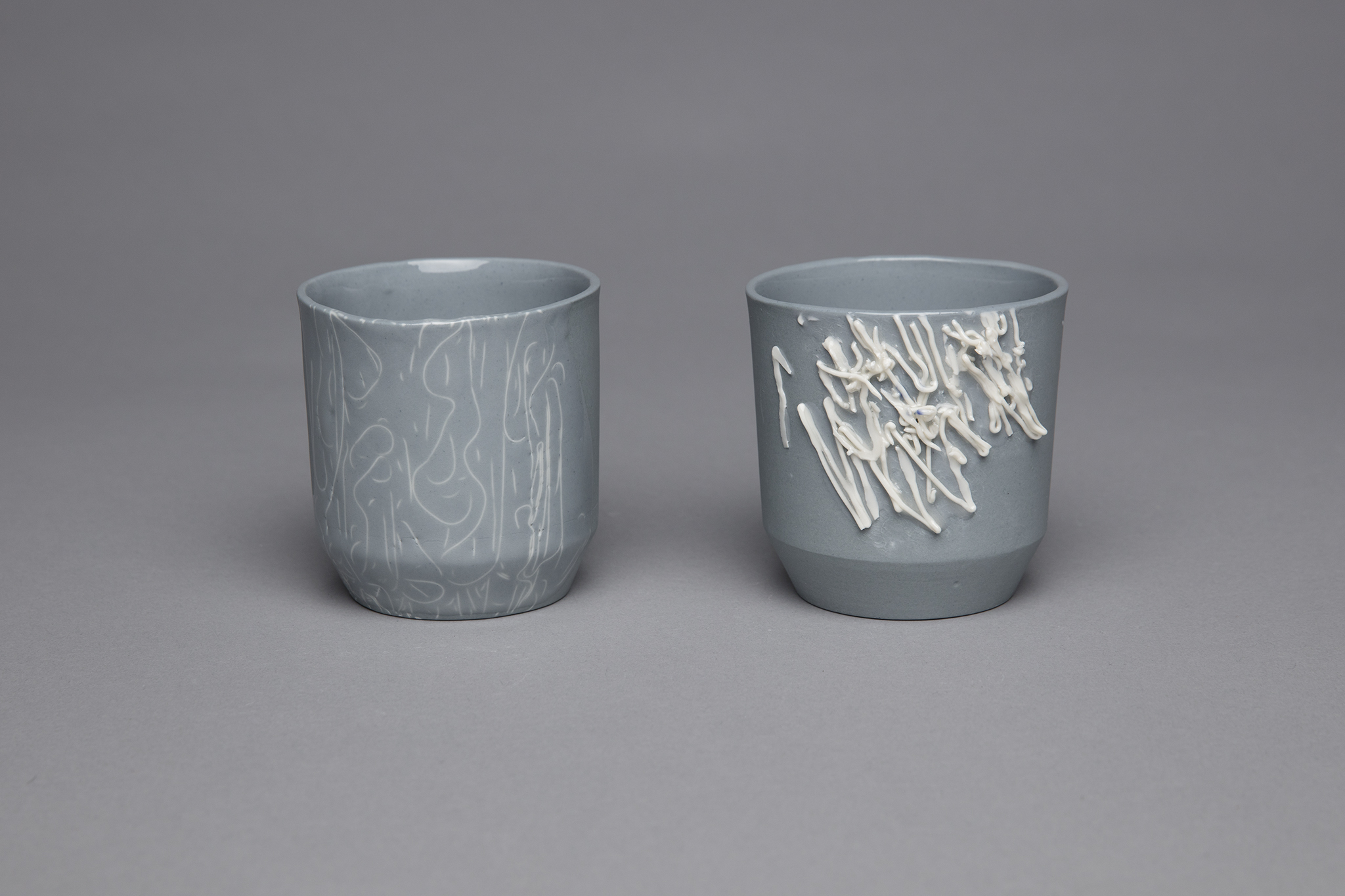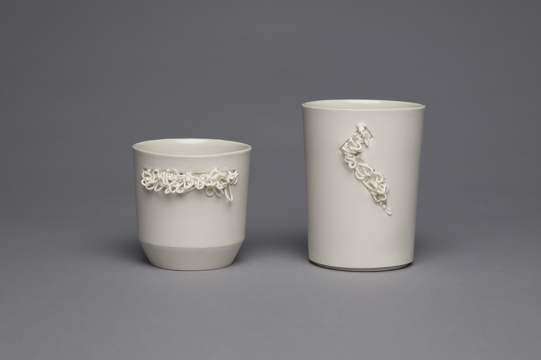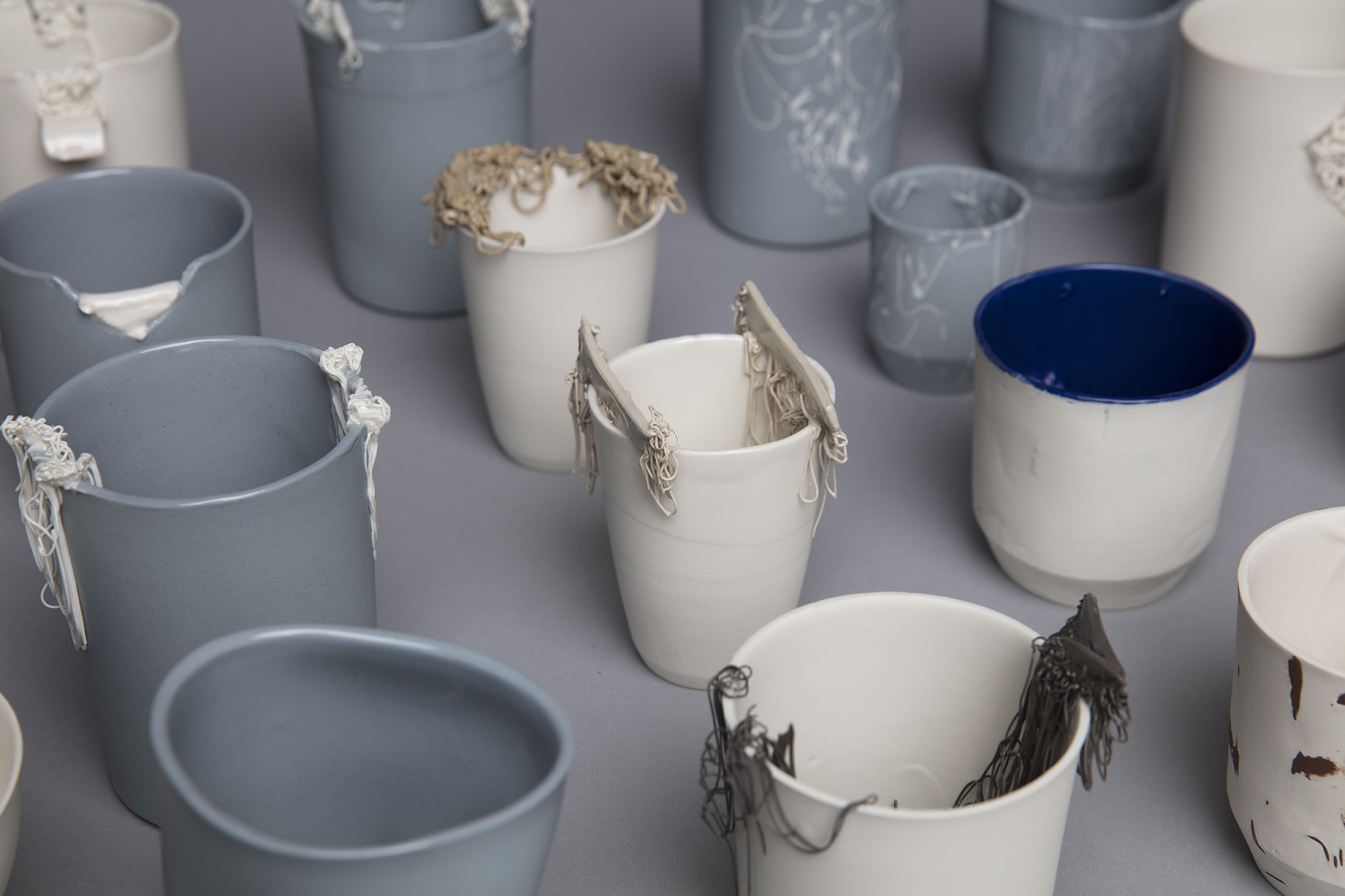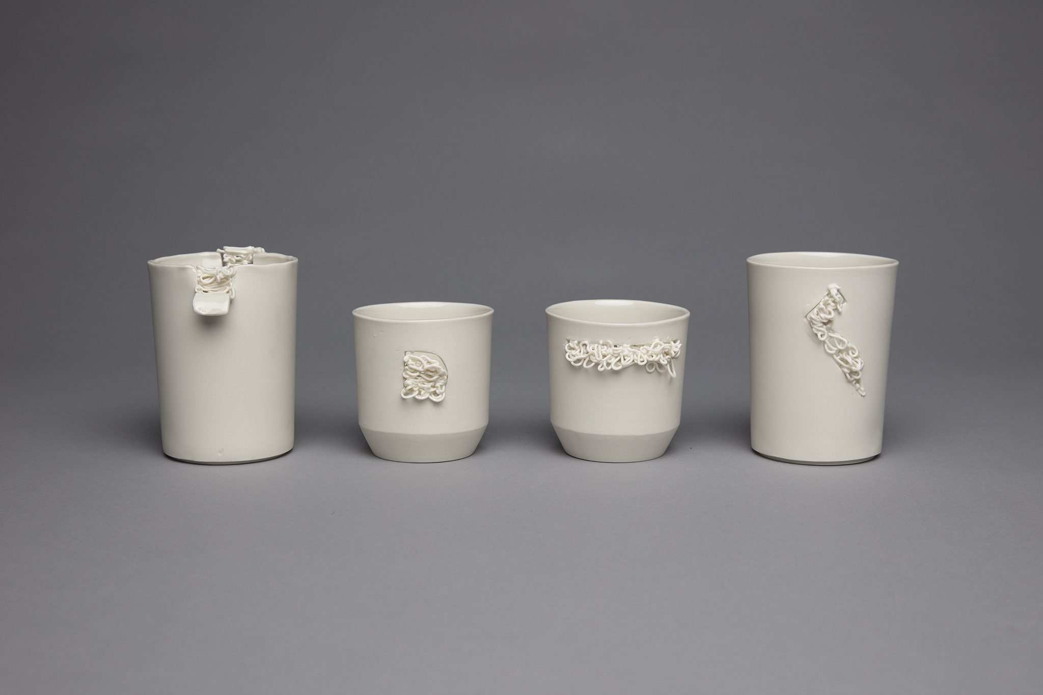 Das Drucken von einzelnen Henkeln und anschließende Anschlickern an das Objekt, in die Gips-Form drucken und anschließend das flüssige Porzellan hineingießen, das direkte Aufdrucken von einem weiteren Teil oder Stand auf das untere Ende des gegossenen Objektes, das Füllen von Löchern im lederharten Objekt mit Hilfe von gedruckten, abstrakten Gebilden, das Drucken von abstrakten Gebilden auf den Becher(rand).