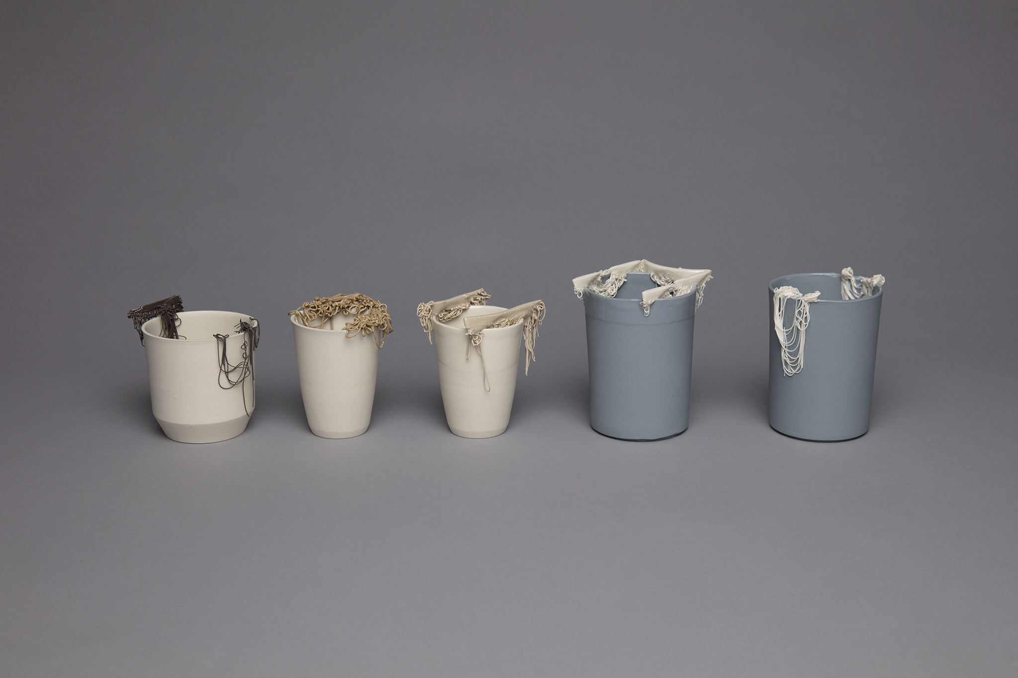 Das Resultat des Projektes MERGING ist eine Sammlung von experimentellen Objekten, die sich dem Zusammenführen von 3D Druck und slip casting nähern.