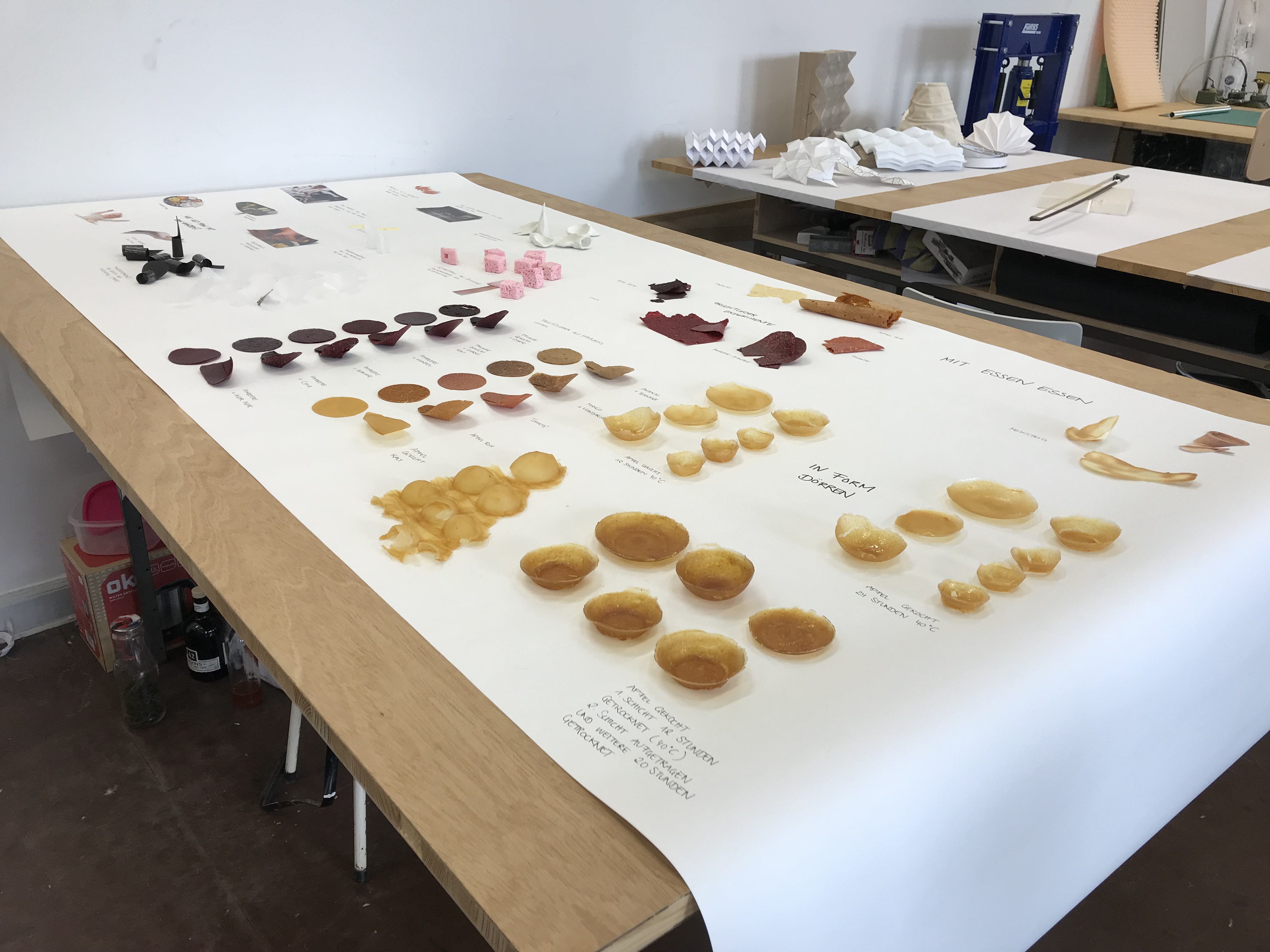 Ich möchte mich mit Oberflächen und Texturen, Materialien und Formen von Utensilien beschäftigen, die dafür gemacht werden, Lebensmittel aufzunehmen, zu transportieren und zusätzlich selbst essbar sind. Bei dem Entwurf neuer Utensilien soll nicht nur das traditionelle Besteck oder Geschirr als Vorbild dienen, sondern ebenso das spezifische Gericht – die optimale Art und Weise finden, ein Essen aufzunehmen. Ich möchte eine spielerische Art und Weise des Essens ermöglichen, bei der es nicht tabu ist, mit den Händen zu essen, da das Besteck oder ähnliches ebenfalls essbar ist.