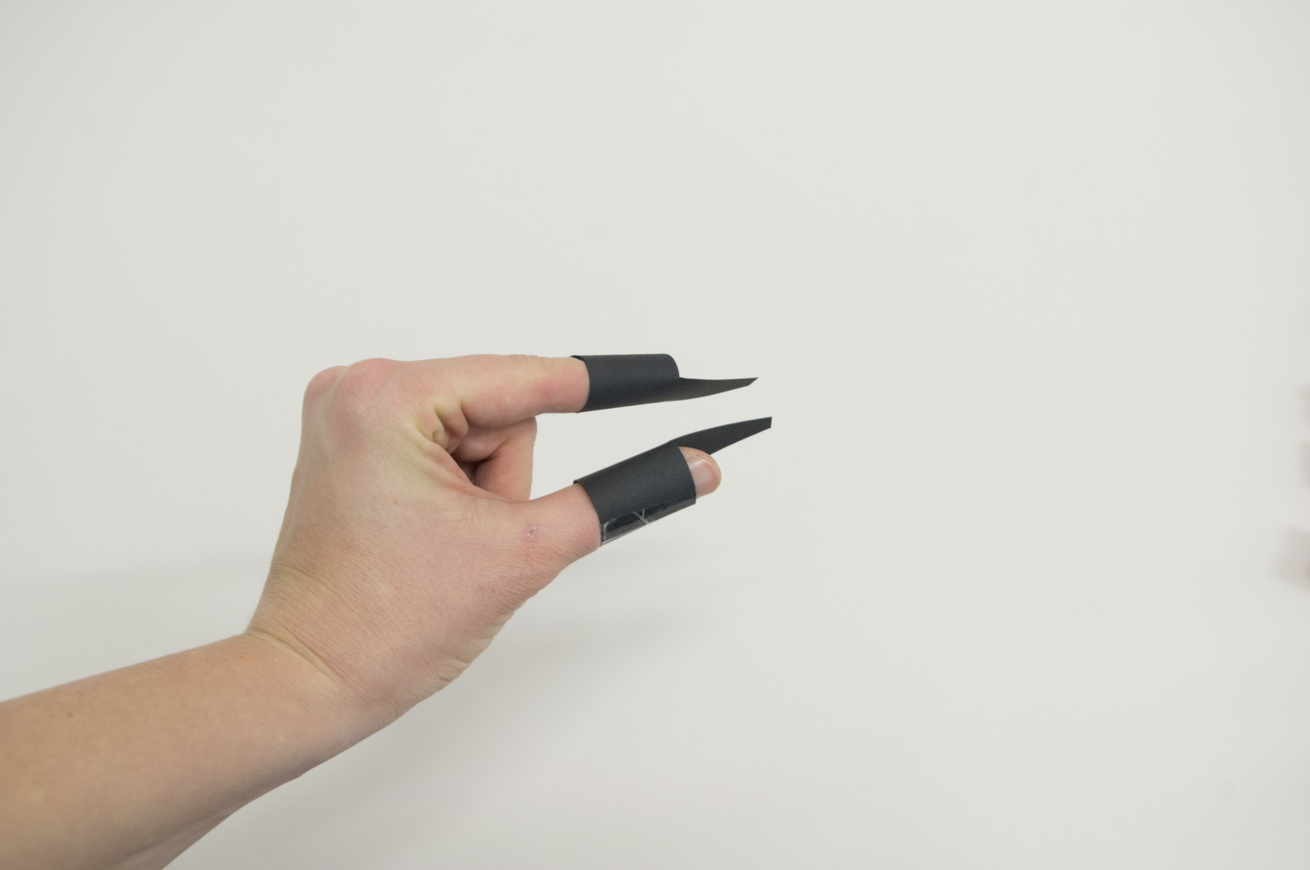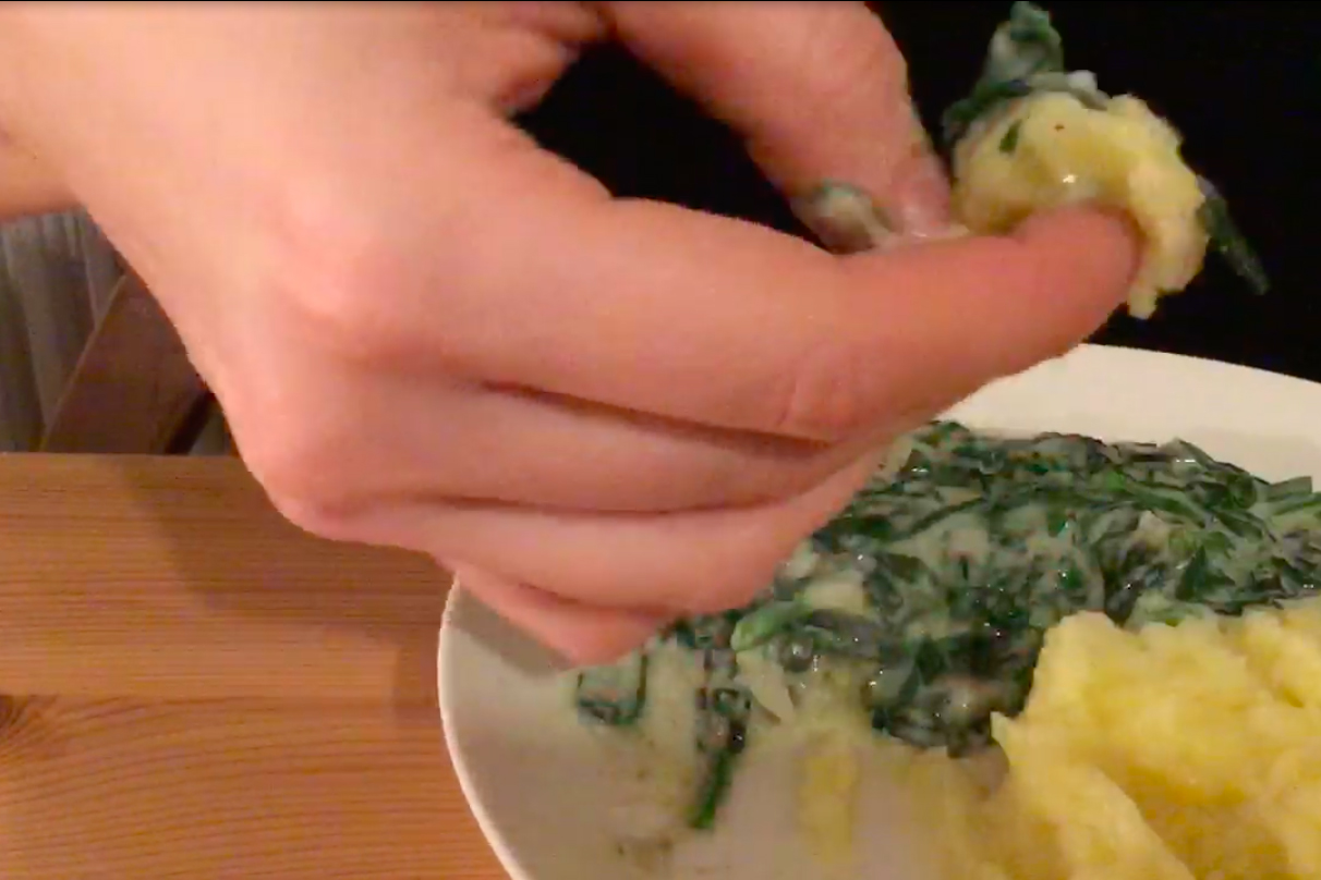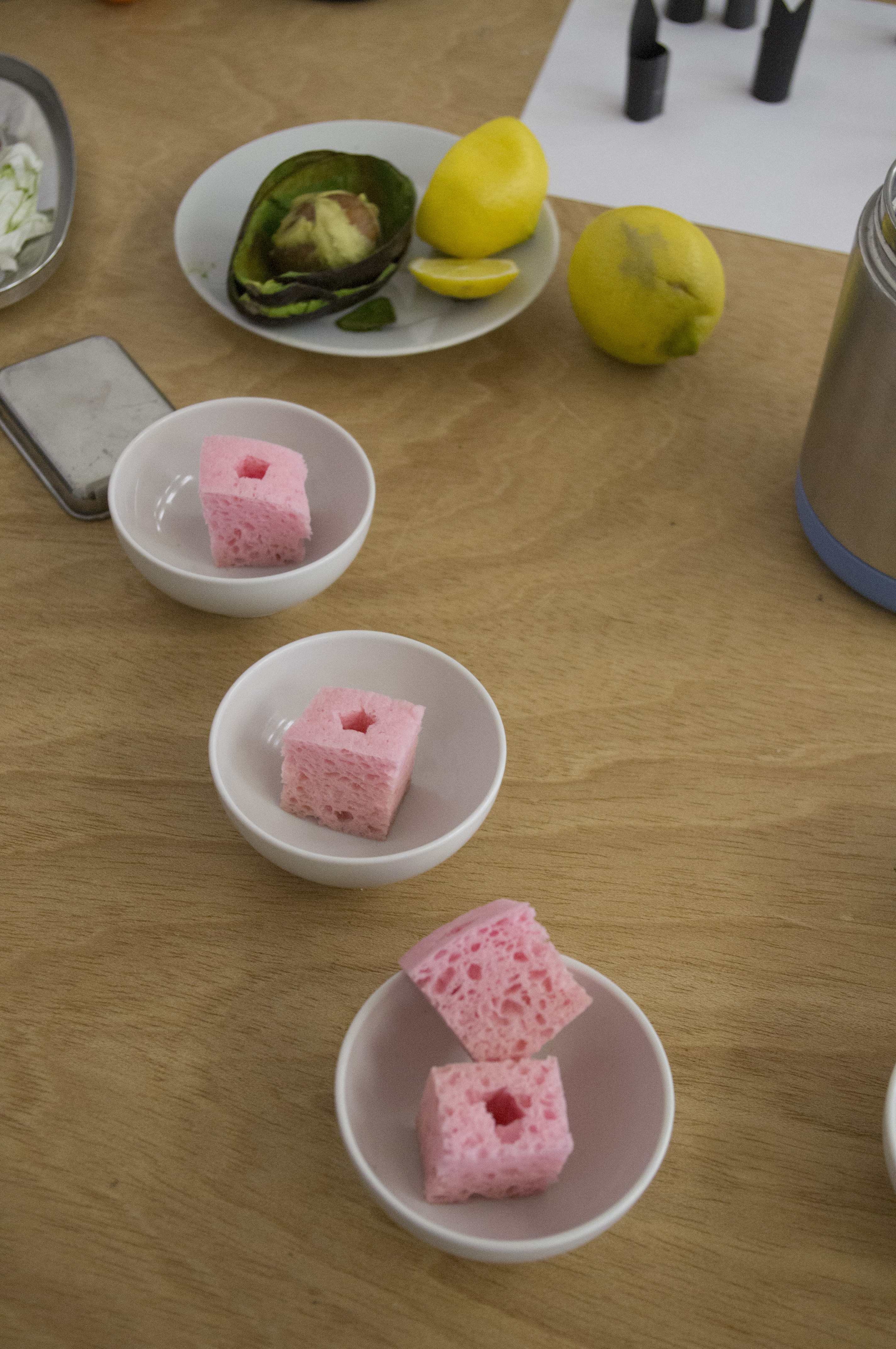 “Essen mit Essen” heißt Werkzeuge aus Essen herzustellen, die Teil der Mahlzeit werden, wodurch man genau gesehen eigentlich doch mit den Händen isst. Mit den Händen essen, ohne das Gefühl zu haben, mit den Händen zu essen. Texturen sowie Oberflächen der Werkzeuge und Behältnisse spielen eine essentielle Rolle, damit die Erfahrung und auch das Geschmackserlebnis ein besonderes und positives werden. Ebenso wichtig ist die Handhabe der Utensilien – denn nur, wenn sie auch mindestens ebenso angenehm zu benutzen sind wie vergleichbare nicht essbare, sind sie eine Alternative zum bestehenden System.