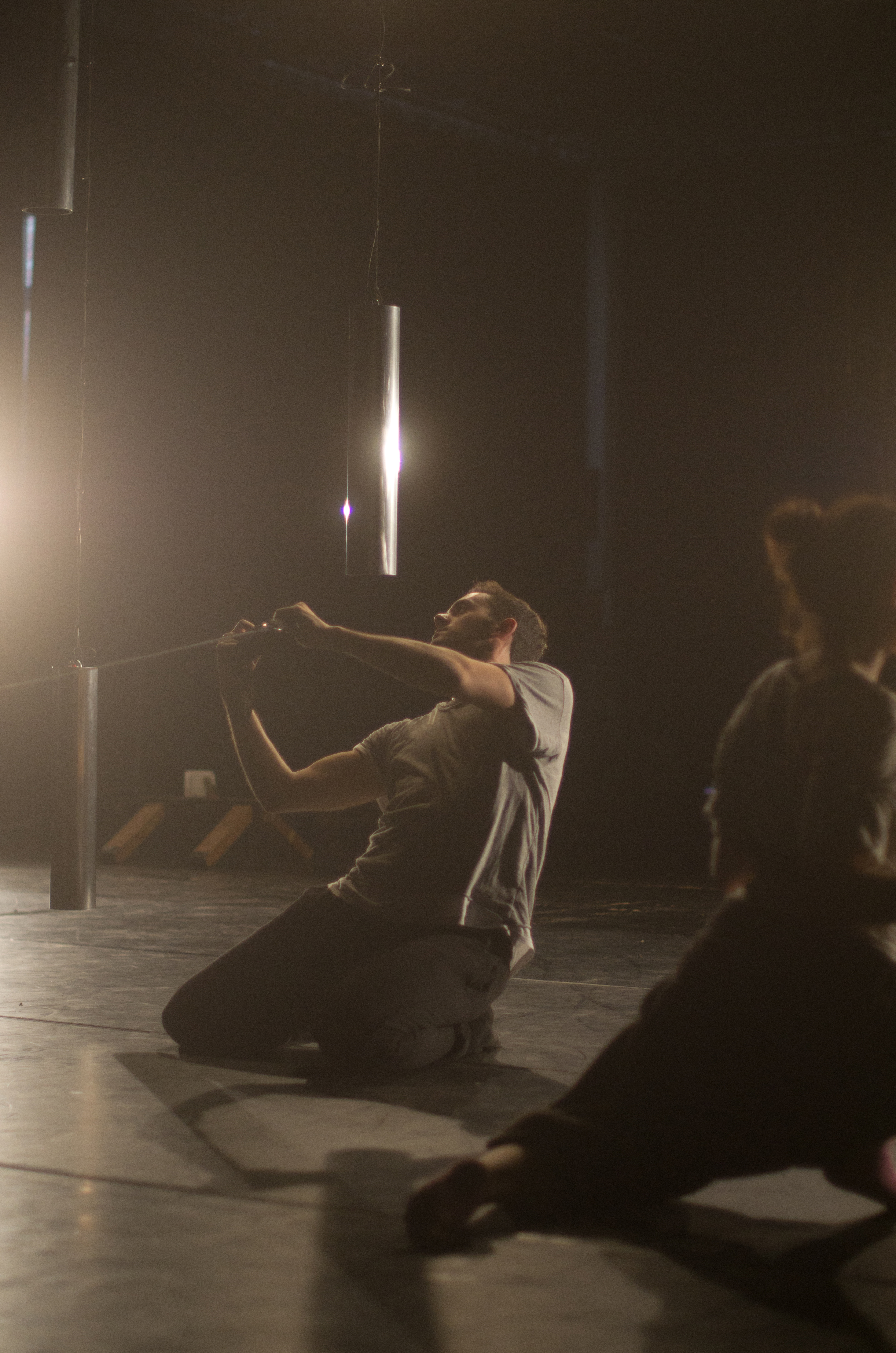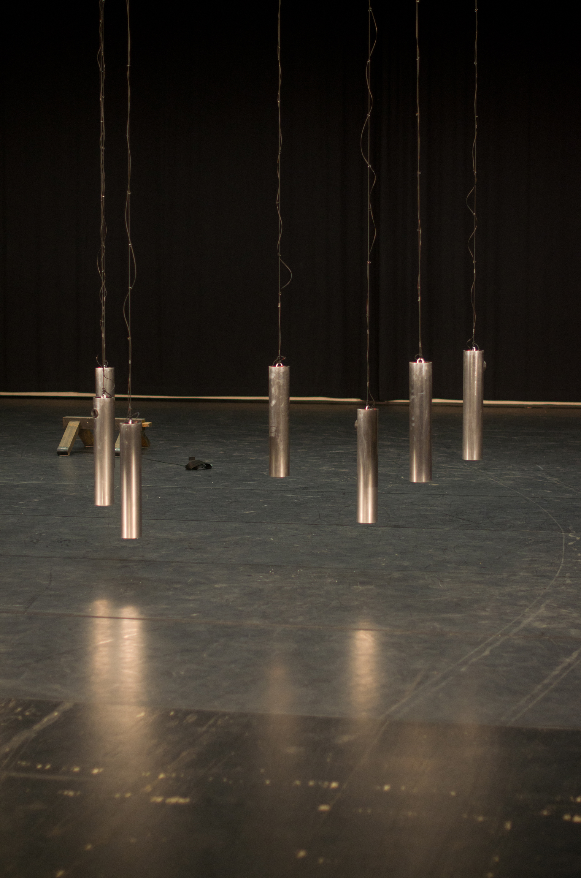 Klingende Stahlzylinder hängen von der Decke und werden über Gurte mit Seilen und Rollen durch die Luft bewegt. Sensoren innerhalb der Elemente reagieren auf diese Bewegung und konstruieren Klänge in Echtzeit.