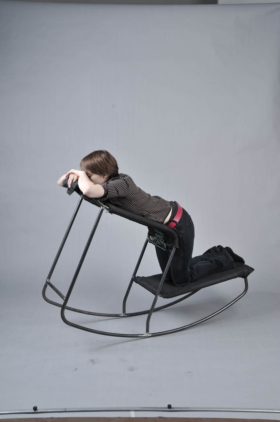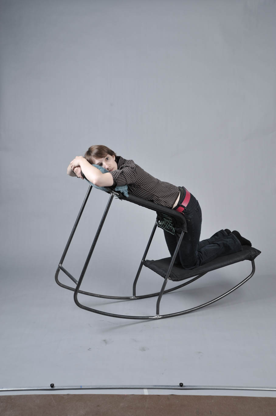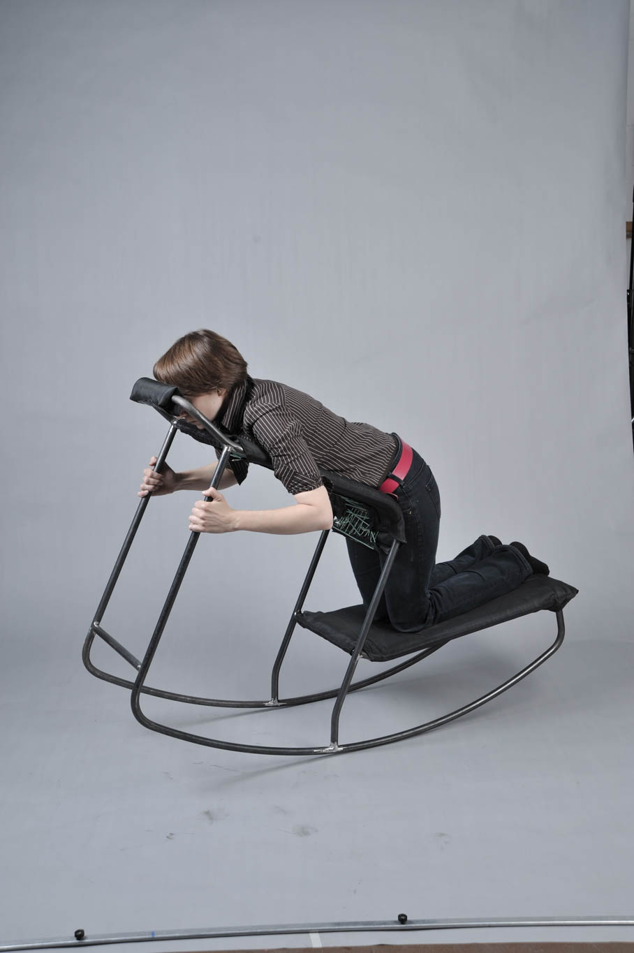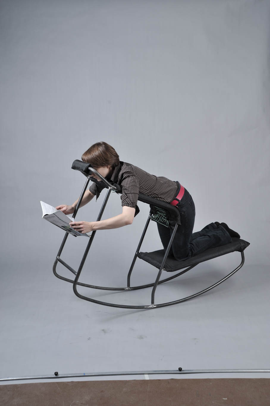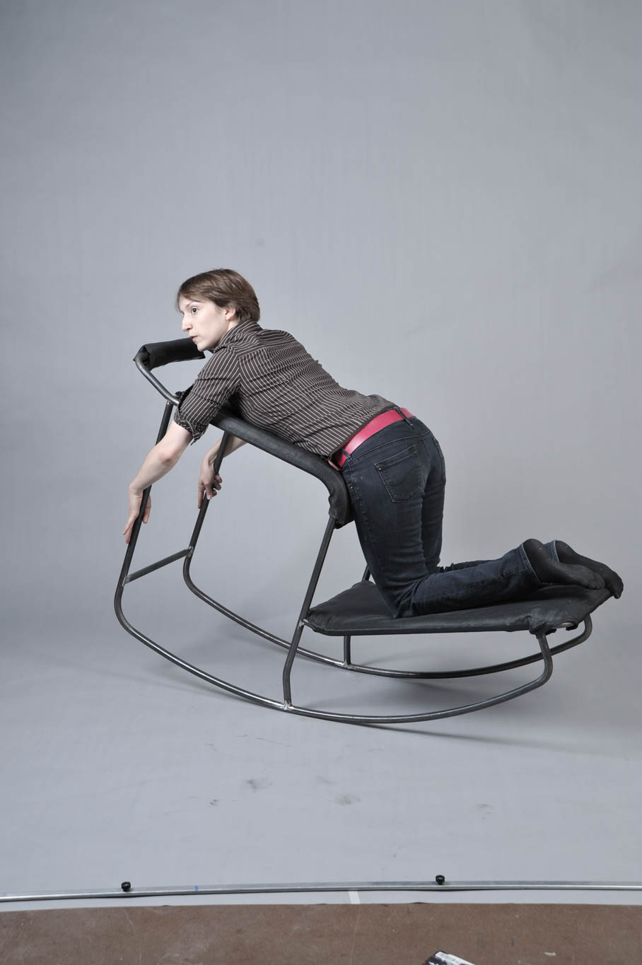 bauch•schaukeln [ von Marion Stahel ] Bauchlage (Abb.I Paul Gauguin, 1893: Otahi allein) gepaart mit Bewegung (Abb. II Gia- como Balla, 1913: Speed of a Motorcycle). – 1) Die Knie-Bauchlie- ge mit Kopfstütze ist eine Spezies der Bauchschaukel. – 2) Knie angewinkelt, Oberkörper nach vorne gebeugt. – 3) a) hin und her wippen und entspannen b) power napping c) die Stirn abstüt- zen und etwas lesen d) optional aufrecht sitzen e) ruhen, wip- pen, auflockern, hängenlassen, dösen – 4) Stahlrohrkonstruk- tion (Abb.III) mit a) Kufen b) gepolsterter Textilbespannung – 5) Entwicklungspotenziale a) sanfteres Wippen durch Schlauch- verkleidung der Kufen b) Kinderversion