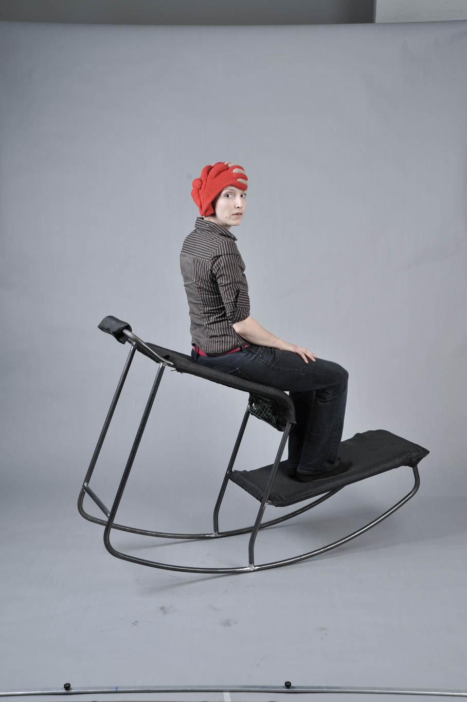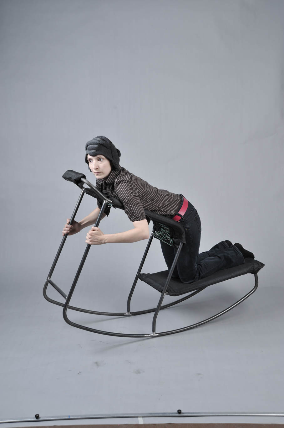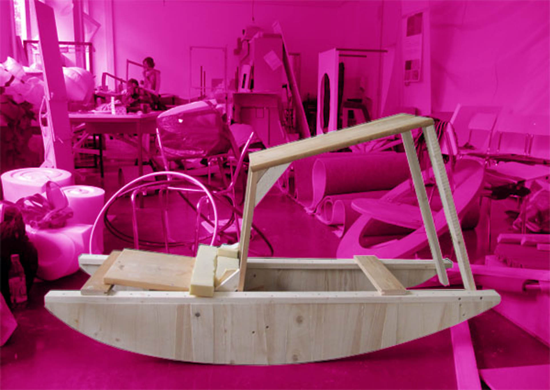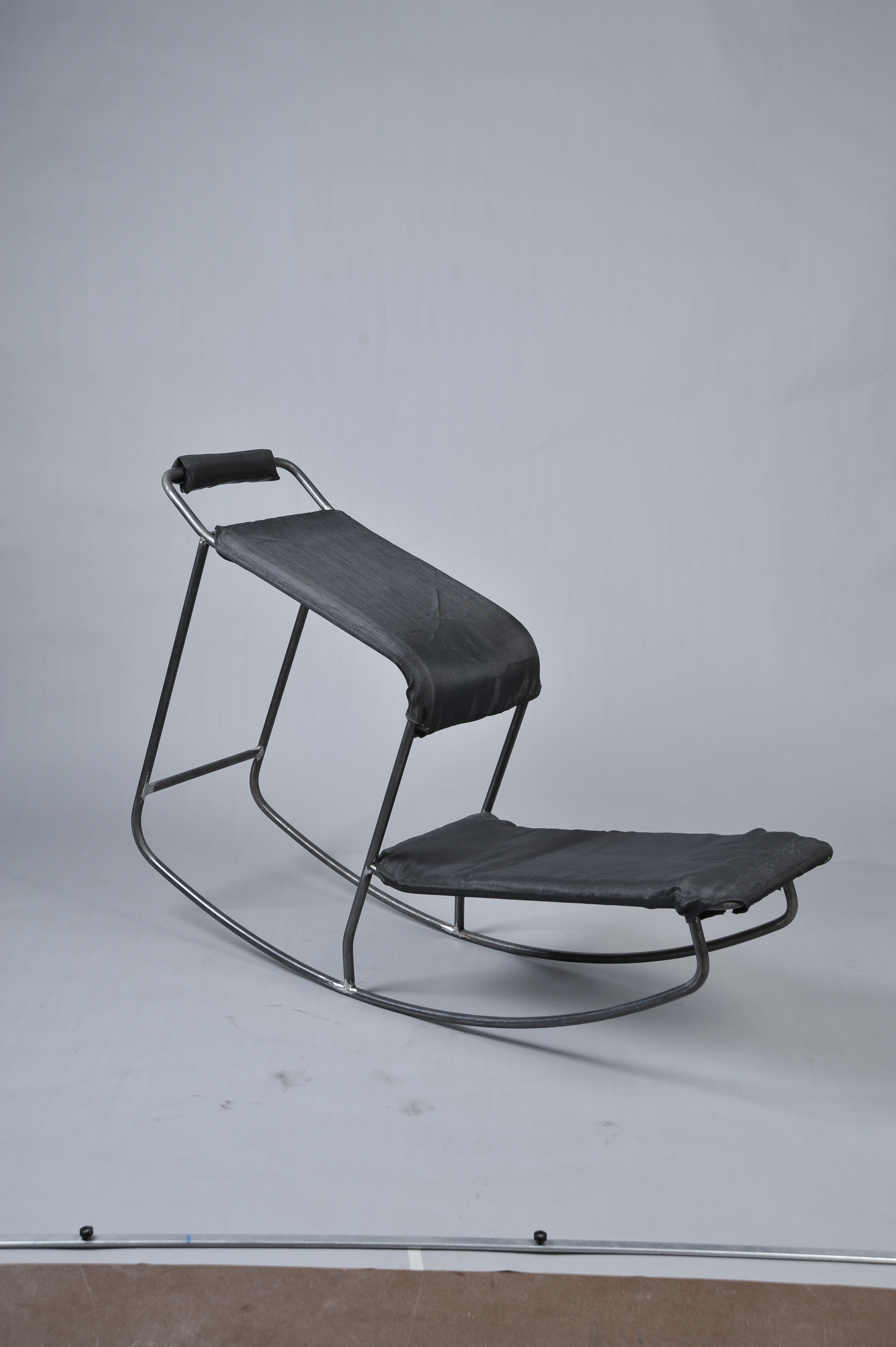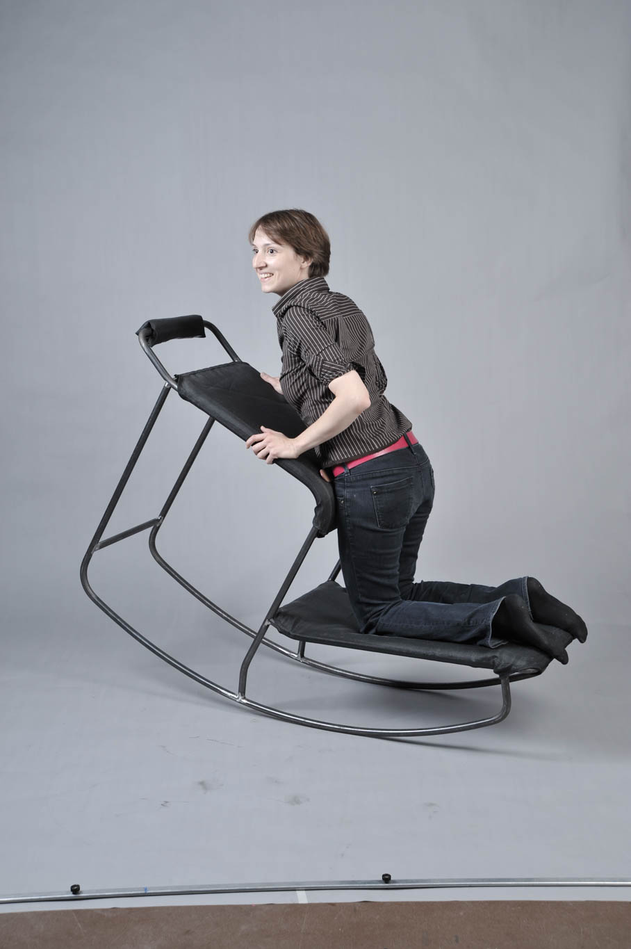 bauch•schaukeln [ von Marion Stahel ] Bauchlage (Abb.I Paul Gauguin, 1893: Otahi allein) gepaart mit Bewegung (Abb. II Gia- como Balla, 1913: Speed of a Motorcycle). – 1) Die Knie-Bauchlie- ge mit Kopfstütze ist eine Spezies der Bauchschaukel. – 2) Knie angewinkelt, Oberkörper nach vorne gebeugt. – 3) a) hin und her wippen und entspannen b) power napping c) die Stirn abstüt- zen und etwas lesen d) optional aufrecht sitzen e) ruhen, wip- pen, auflockern, hängenlassen, dösen – 4) Stahlrohrkonstruk- tion (Abb.III) mit a) Kufen b) gepolsterter Textilbespannung – 5) Entwicklungspotenziale a) sanfteres Wippen durch Schlauch- verkleidung der Kufen b) Kinderversion