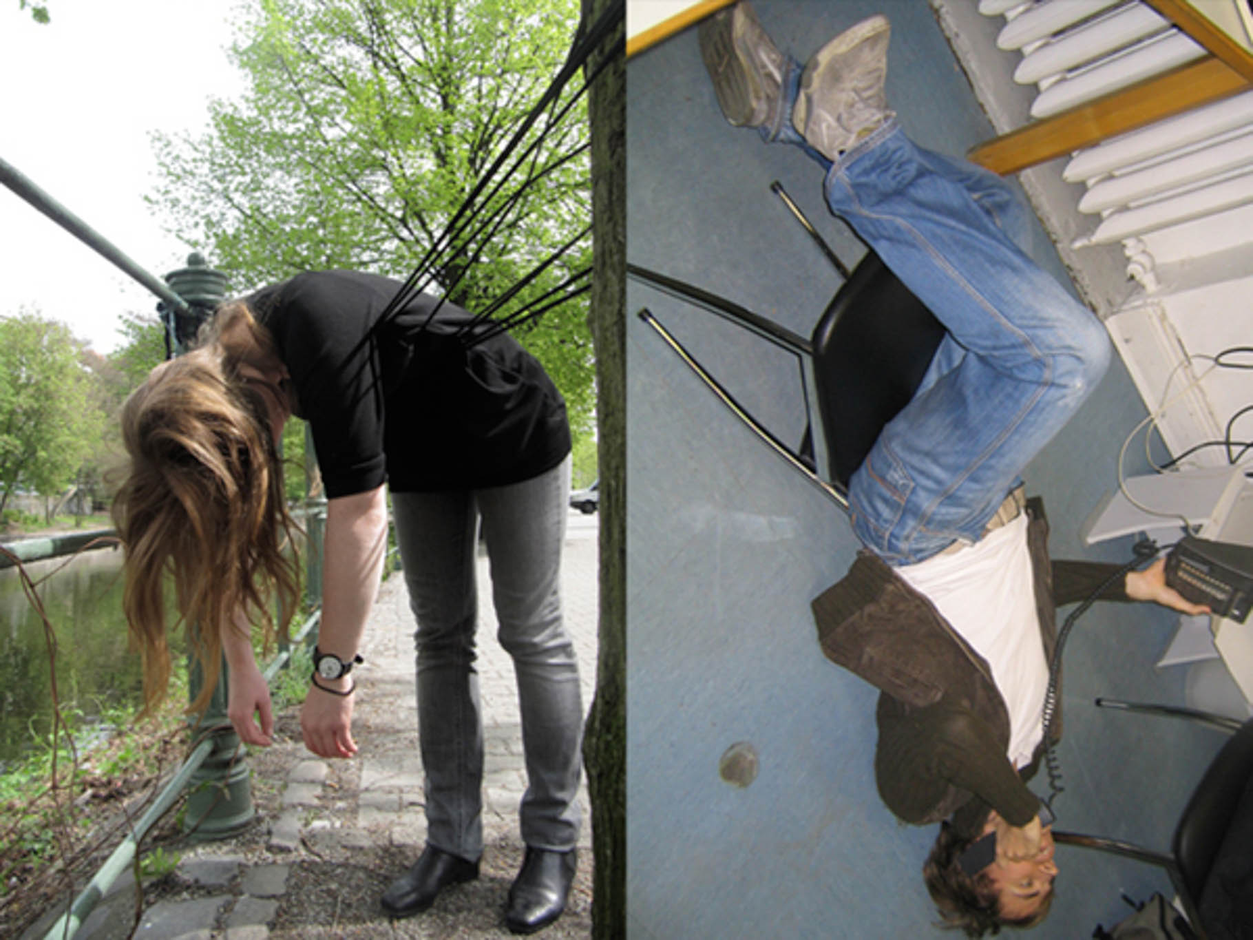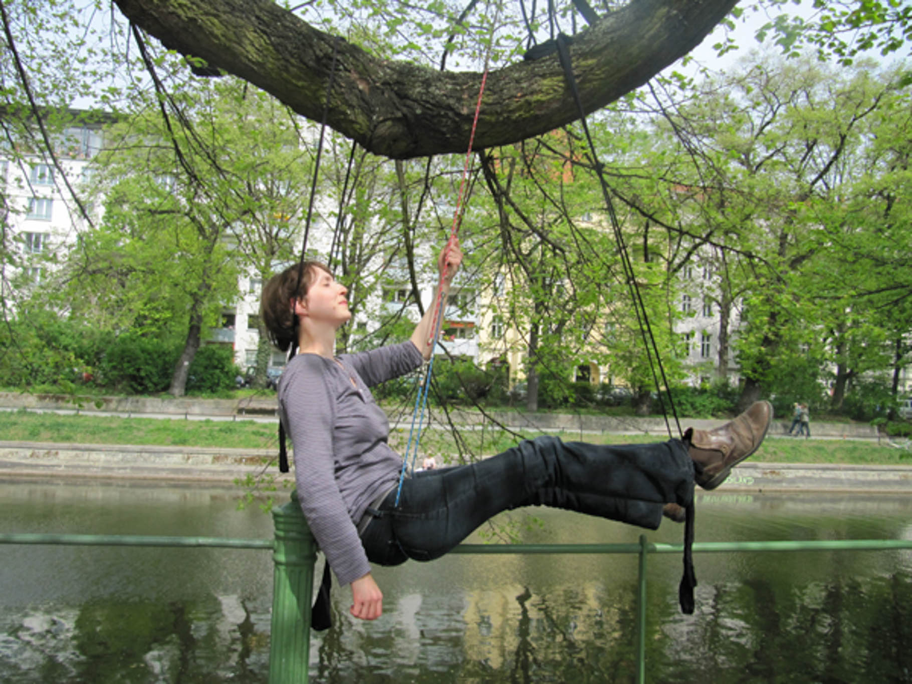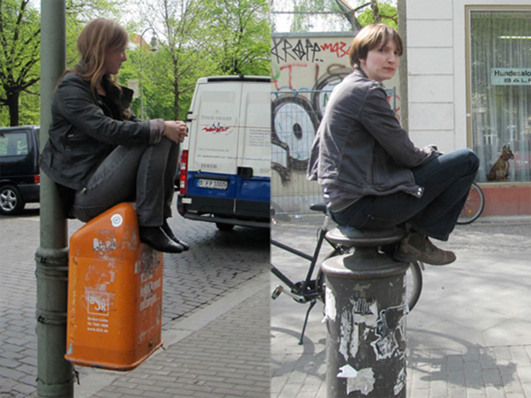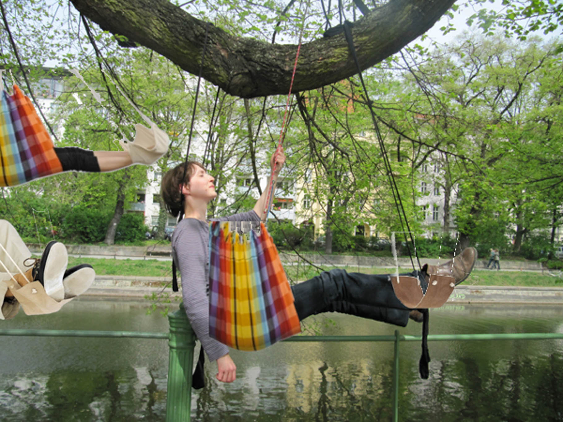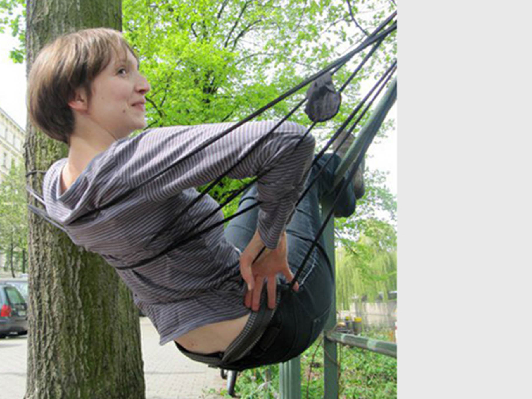bauch•schaukeln [ von Marion Stahel ] Bauchlage (Abb.I Paul Gauguin, 1893: Otahi allein) gepaart mit Bewegung (Abb. II Gia- como Balla, 1913: Speed of a Motorcycle). – 1) Die Knie-Bauchlie- ge mit Kopfstütze ist eine Spezies der Bauchschaukel. – 2) Knie angewinkelt, Oberkörper nach vorne gebeugt. – 3) a) hin und her wippen und entspannen b) power napping c) die Stirn abstüt- zen und etwas lesen d) optional aufrecht sitzen e) ruhen, wip- pen, auflockern, hängenlassen, dösen – 4) Stahlrohrkonstruk- tion (Abb.III) mit a) Kufen b) gepolsterter Textilbespannung – 5) Entwicklungspotenziale a) sanfteres Wippen durch Schlauch- verkleidung der Kufen b) Kinderversion