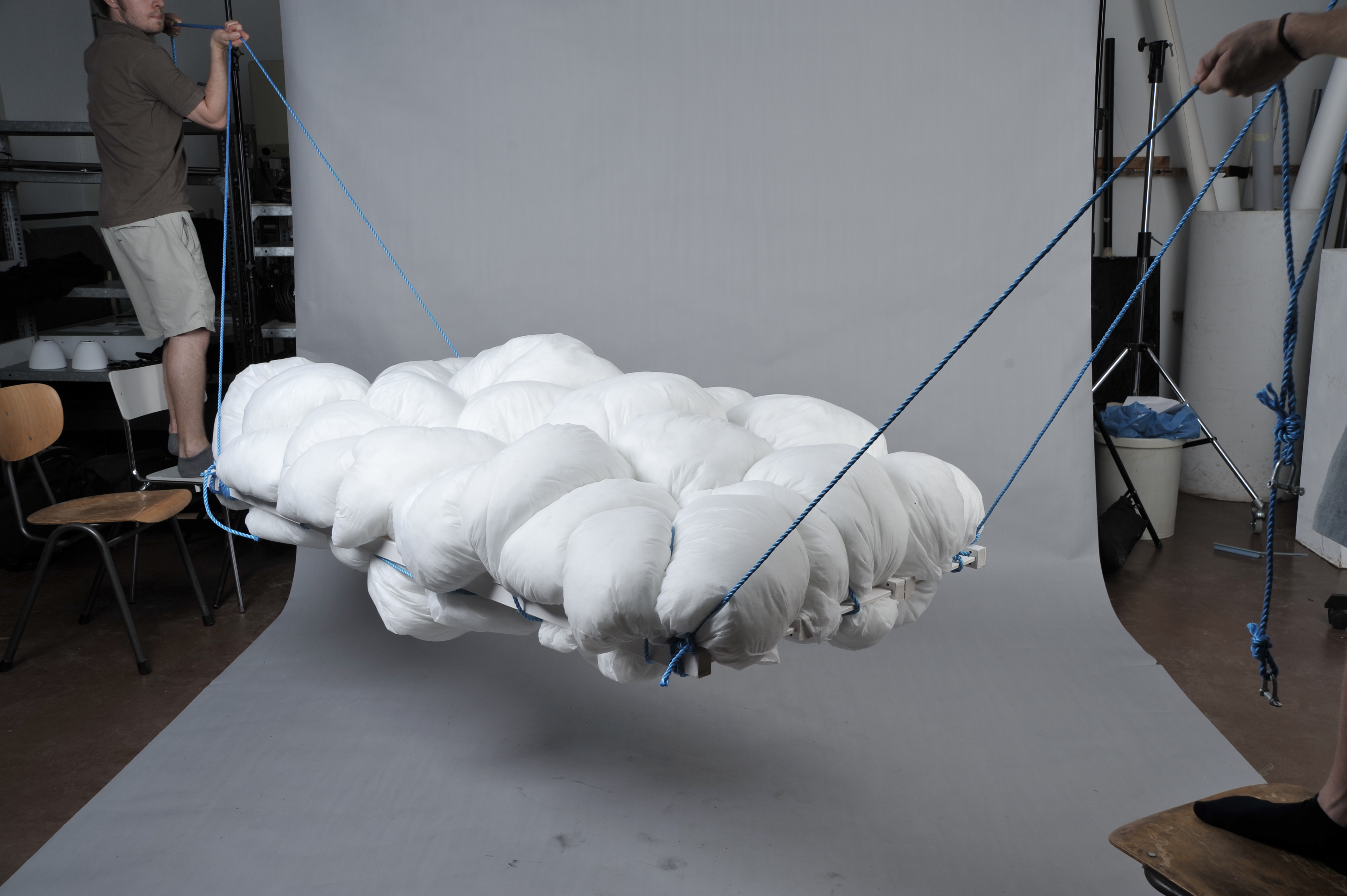 clouding [ von Maria Oggioni ] is when you think about a cloud, is when you think about the sensation to lie down on it, when you feel something fluffy, softy and swinging underneath your- self. –1)Beingonacloud,lightness.Itdoesnotofferaprecise pose, it is not a single position. It is mostlya particular state of being on something. – 2) Thinking in terms of softness and not in terms of formalism regarding the material: white pillows are kept together with one continuing rope only. In this way a clear shape is achieved that directly refers to the concept of the cloud: light, soft and fluffy.