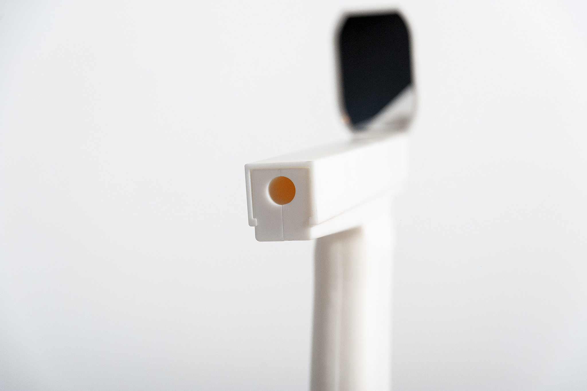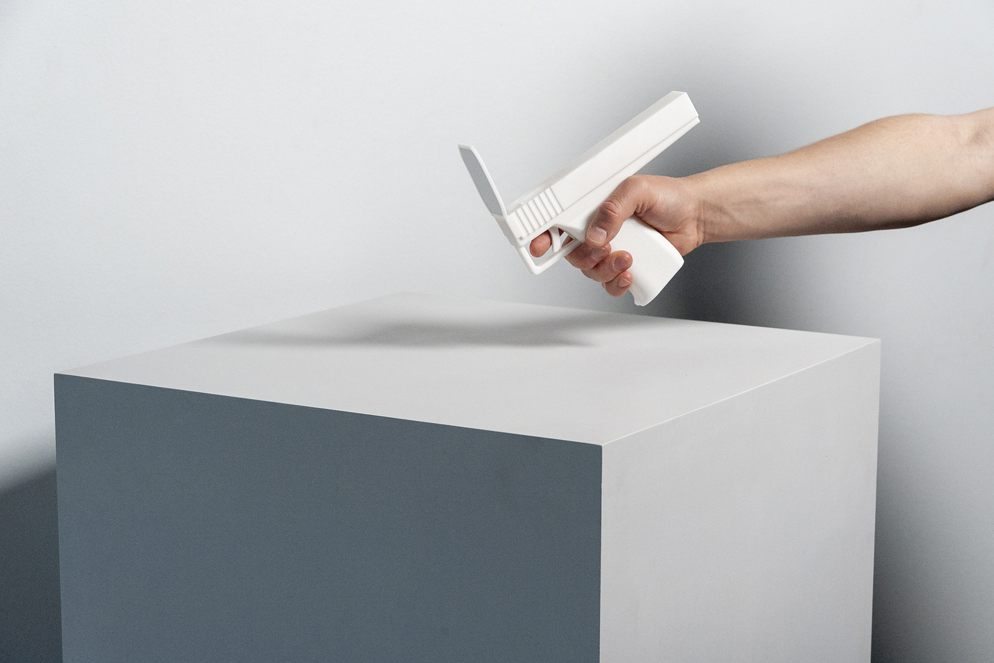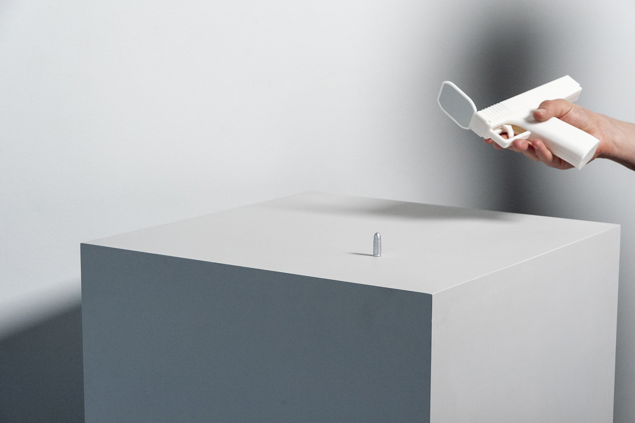 Right Angle Gun ist auf die Konfrontation mit dem Willen zu leben oder sterben fokussiert. Bei einem Schuss in den Kopf ist das Stammhirn das Ziel, da so ein eventuelles Überleben mit schweren Hirnschäden verhindert wird. Die rückwärtsgerichtete Pistole besitzt am Ende des Laufs einen Spiegel. Nur wenn man in der Lage ist sich selbst in die Augen zu schauen, hat man den passenden Einschusswinkel gefunden.