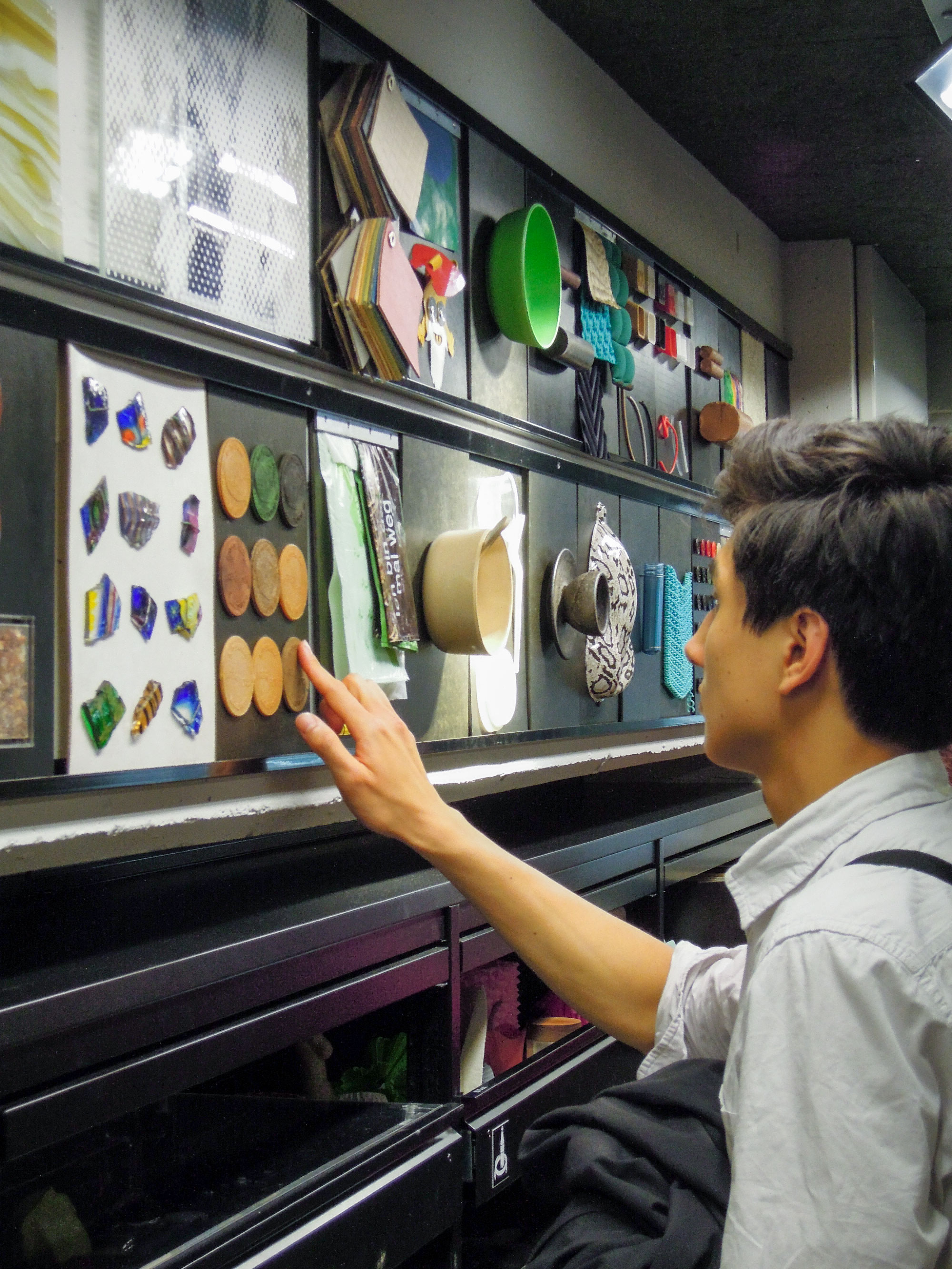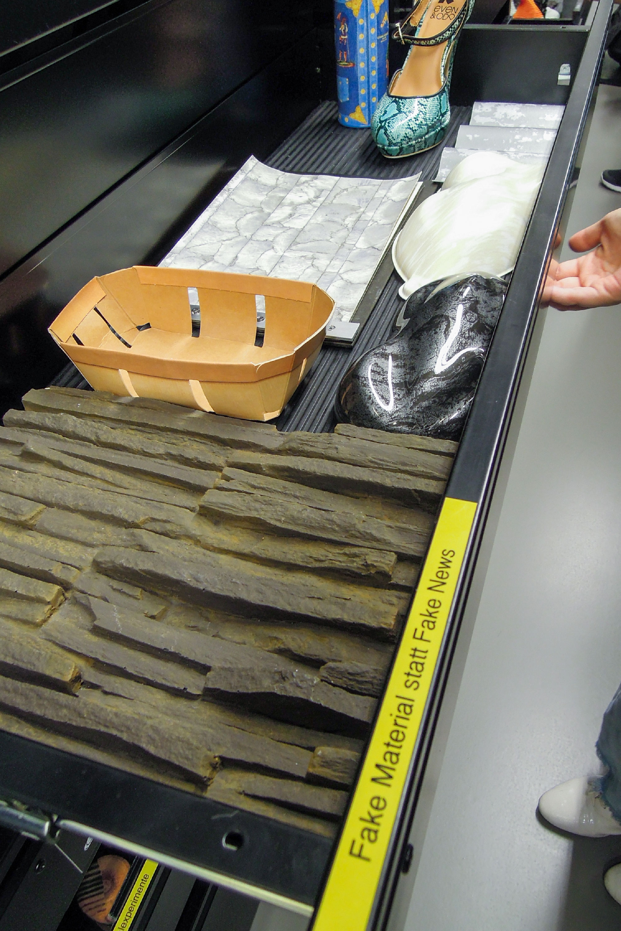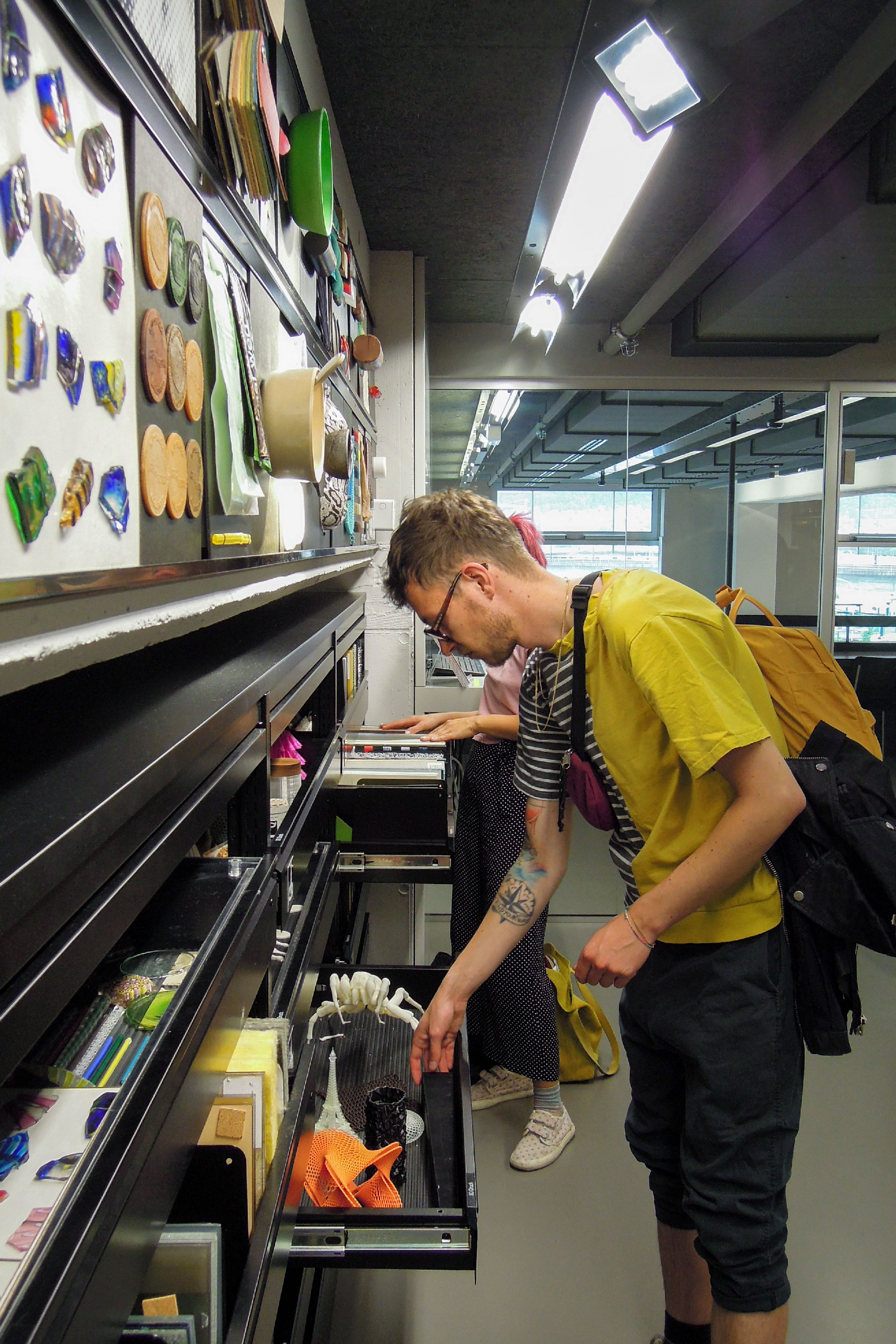 Das Schweizer Material-Archiv versteht sich selbst als Bildungsnetzwerk für Lehre, Forschung und Praxis. Es verfügt über eine umfangreiche Sammlung an Werkstoffen, welche es über eine online Datenbank weltweit zugänglich macht. Die Vermittlung des Wissens und der Materialien selbst, erfolgt über die physisch-erfahrbare Sammlung. Drei Standorte der Sammlung (das Gewerbemusuem in Winterthur, die ZhdK im Toni Areal Zürich und das Sitterwerk mitsamt der Kunstgiesserei in St-Gallen) besuchten wir im Rahmen des Entwurfsprojekts, um die Vielfalt und Anziehungskraft die diese Sammlung auf Gestalter jeglicher Couleur ausübt selbst zu erfahren.