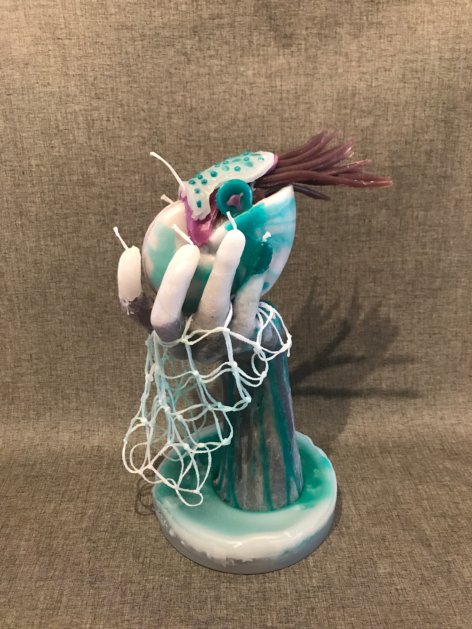 The project „Nautilus P.A.“ is not so much a further development of the Renaissance Nautilus goblets in terms of design, but a reflective work according to the aspects of contemporary development. The work aims to create a reference both to the history of the origin of the sumptuous goblets and to the anticipated development of the endangered species of the nautilus. The artisan appearance of the candle depicts an abstracted replica of the nautilus, caught by human hands with a fishing net.