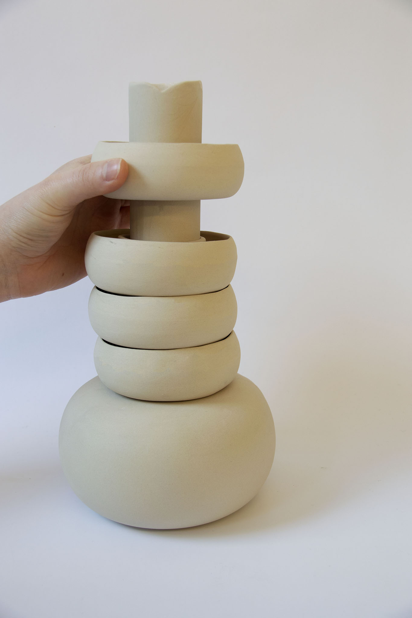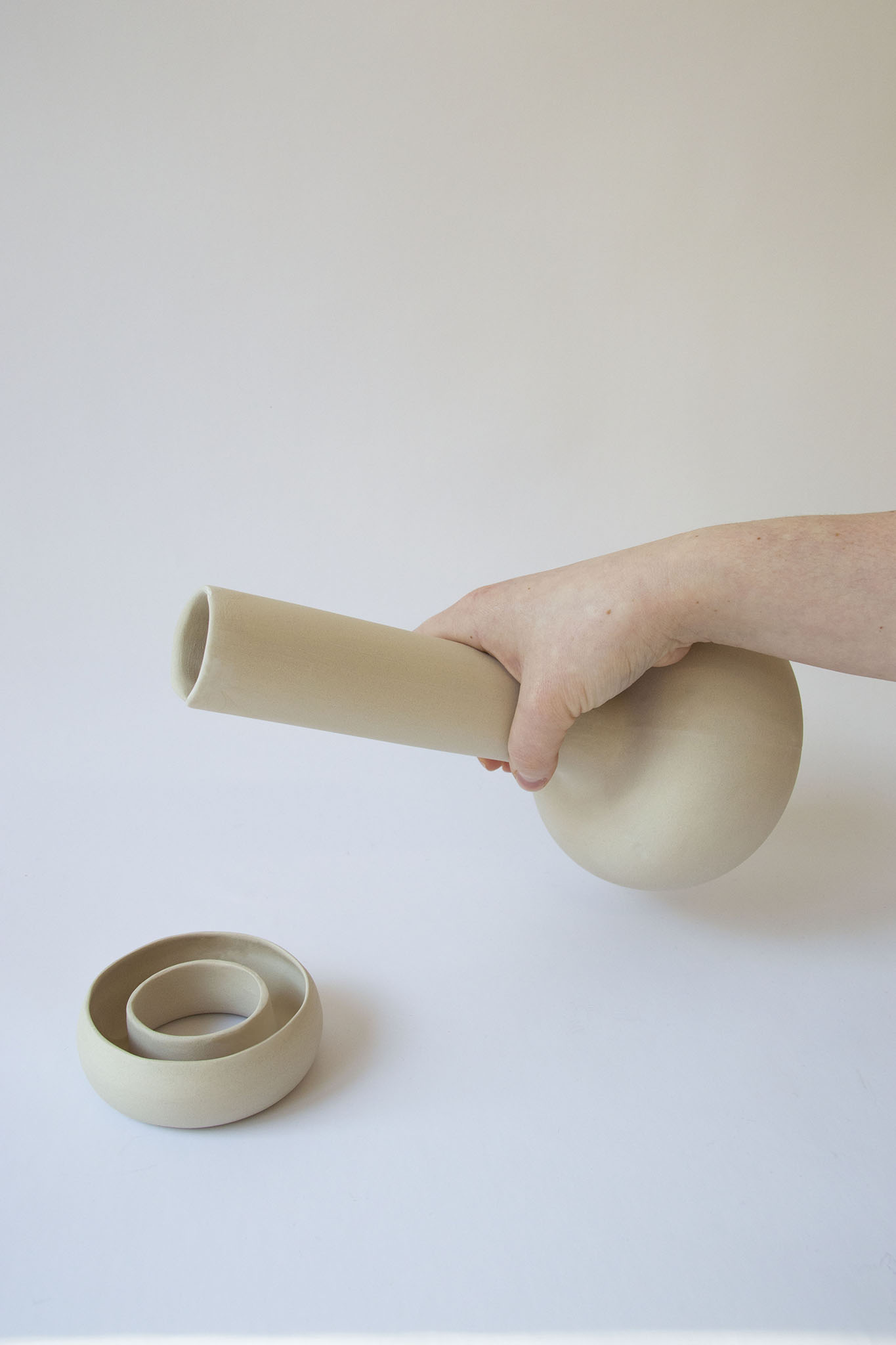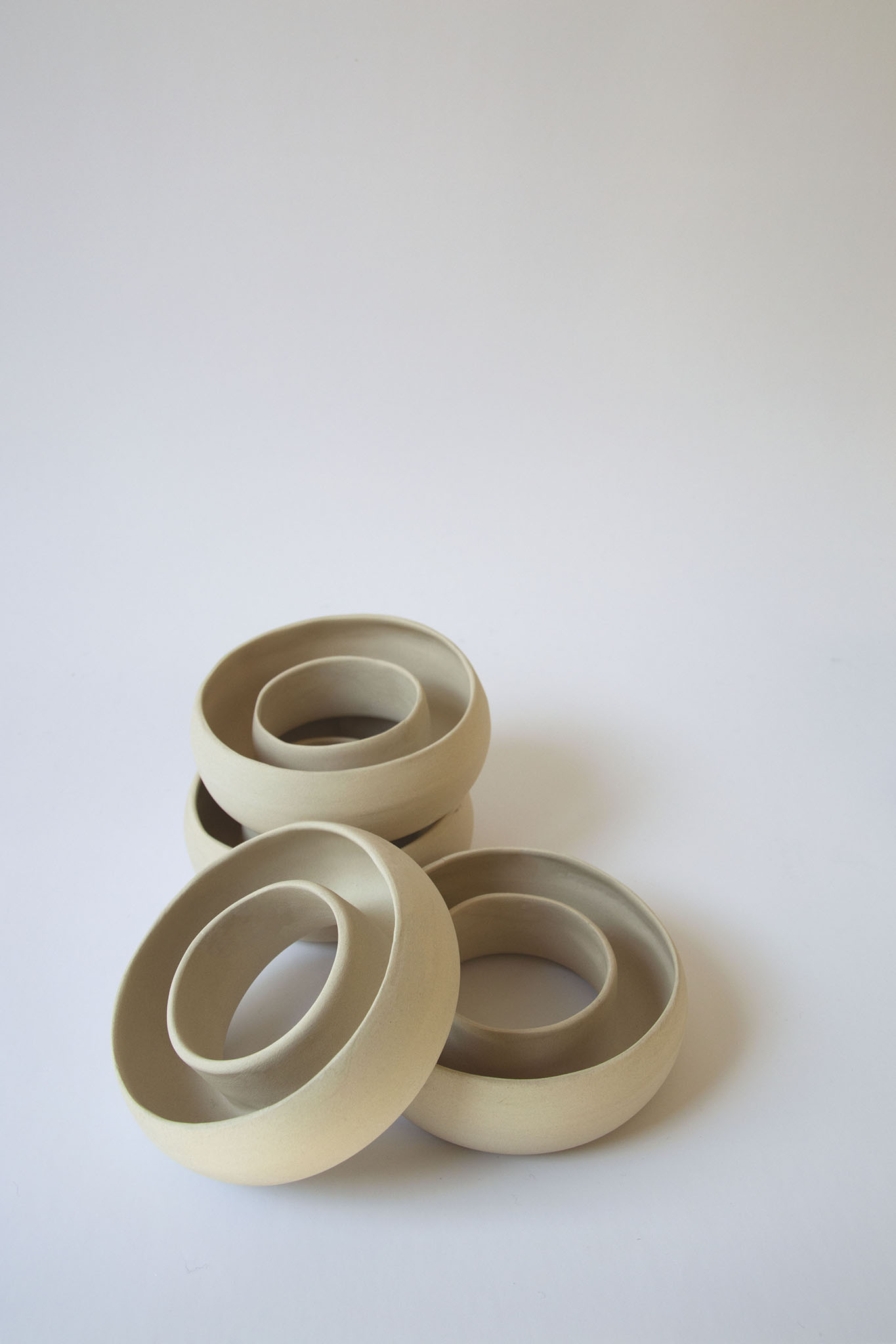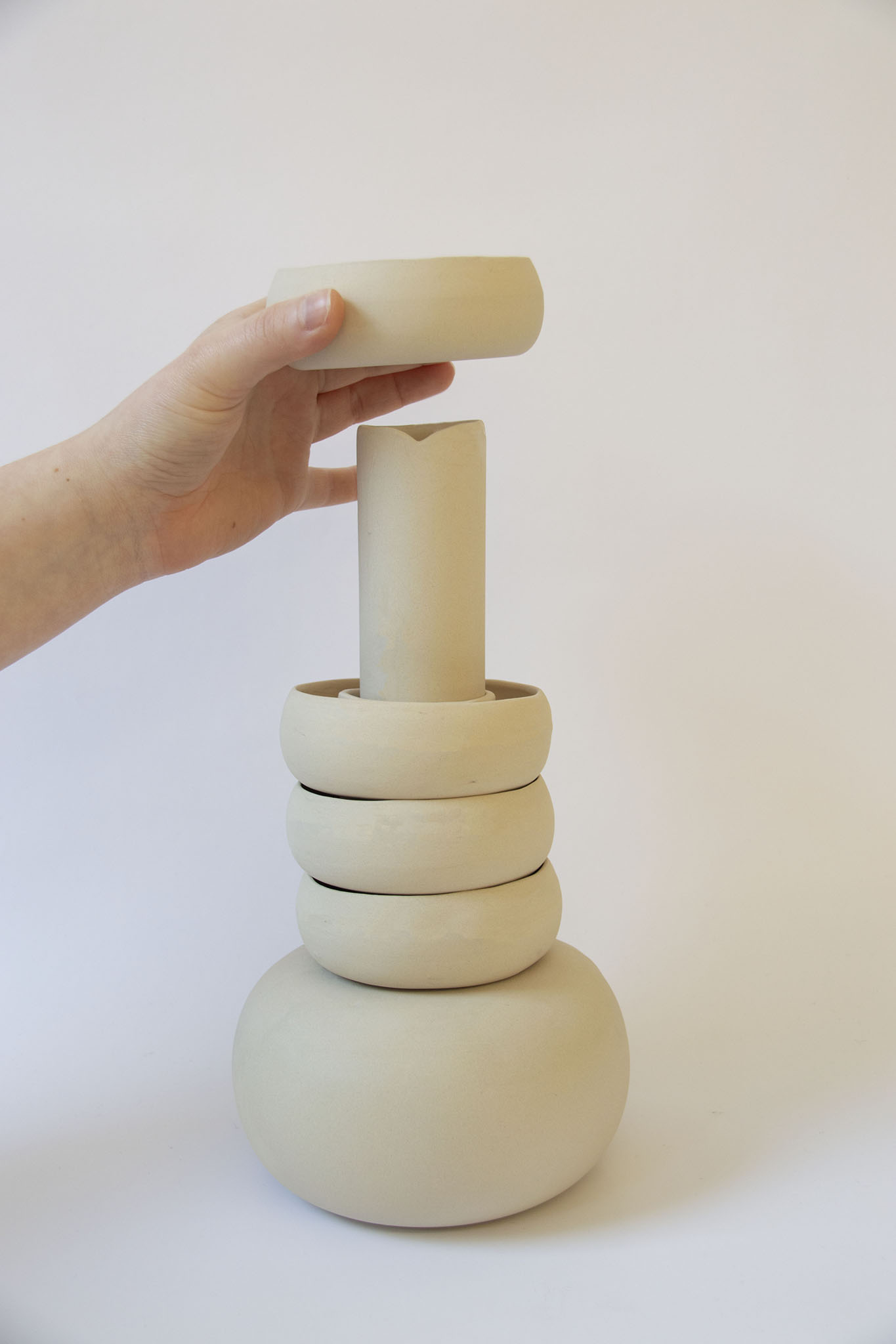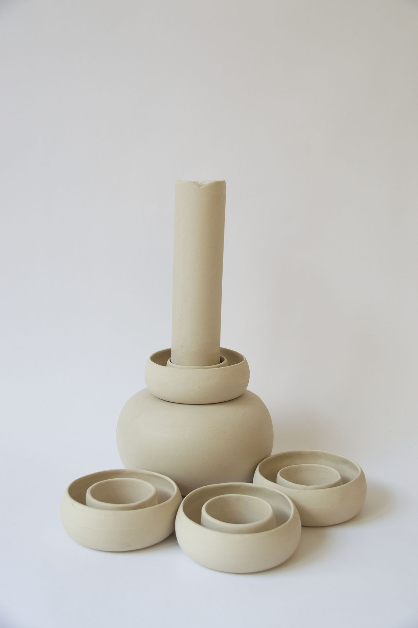 The Shabtu Objects are made out of stoneware and include one tall wine carafe and four rounded glasses. The Shabtu ritual is carrying the same principle as the Shabbat ritual-to distinguish between the weekend and the weekdays. The ritual starts when the carafe is filled with wine and all four glasses are placed upon the cylinder of the carafe. The wine needs to be poured into the glasses but in order to do so, all four glasses have to be placed first at the center of the table. The carafe is being passed among the participants and each participant puts one glass down. Then the carafe is being passed again and each participant is pouring the wine in a circular arm movement into the rounded hollow glass axis. After all glasses have been filled, the time comes for a personal moment of Shabtu. Each participant is holding the glass near to his mouth and nose, so he can smell and sense the wine, and takes a moment for pausing and reflecting.