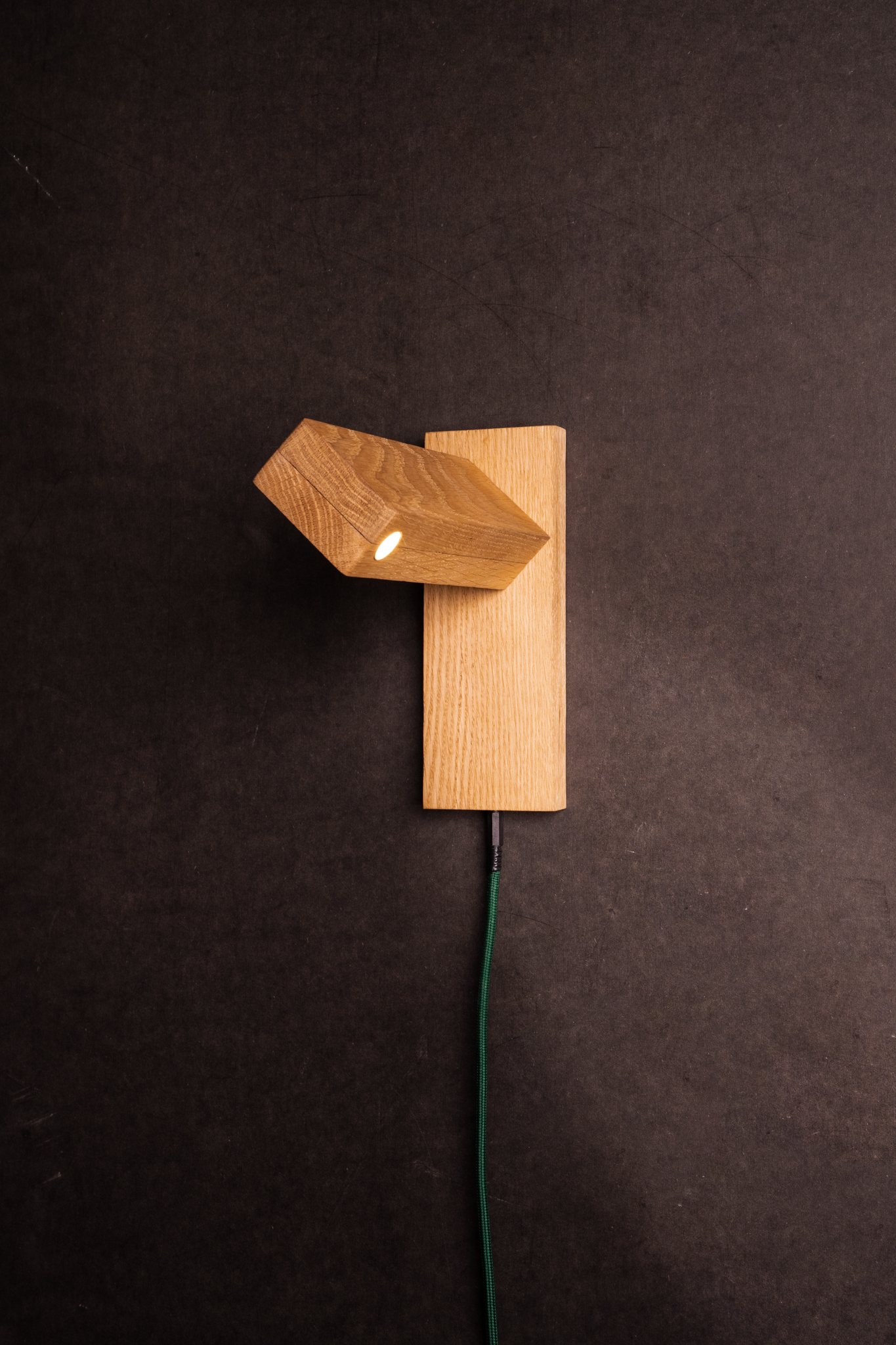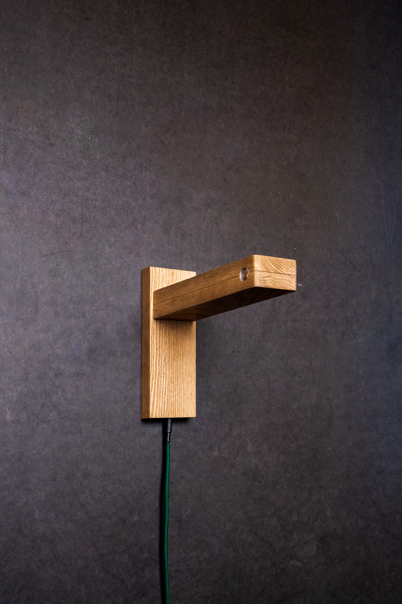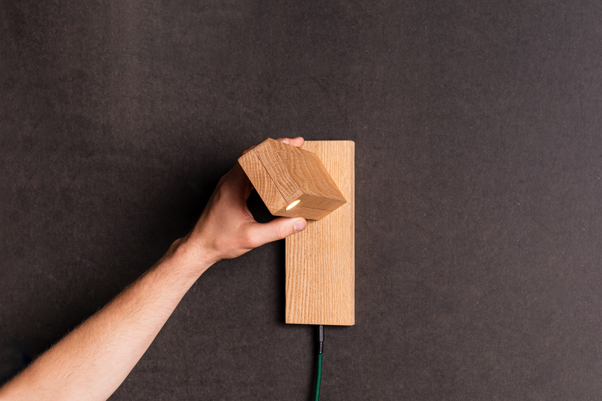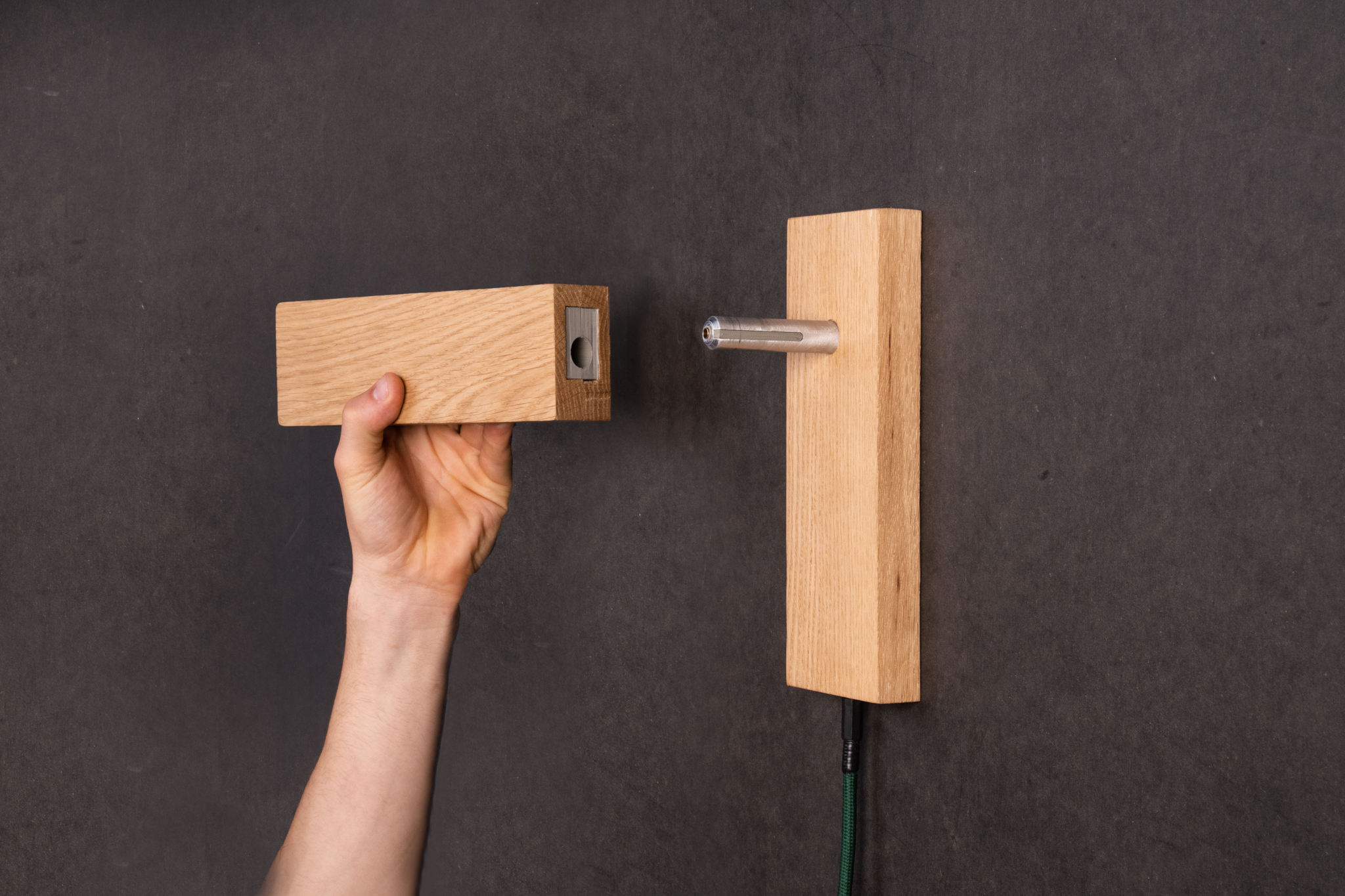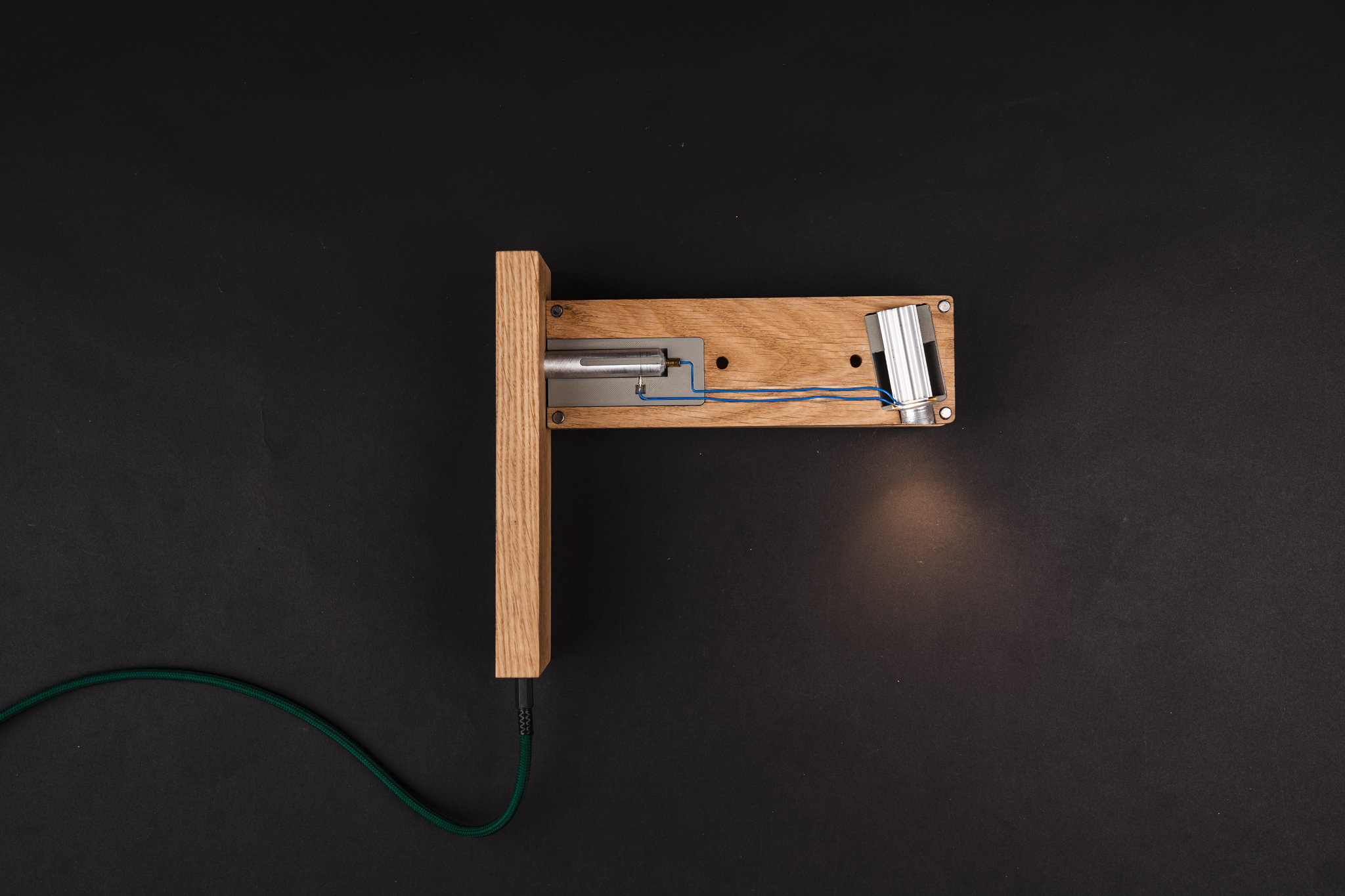 Eine Leuchte. turn&light verzichtet auf einen klassischen Schalter. Als Leseleuchte lässt sie sich in die gewünschte Position drehen und ist eingeschaltet, sobald sie ihre Waagerechte Stellung verlässt. Der Leuchtkörper lässt sich einfach von der Wandhaltung abziehen und aufstecken. Er lässt sich aus zwei spiegelsymmetrischen Hälften, welche aus Eichenholz CNC-gefräst gefertigt wurden zusammenfügen. Die Leuchtquelle besteht aus einer einzigen Hochleistungs-LED. Hierbei wird der Leuchtkörper über eine koaxiale Verbindung mit Strom versorgt. Die elektronische Masse wird unterbrochen, sobald der Leuchtkörper in die waagerechte Position gedreht wird. Damit wird sowohl eine direkte Beleuchtung nach unten, als auch eine indirekte Beleuchtung nach oben möglich. turn&light wurde in der Funktion auf das einfachste reduziert. Mit ihrer schlichten und natürlichen Erscheinung fügt sich die Leuchte angenehm in den Wohnraum ein.