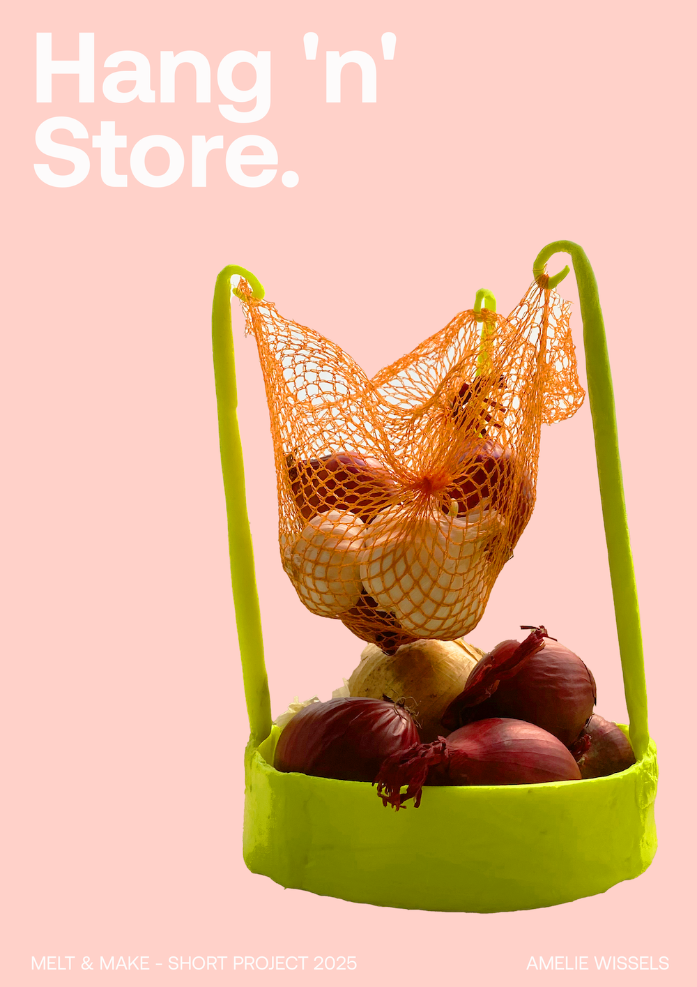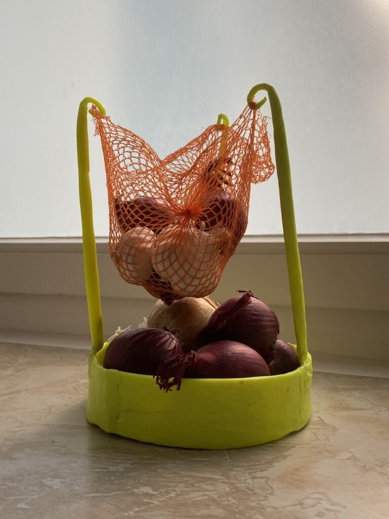 But in the end, the assignment was about creating something that improves your daily life. And with this bright yellow design, I can now store my onions and garlic in a fun and practical way!