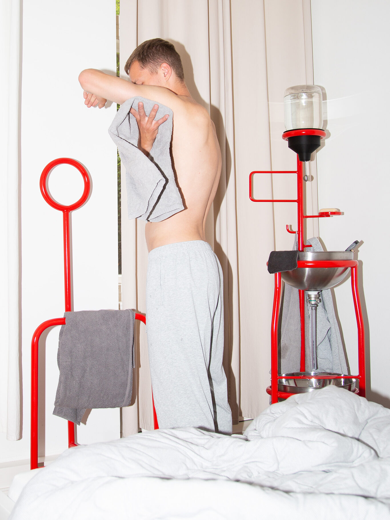 Statt 176 Litern Wasser werden nur 2 Liter benötigt. Entstanden ist eine Waschstation und ein stummer Diener, die ein neues Ritual der Körperpflege ermöglichen.