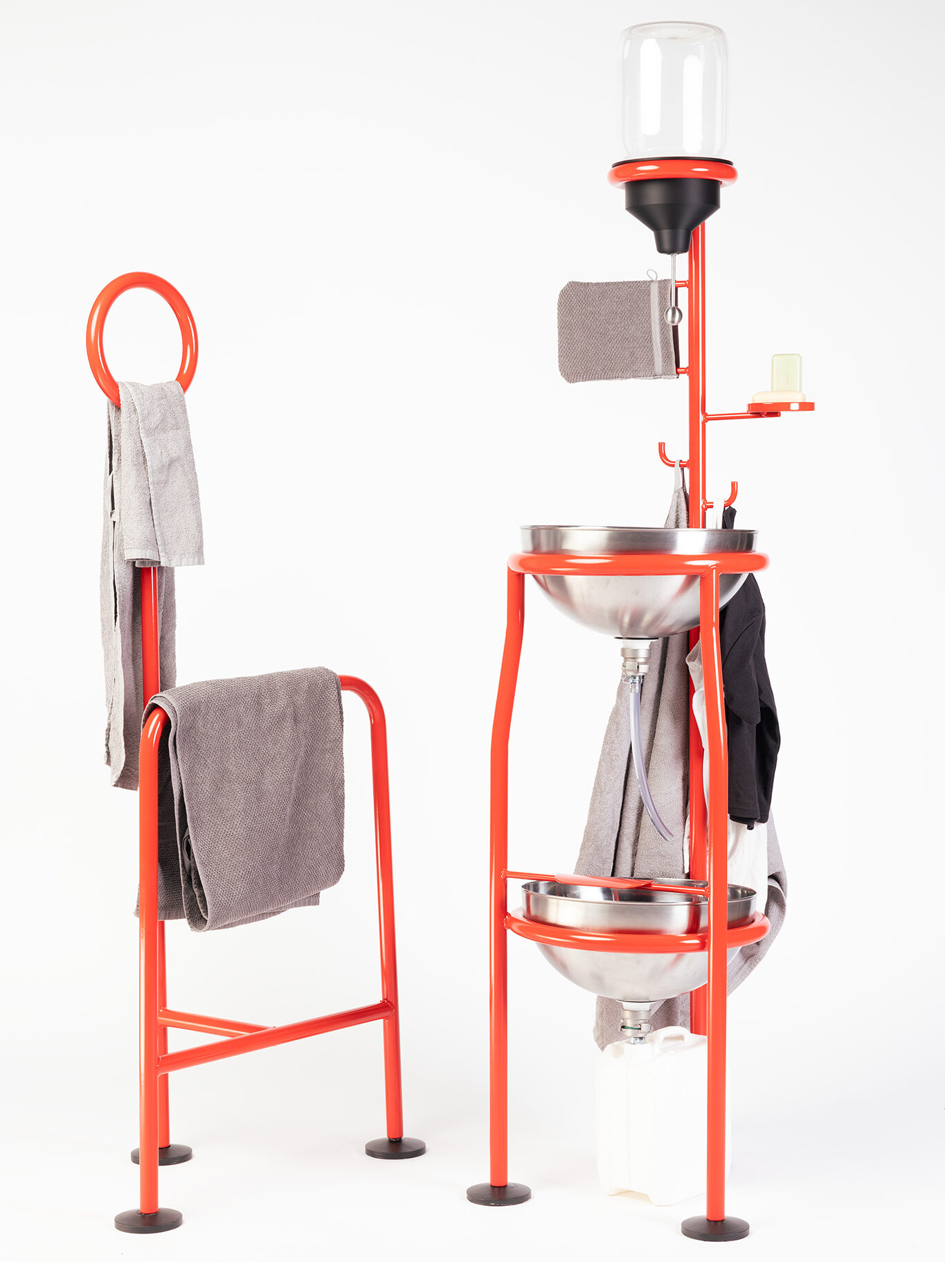 Instead of 176 liters of water, it requires only 2 liters. The result is a wash station and a valet stand, designed to enable a new ritual of personal care. The wash station allows for the targeted cleaning of key body areas, offers space for washcloth, soap, and towel, and includes a built-in washboard for rinsing.