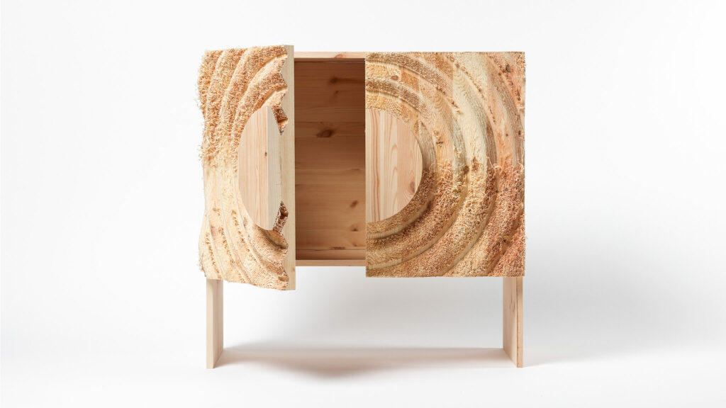 Instead of creating perfect, interchangeable surfaces, it uses the specific qualities of CNC milling to make the manufacturing process visible. The usual finishing step i s omitted, leaving a fringed texture of roughly milled spruce wood. The result is three objects: a sideboard with large surfaces and tactile handles, a side table with a wave shaped base, and a chair whose functional areas intentionally remain imperfect. This creates a new aesthetic that challenges expectations of perfect, industrially produced objects.