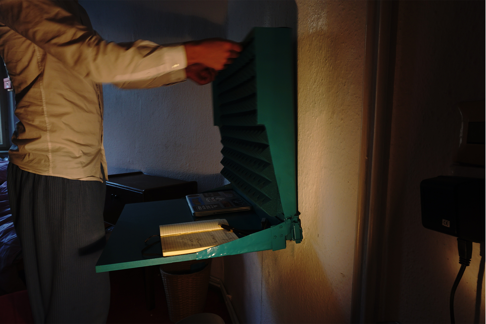 Capsule is a desk that can be folded against the wall but keeps everything on the surface as it was.
