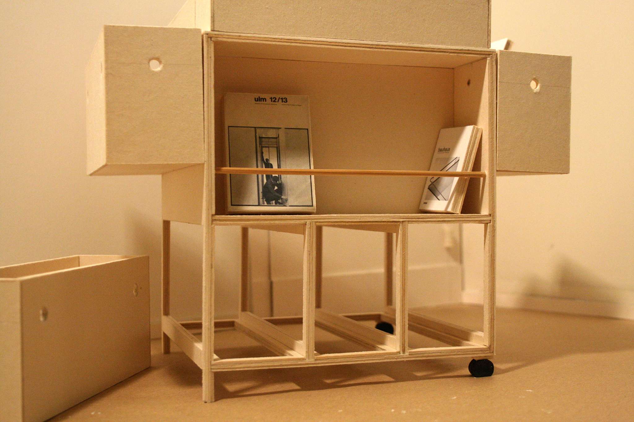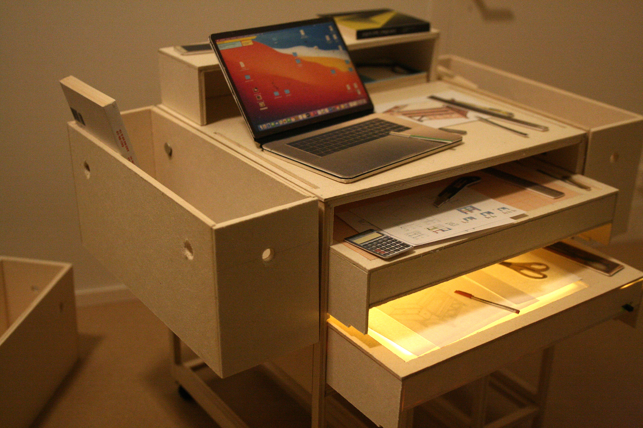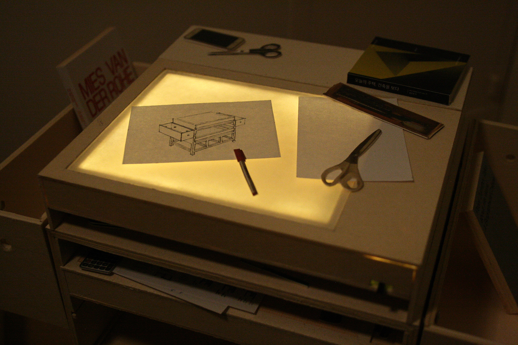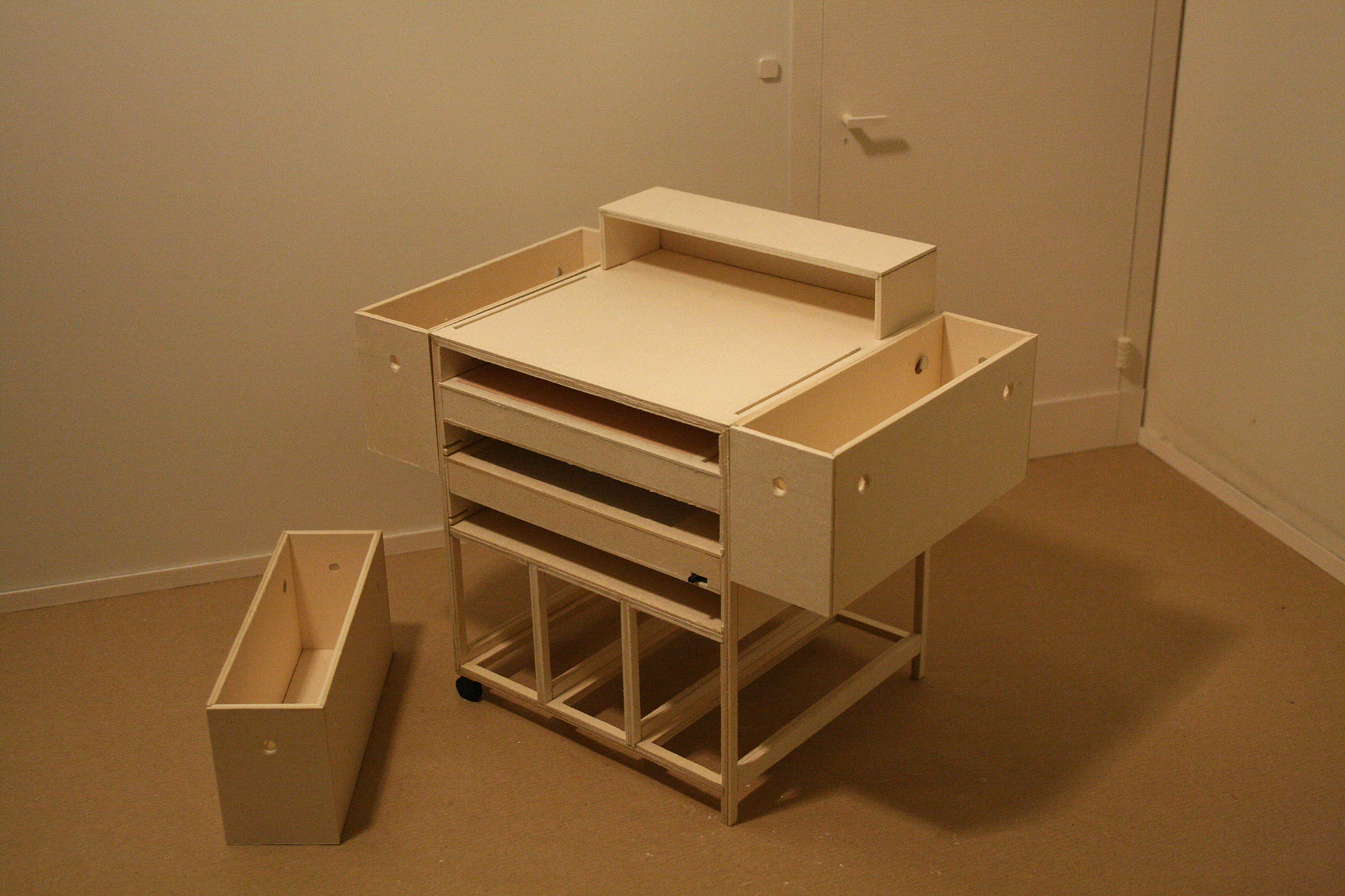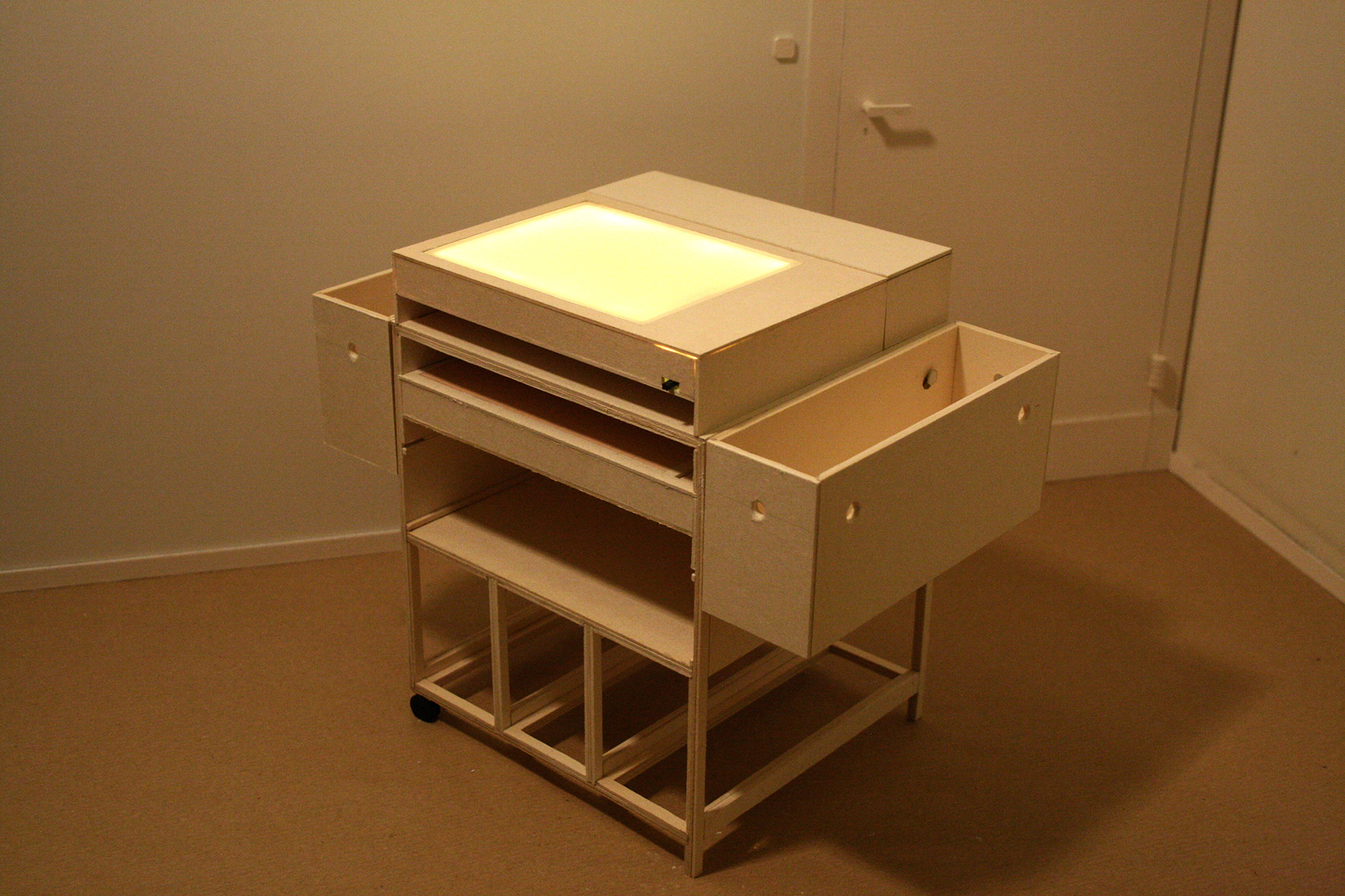 To solve this problem I have designed a work bench which covers all requirements for a comfortable workstation at home. Service Tray offers several table surfaces implicating different purposes. Whilst one surface is used for cutting, the second one contains lightbulbs inside which allows one for instance to copy sketches by using the back-lit surface. Due to the tray-mechanism the user can work on a project and easily pull out a second table surface to cover the current work and switch to an other project. The former work does not need to be displaced anymore.