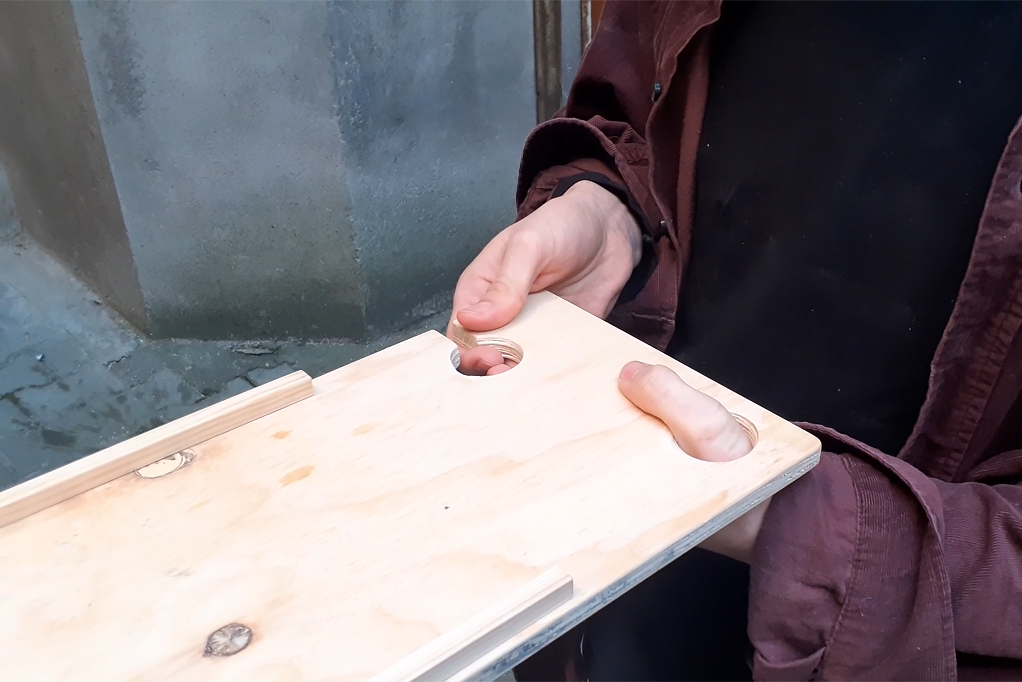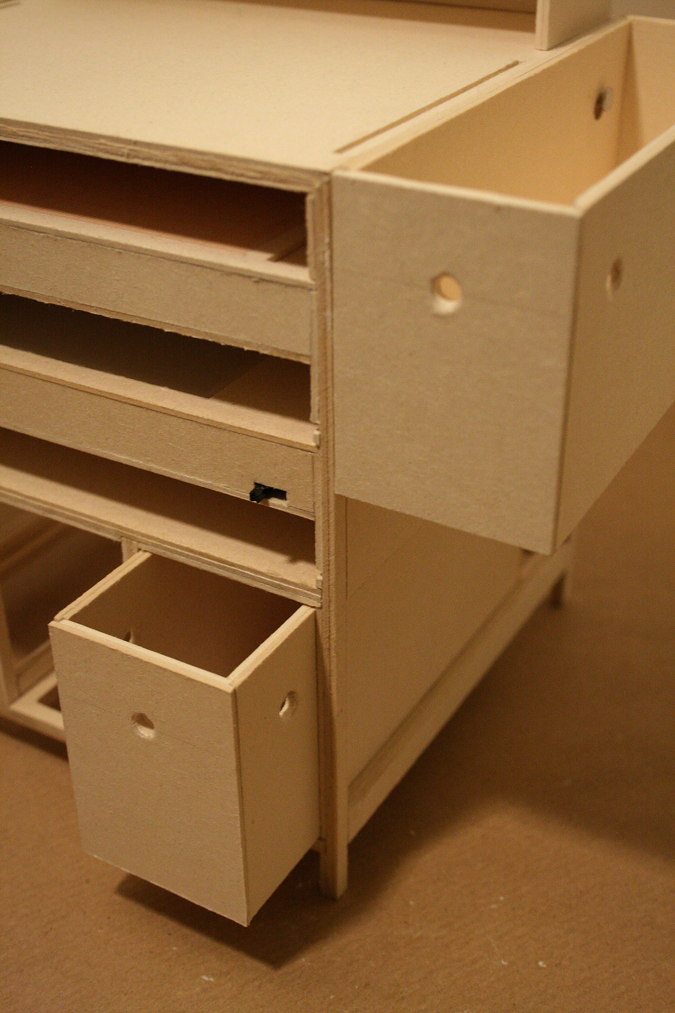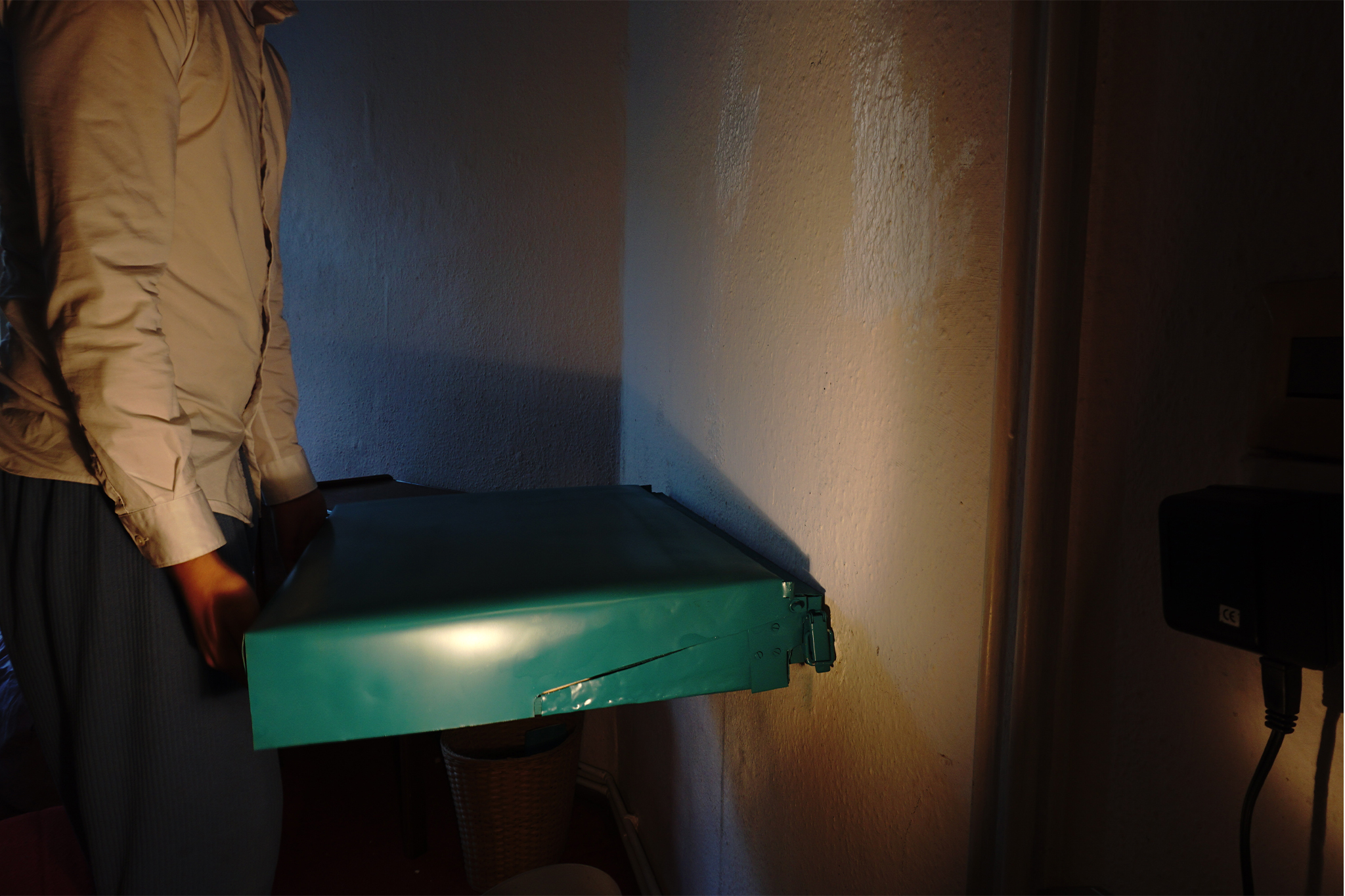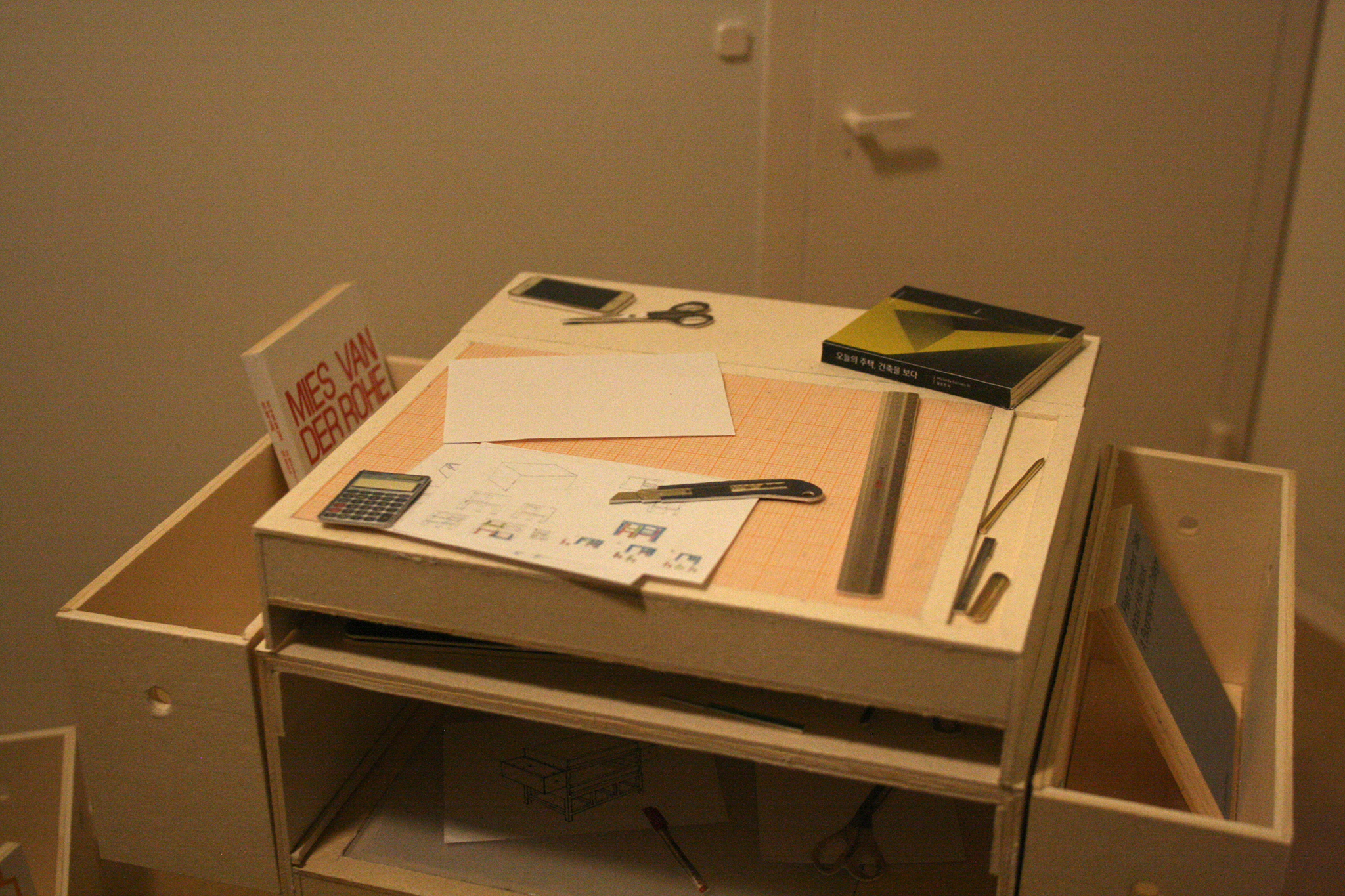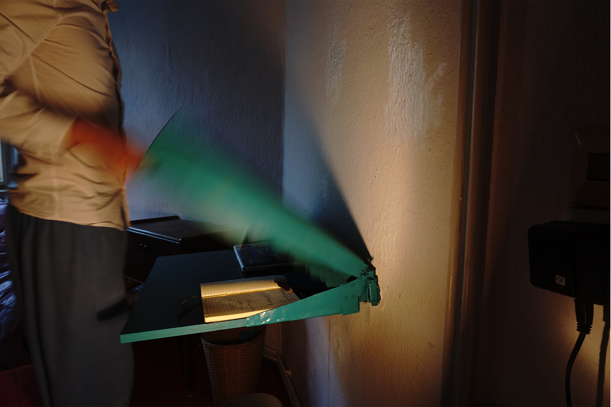 To solve this problem I have designed a work bench which covers all requirements for a comfortable workstation at home. Service Tray offers several table surfaces implicating different purposes. Whilst one surface is used for cutting, the second one contains lightbulbs inside which allows one for instance to copy sketches by using the back-lit surface. Due to the tray-mechanism the user can work on a project and easily pull out a second table surface to cover the current work and switch to an other project. The former work does not need to be displaced anymore.
