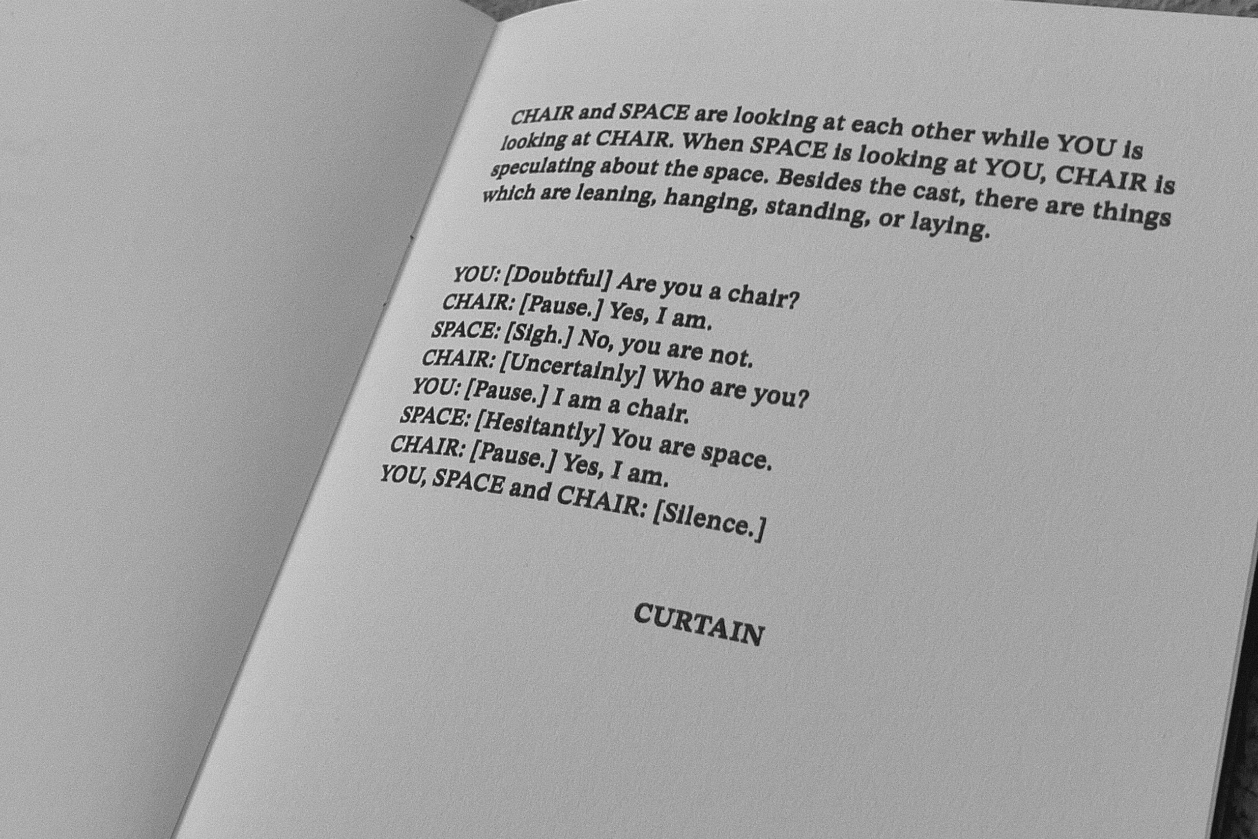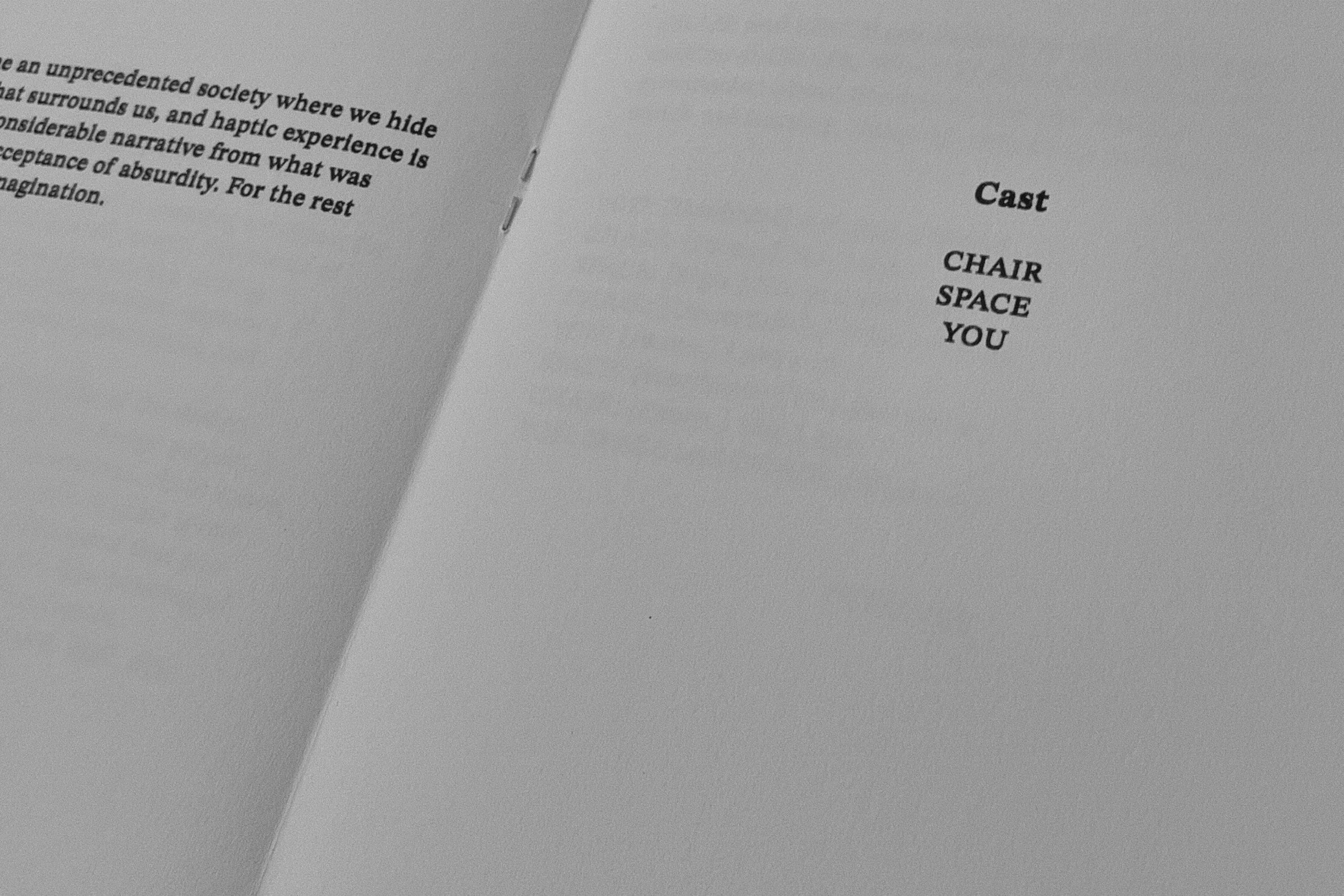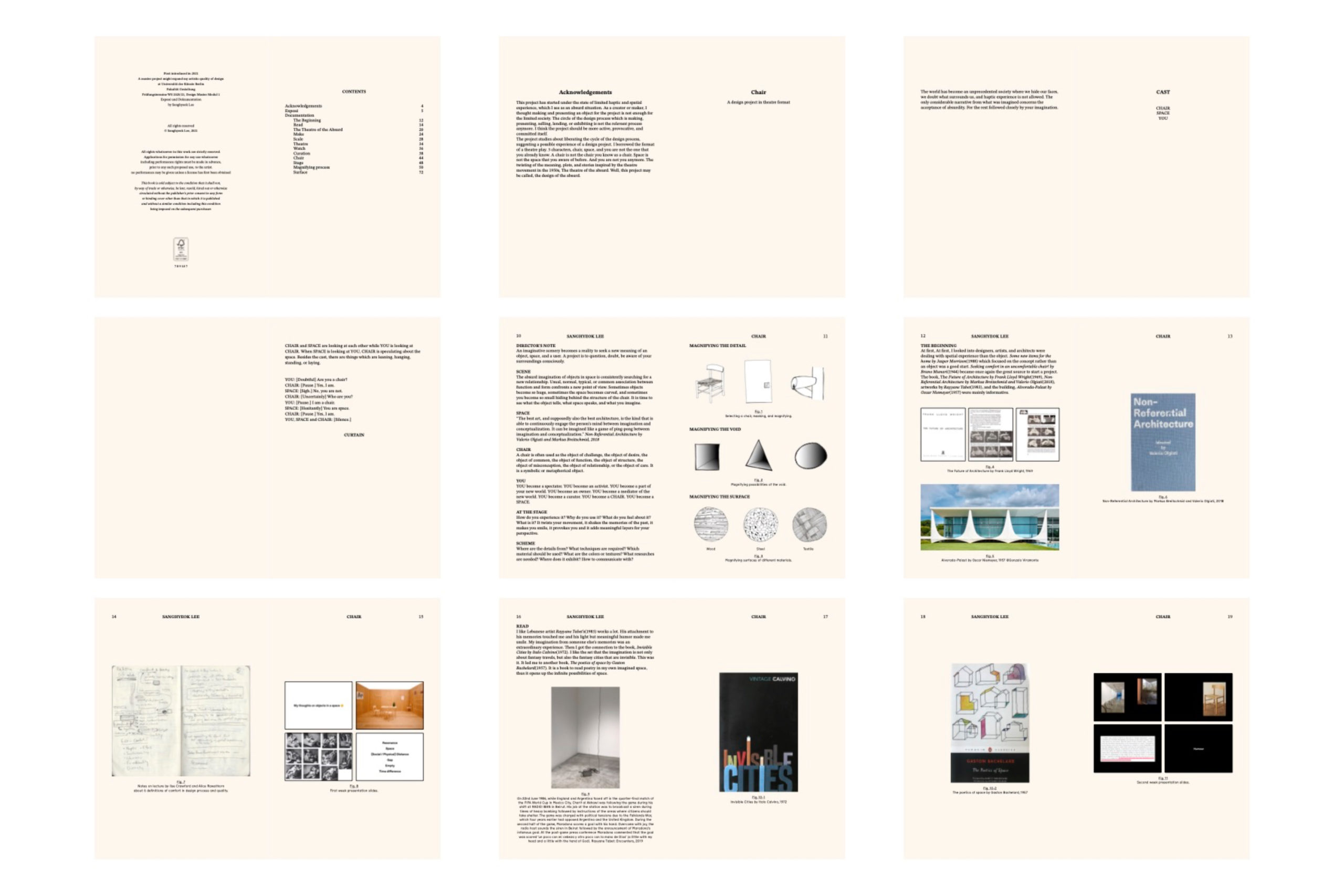 The project studies about liberating the cycle of the design process, suggesting a possible experience of a design project. I borrowed the format of a theatre play. 3 characters in the project chair, space, and you are not the one that you already know. A chair is not the chair you know as a chair. Space is not the space that you aware of before. And you are not you anymore. The twisting of the meaning, plots, and stories inspired by the theatre movement in the 1950s, The theatre of the absurd. Well, this project may be called, the design of the absurd.