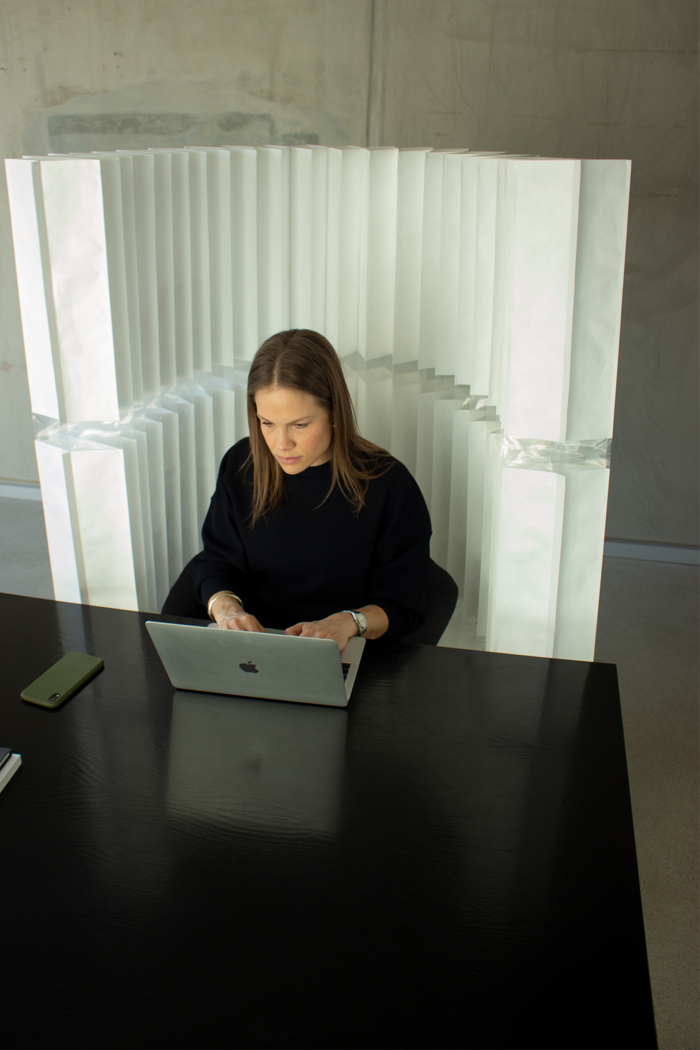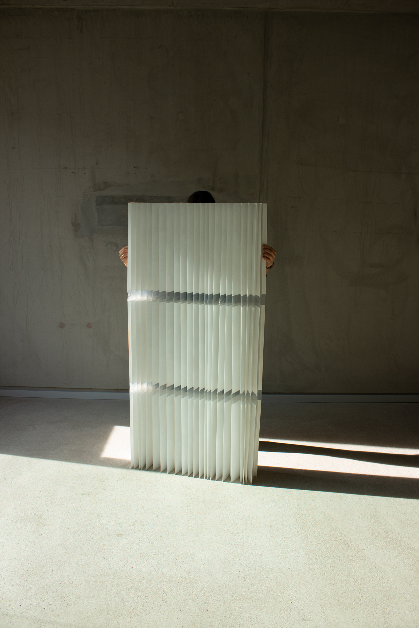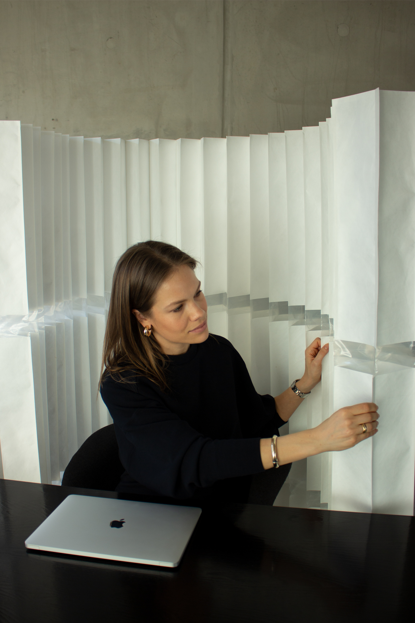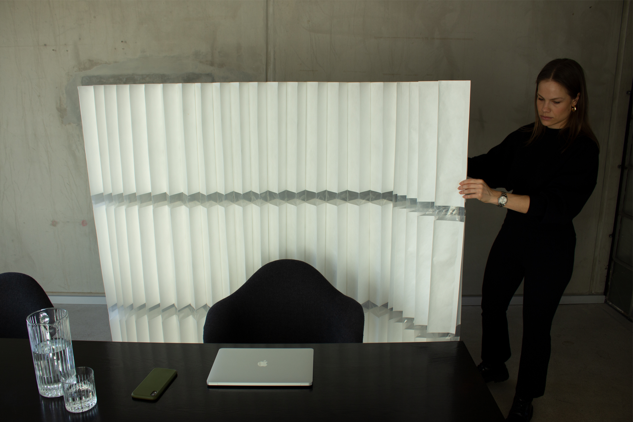 FOLD is a light and flexible wall that creates space for an undisturbed and focus-friendly workspace at home or in the office. Made of strong Tyvek, FOLD is easy to unfold. Transparent windows act as folding edges, opening the view to the outside and providing natural light. The honeycomb structure allows for flexible variation in length and provides a neutral background for video conferences. Light weight and a compact pack size make FOLD a practical companion in a new, fluid working environment.