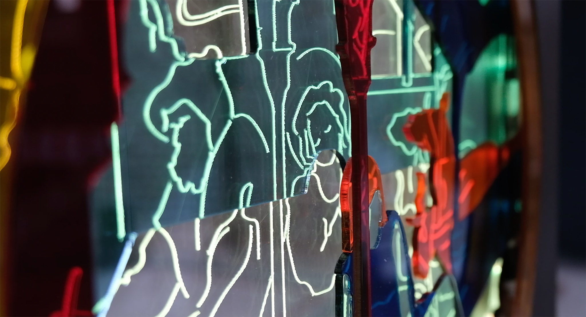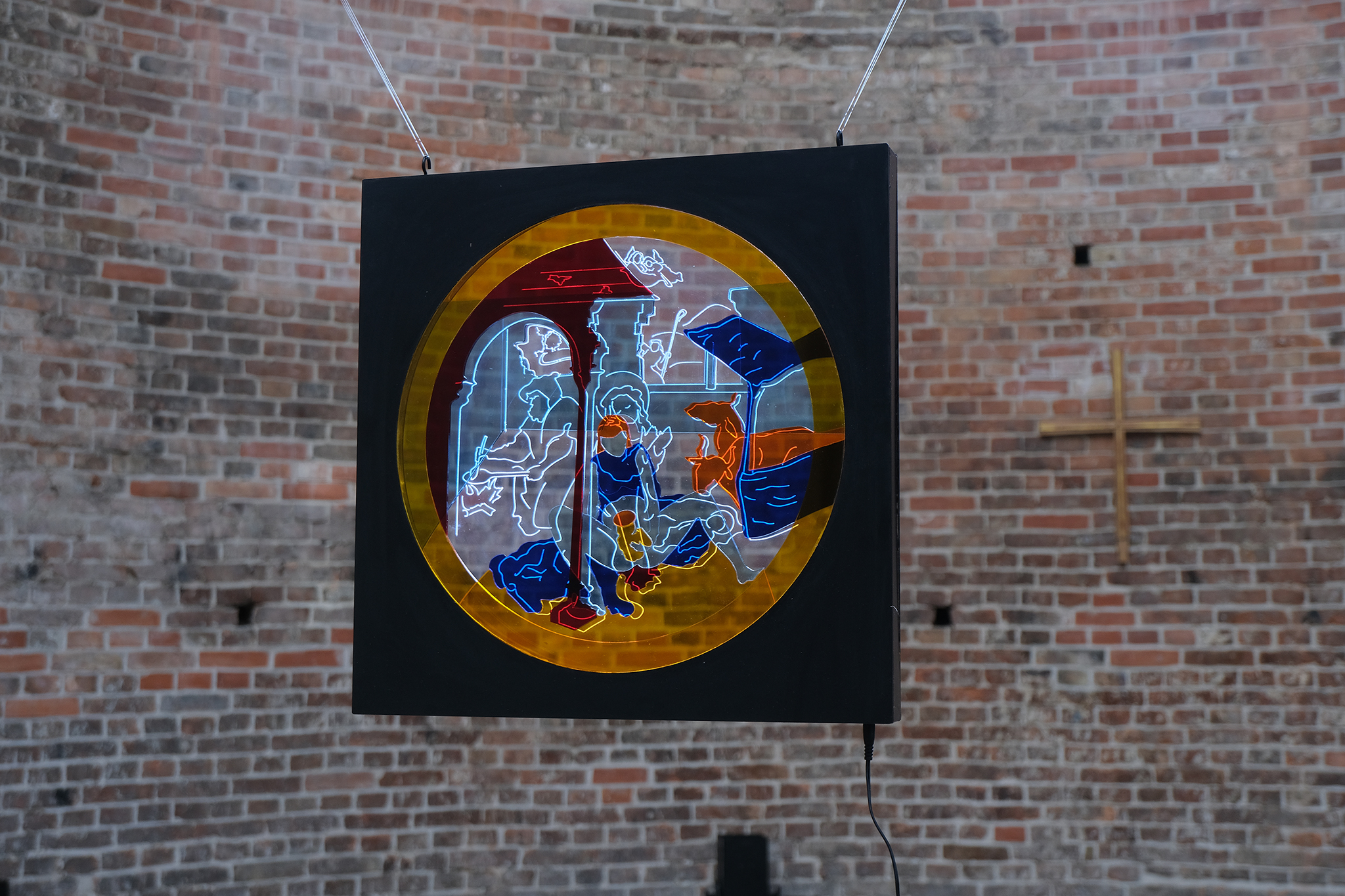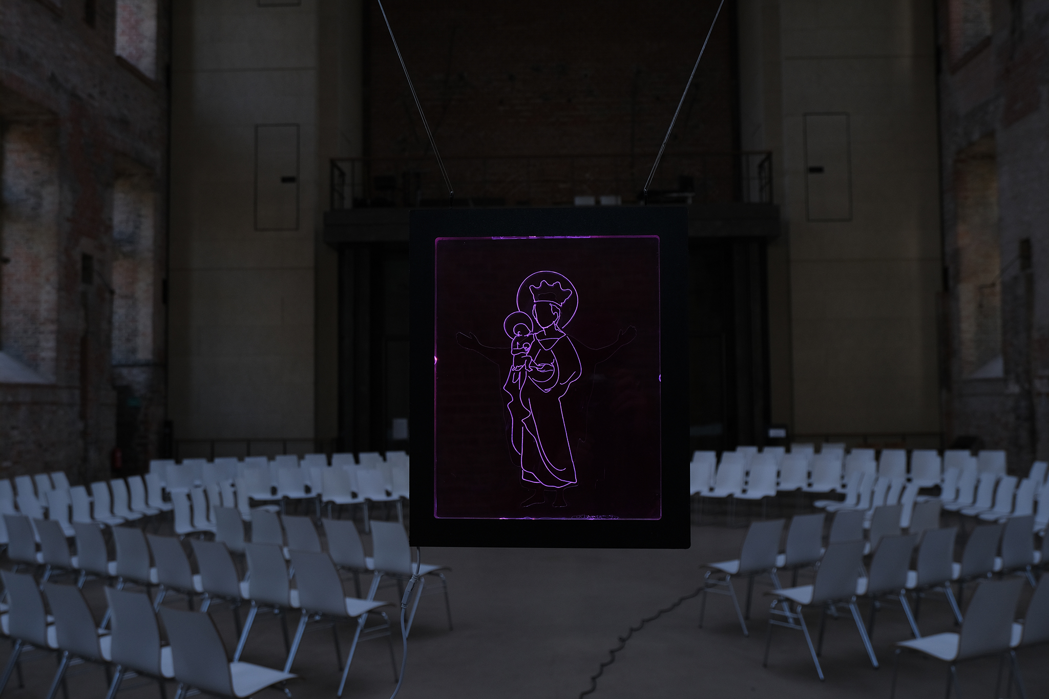 Neo[n] Mary deals with the representation of women in the sacral art. Like most of the present religions, Christianity is mainly men centred and has religiously legitimized male dominance in society. Over the centuries, strong female figures have been erased systematically from the Bible. Possible identification figures are limited to the holy, immaculate, obedient, and silent Mary, the mother of God, or the evil, sinful Eve, who seduced the “innocent man” and thus provoked banishment from eternal paradise. The misogyny of the Bible finds expression above all in art. Mary is strongly reduced to her role as a mother and is usually presented in a reserved submissive posture, her gaze turned to the side or to the ground – passive. These images have manifested themselves in our collective memory and are hardly questioned. Neo[n] Mary transforms the medieval glass paintings of the Kunstgewerbemuseum Berlin to the present, detaching them from the image of the submissive and compliant woman. The light objects made of layered acrylic glass elements show Mary in a strong and autonomous role – a loud and poppy response to centuries of oppression, silence, and silent prayer.