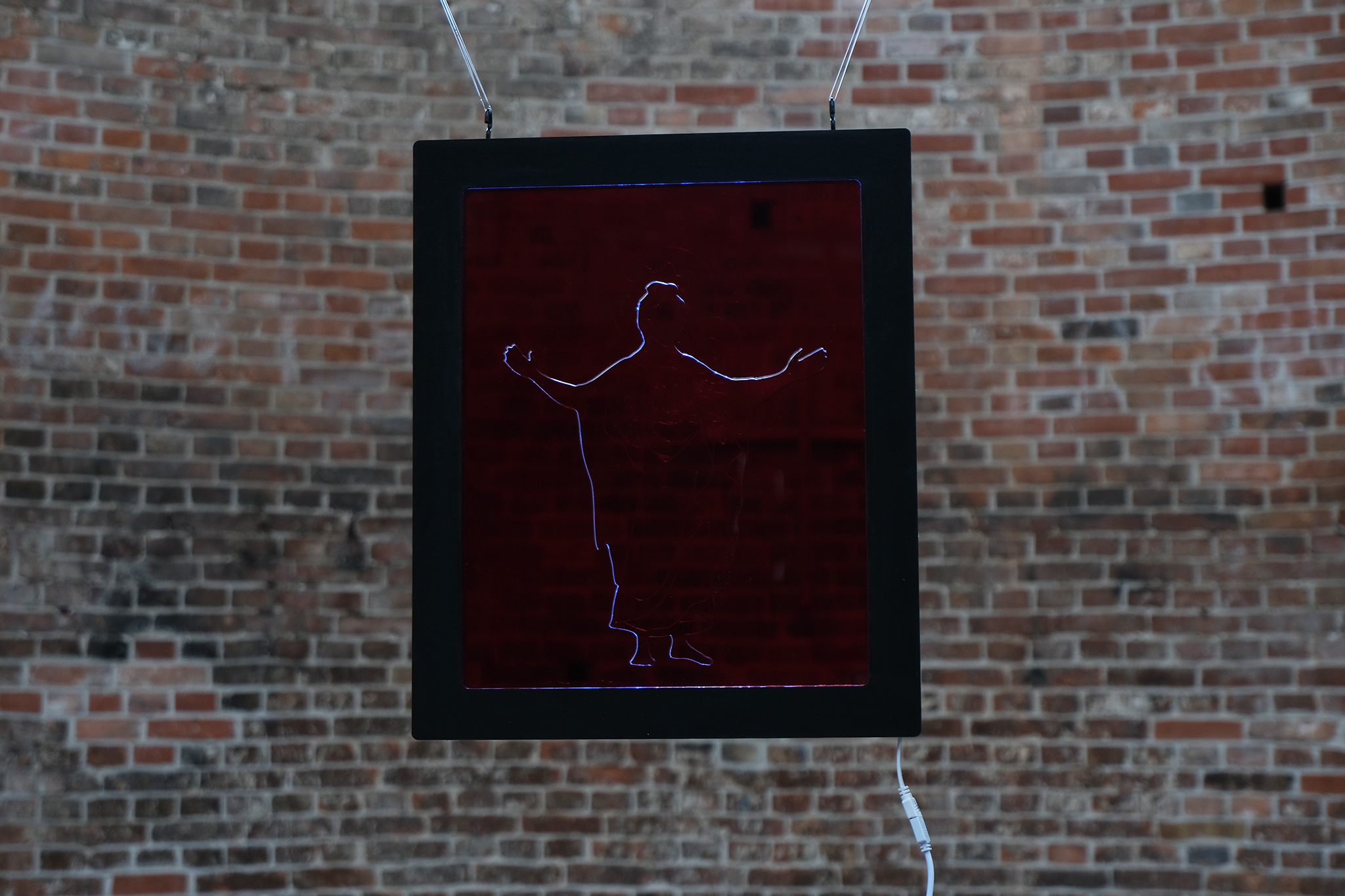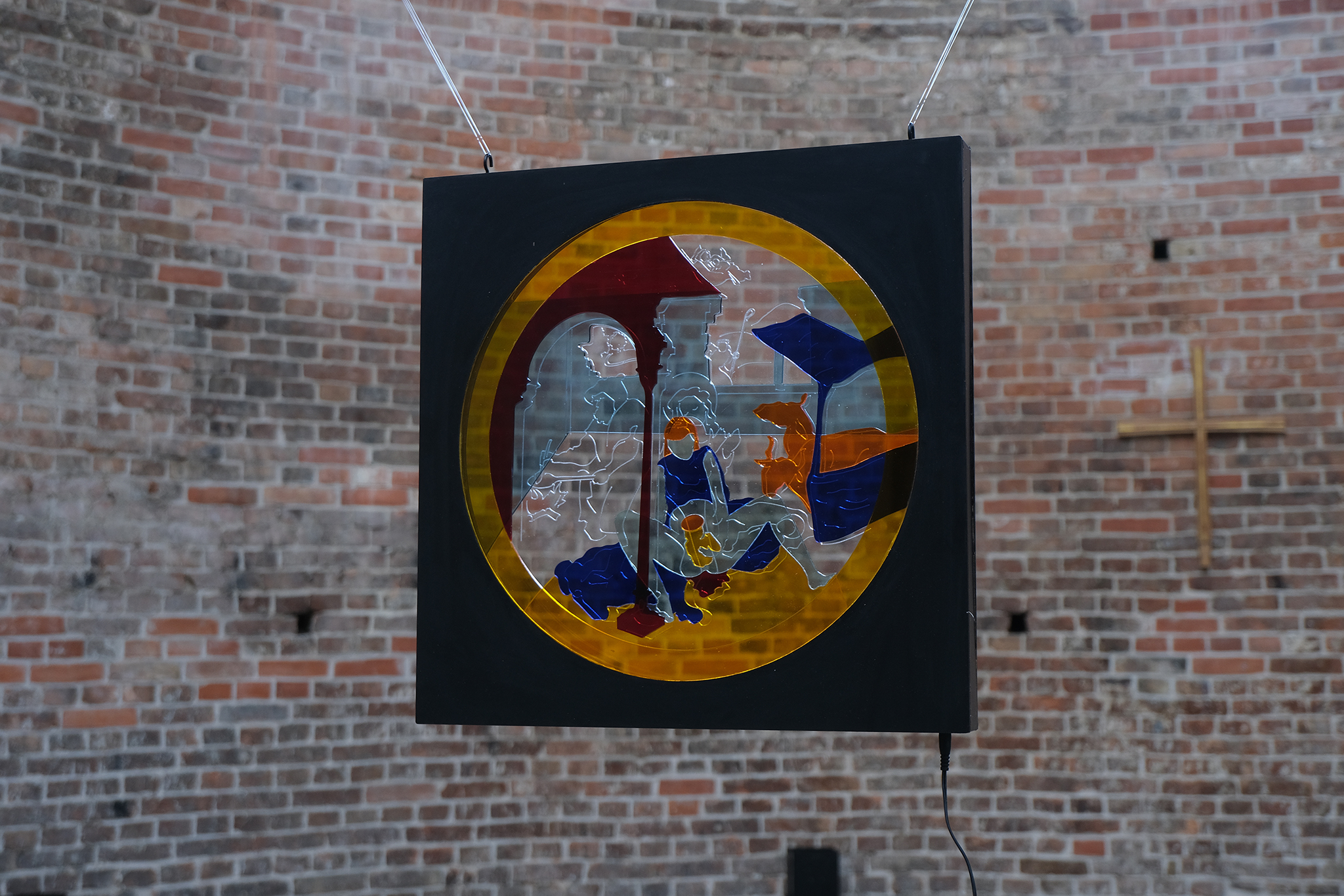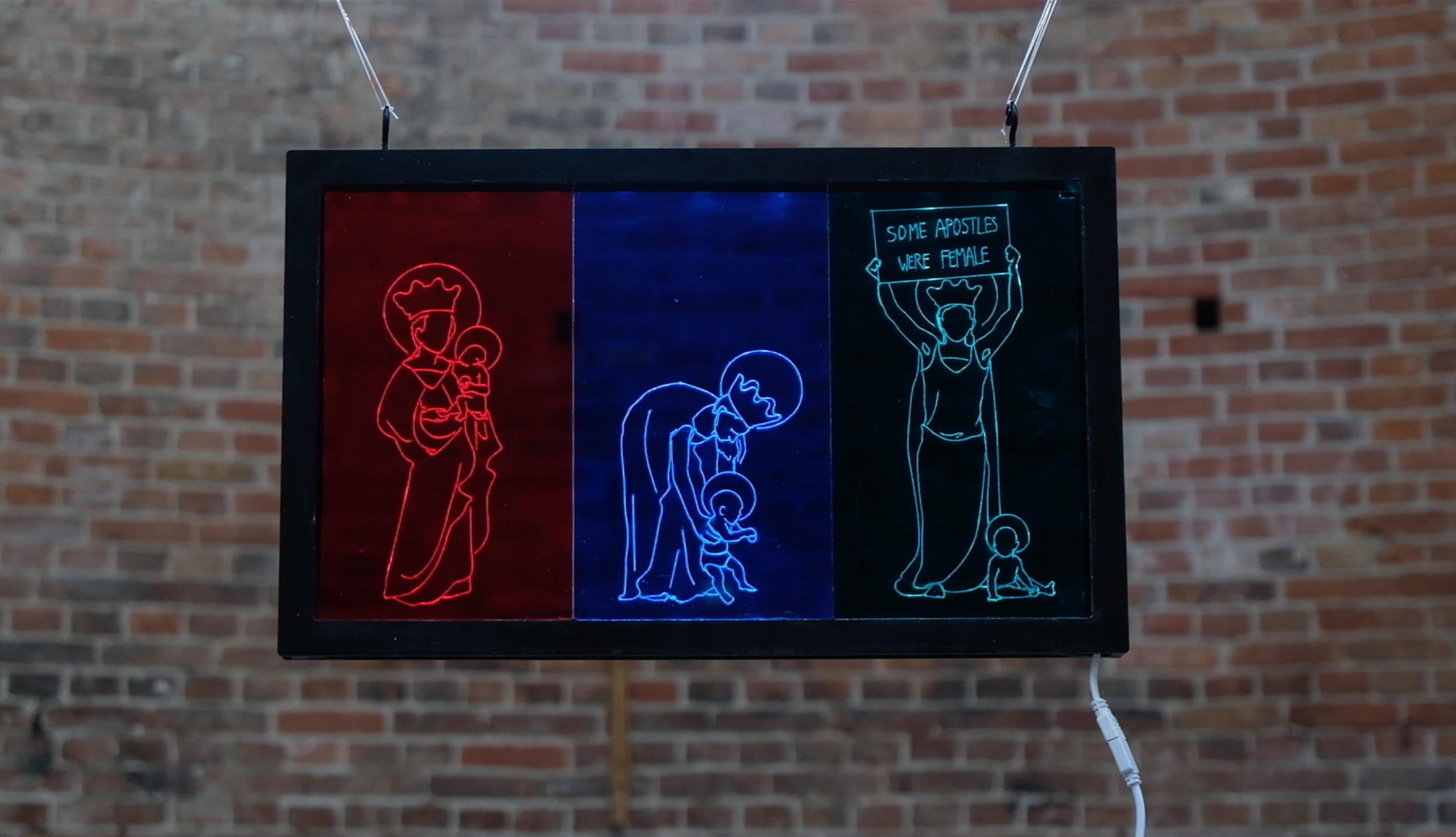 Neo[n] Mary deals with the representation of women in the sacral art. Like most of the present religions, Christianity is mainly men centred and has religiously legitimized male dominance in society. Over the centuries, strong female figures have been erased systematically from the Bible. Possible identification figures are limited to the holy, immaculate, obedient, and silent Mary, the mother of God, or the evil, sinful Eve, who seduced the “innocent man” and thus provoked banishment from eternal paradise. The misogyny of the Bible finds expression above all in art. Mary is strongly reduced to her role as a mother and is usually presented in a reserved submissive posture, her gaze turned to the side or to the ground – passive. These images have manifested themselves in our collective memory and are hardly questioned. Neo[n] Mary transforms the medieval glass paintings of the Kunstgewerbemuseum Berlin to the present, detaching them from the image of the submissive and compliant woman. The light objects made of layered acrylic glass elements show Mary in a strong and autonomous role – a loud and poppy response to centuries of oppression, silence, and silent prayer.