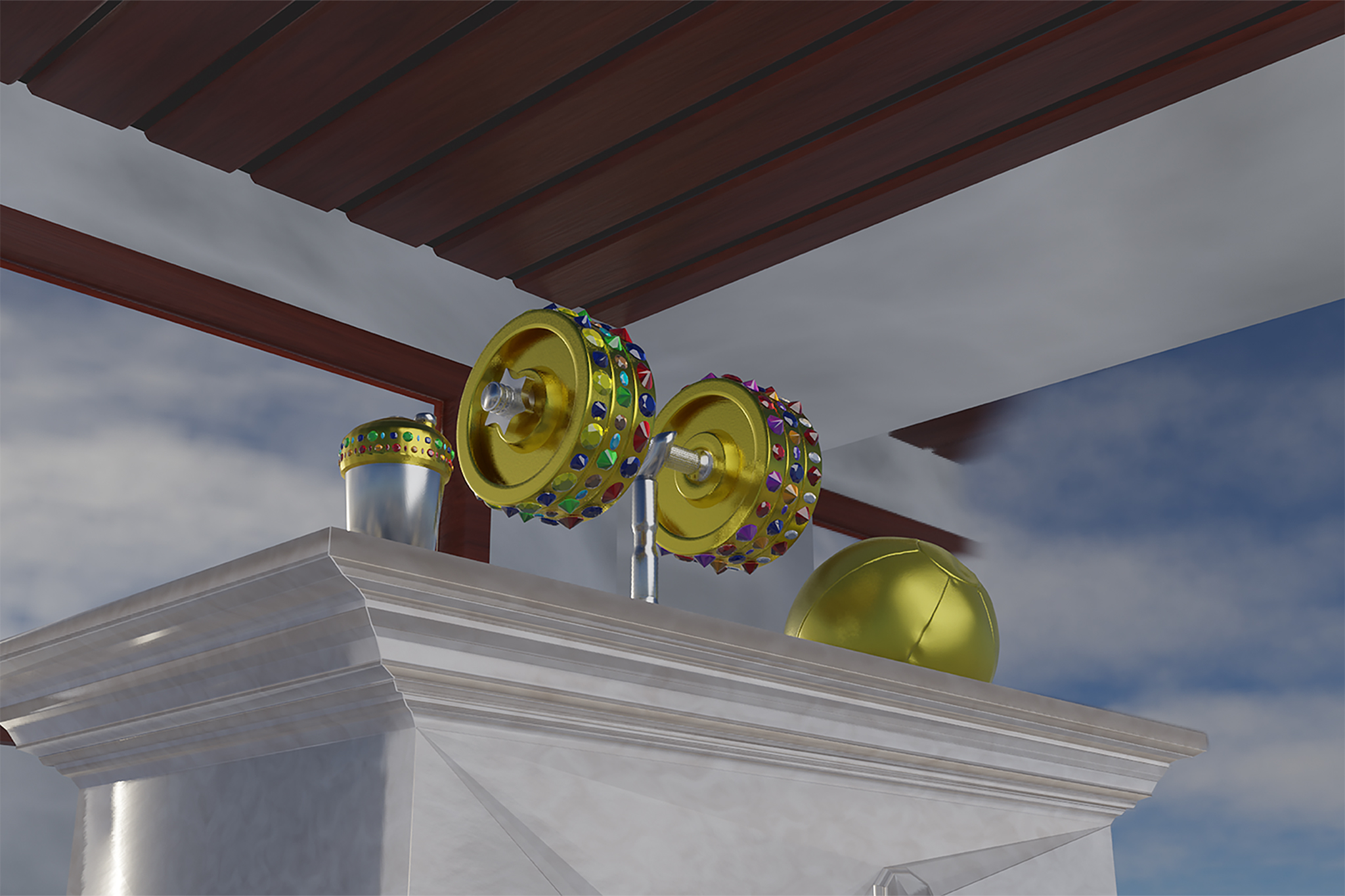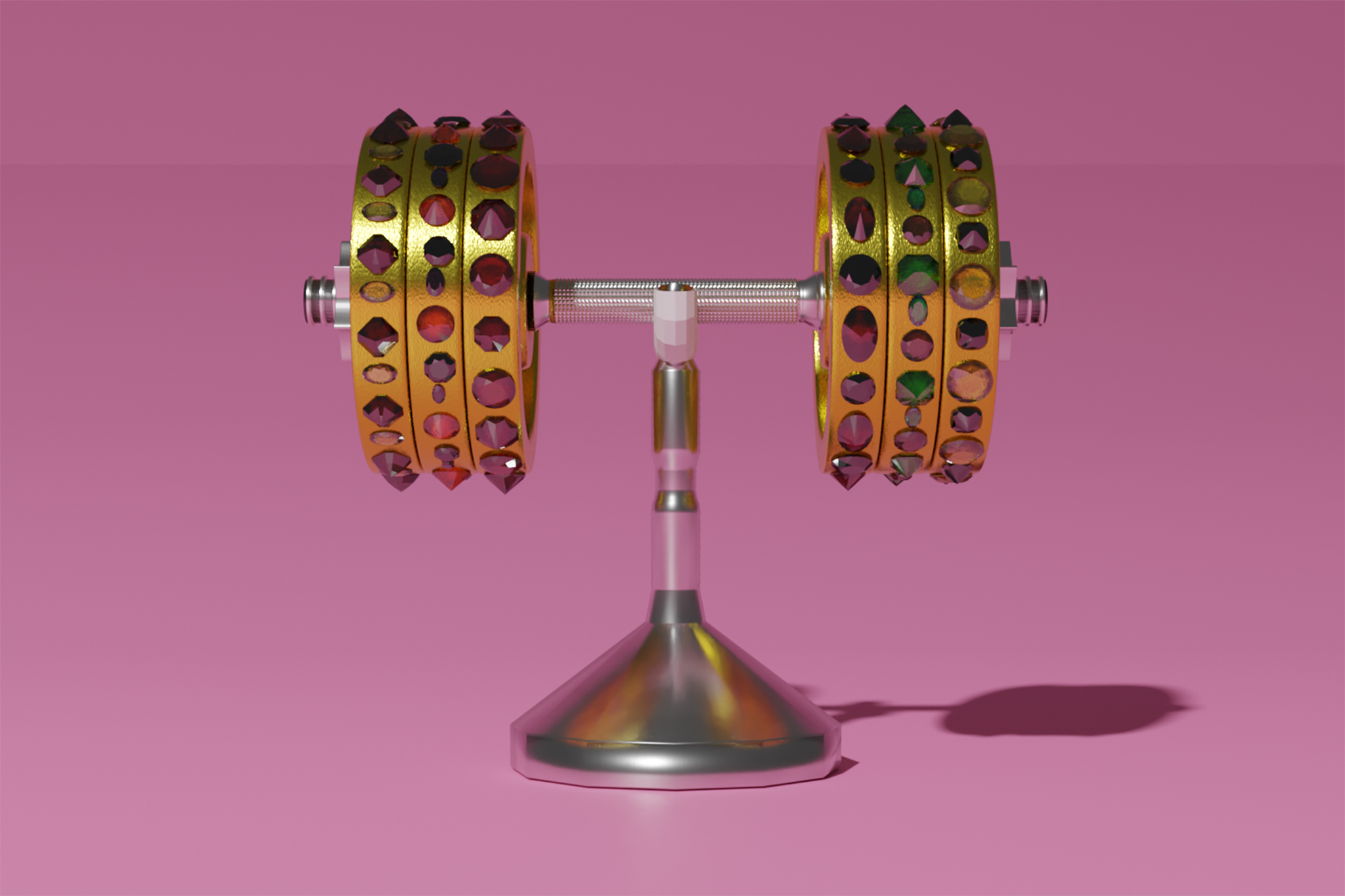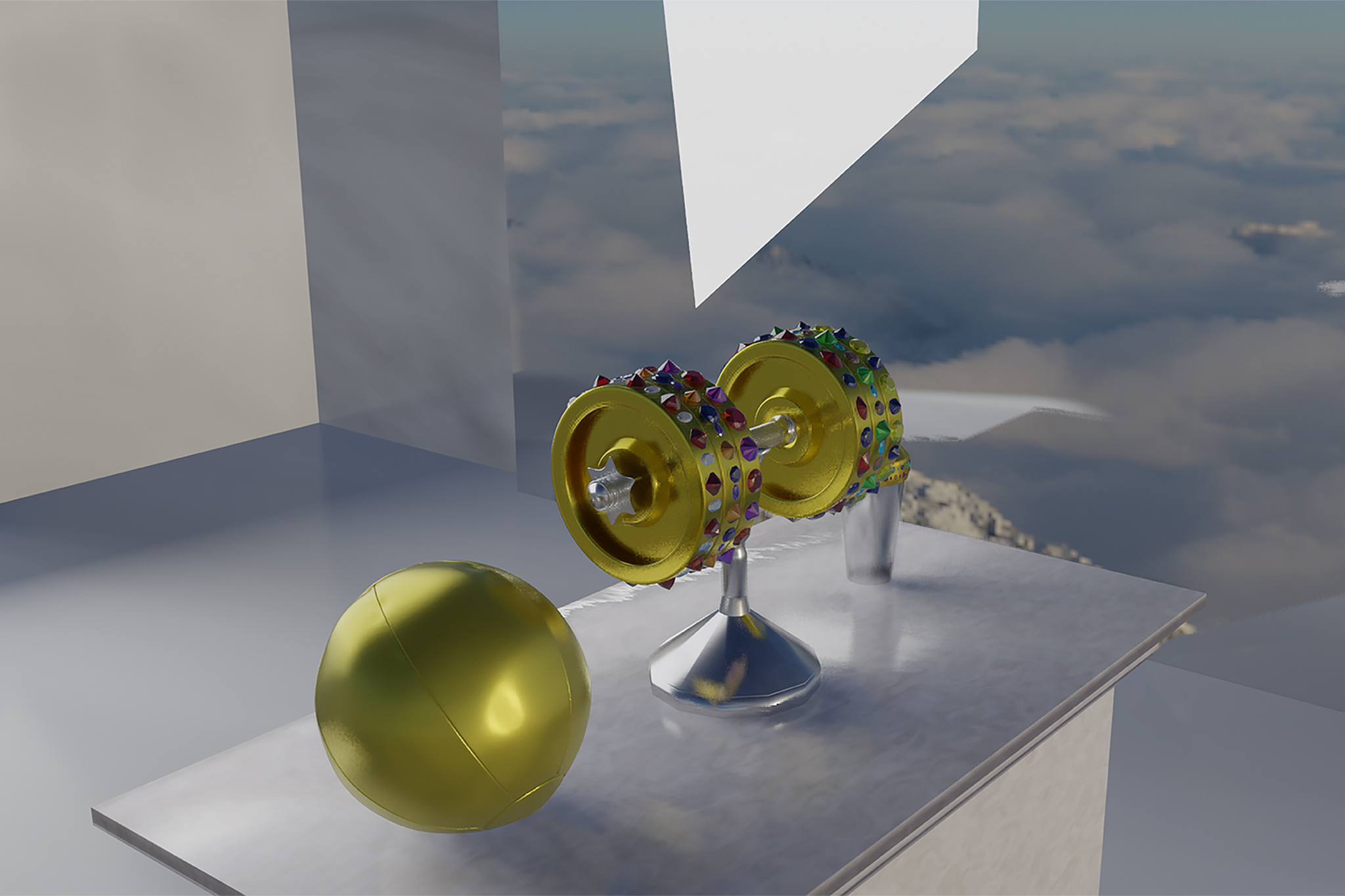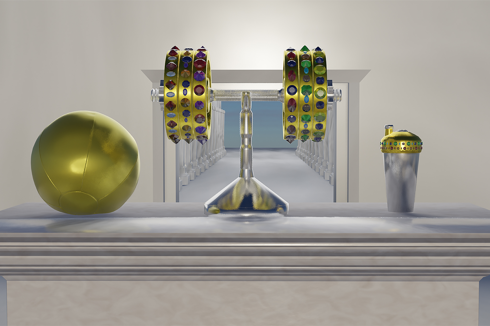 In the animated film modified fitness gadgets are staged in a sacred and glamourous way. The eye of the viewer is guided through the insides of a church-like colonnade made of marble. At the end of it is an altar on which three transformed objects are placed; a gold, jeweled dumbbell on a rack, a gold medicine ball, and a gold, jeweled protein shaker. The religious staging turns the fitness equipment into holy objects of worship and therefore ironic symbols for a culture obsessed with its own optimization.