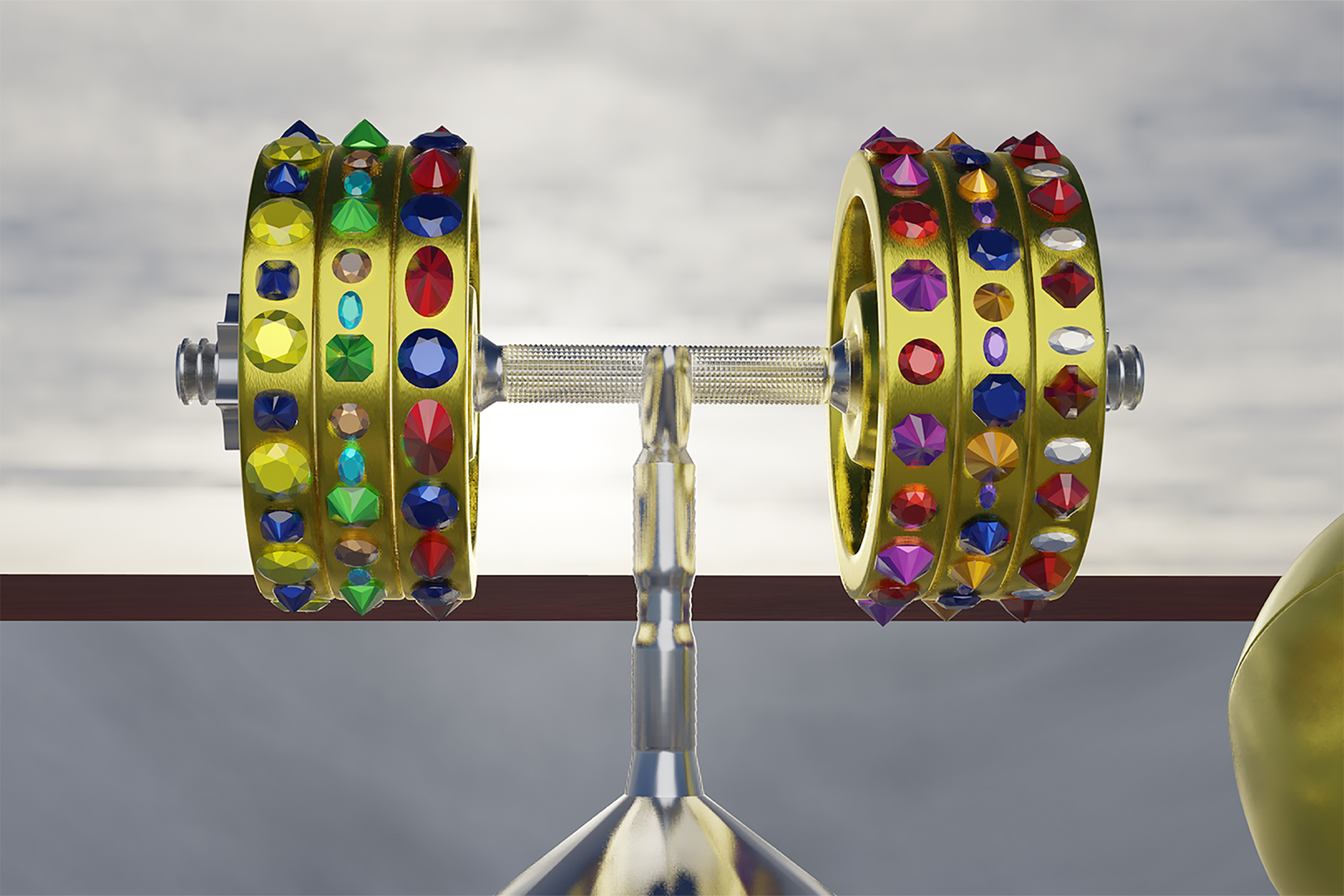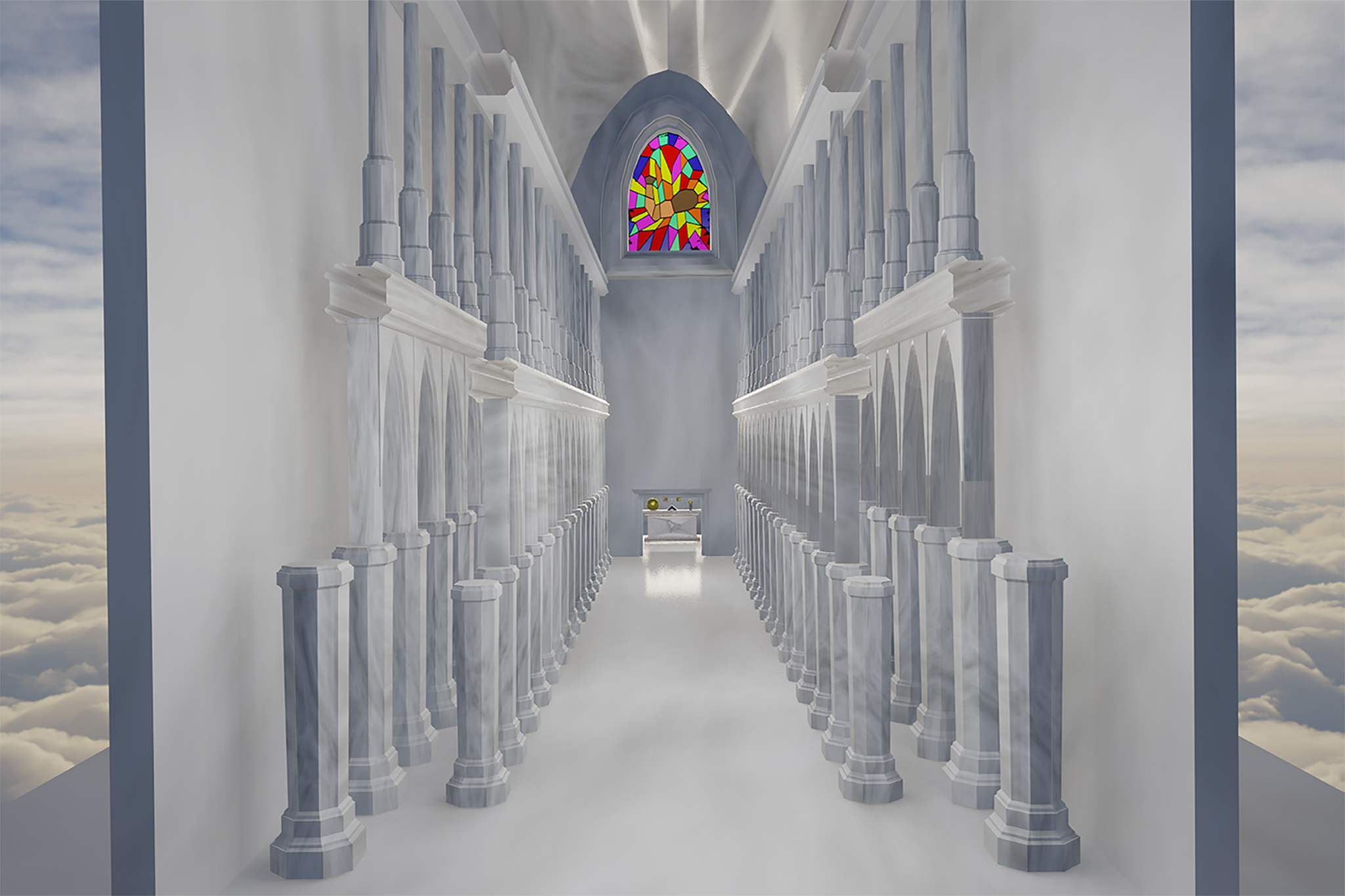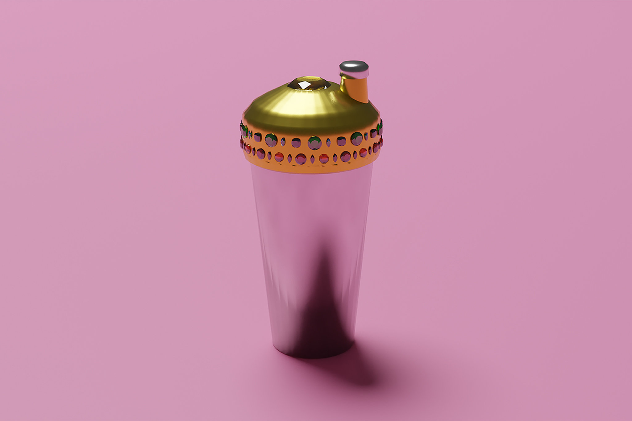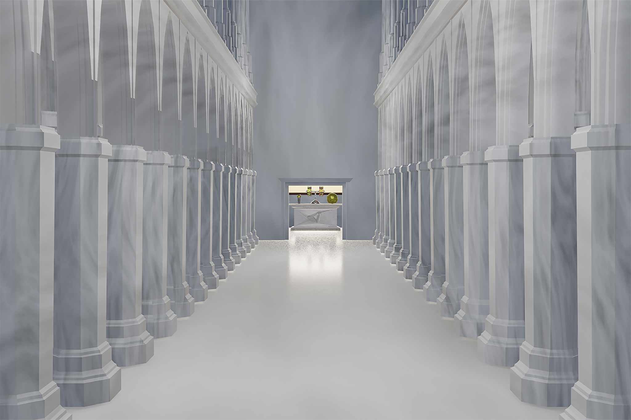 In the animated film modified fitness gadgets are staged in a sacred and glamourous way. The eye of the viewer is guided through the insides of a church-like colonnade made of marble. At the end of it is an altar on which three transformed objects are placed; a gold, jeweled dumbbell on a rack, a gold medicine ball, and a gold, jeweled protein shaker. The religious staging turns the fitness equipment into holy objects of worship and therefore ironic symbols for a culture obsessed with its own optimization.