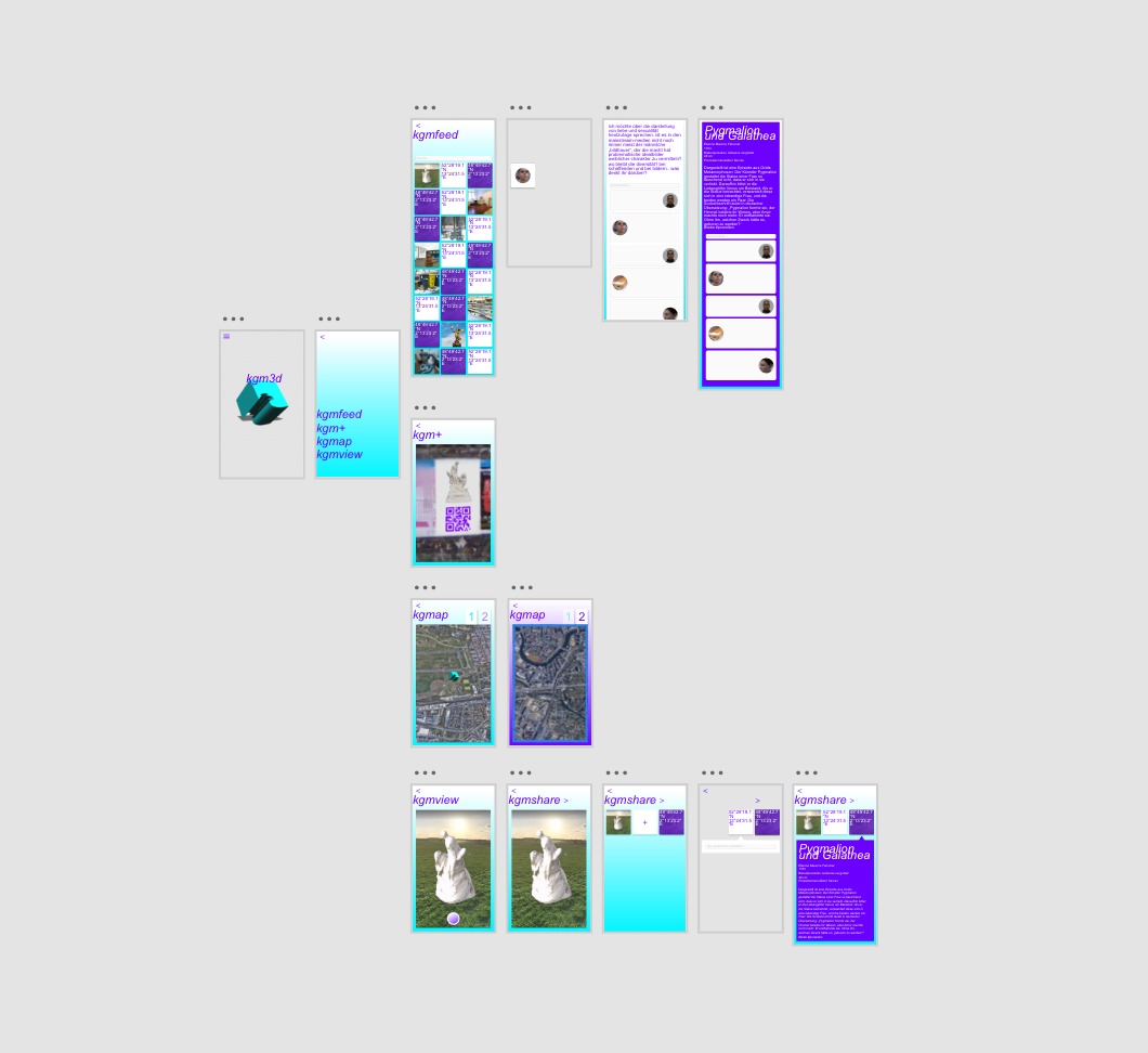 KGM3D ist eine Anwendung, also eine App, die die Techniken des 3d Scans und der Augmented Reality nutzt, um die Objekte und das Wissen des Kunstgewerbemuseums für viele Menschen erfahrbar zu machen. Man kann das Projekt auch als einen Vorschlag für eine zeitgenössische Ausstellungsmethode verstehen. Das Museum soll auf den öffentlichen Raum ausgeweitet und mit der Stadt verwoben werden. Sammlungsobjekte sollen ihre Vitrinen verlassen und sichtbar werden. Zu dem Konzept gehört eine Plakat Kampagne, die die 2D Bilder der Objekte bereits im Stadtbild verteilt. Mit dem QR-Code darauf erhalten die Nutzenden Zugriff zu den 3D Kopien der Objekte. 3D Objekte werden ebenfalls in der Stadt auf Standorte platziert und können mit der App, in einer augmented reality von anderen Nutzenden besucht und betrachtet werden. So entsteht ein Netzwerk, der Objekte auf der Landkarte, wie auch unter den Nutzenden der App. Die App ist interaktiv. Benutzer*innen werden angeregt aktiv und kreativ zu werden denn das öffentliche Museum entsteht und wächst, durch das Mitmachen von Vielen. Benutzer*innen werden aus ihrer passiven Rolle der Museumsbesuchenden zu Mitgestaltenden erhoben. Außerdem werden Nutzende dazu aufgefordert Geschichten zu ihren eigens erstellten Neu-kontextualisierungen der Objekte zu verfassen und im feed miteinander zu besprechen. KGM3D soll gleichzeitig Fragen zur Relevanz der Museums-Bewahrungskultur, und zur Relevanz und Nutzung zeitgenössischer Medien provozieren. Es sollen Kontexte und Bilder entstehen, die zeitgenössische Fragen, Themen und Diskussionen anregen. Außerdem sollen Objekte auch mit ihren tatsächlichen, geschichtlichen Standorten verknüpft und nicht-fiktive Kontexte erzählt werden. Sodass man zwischen den Ebenen wechseln kann und auch hier eine Parallelität und ein Vergleich stattfindet.