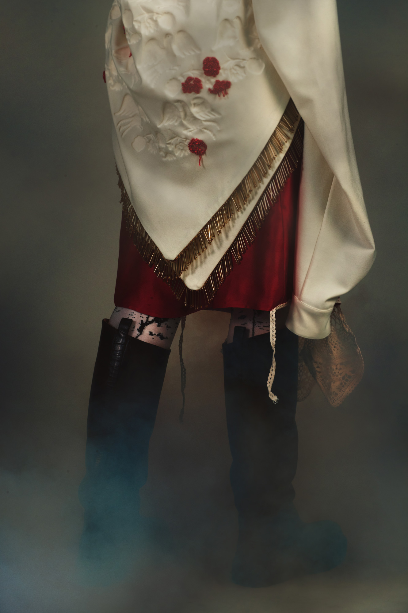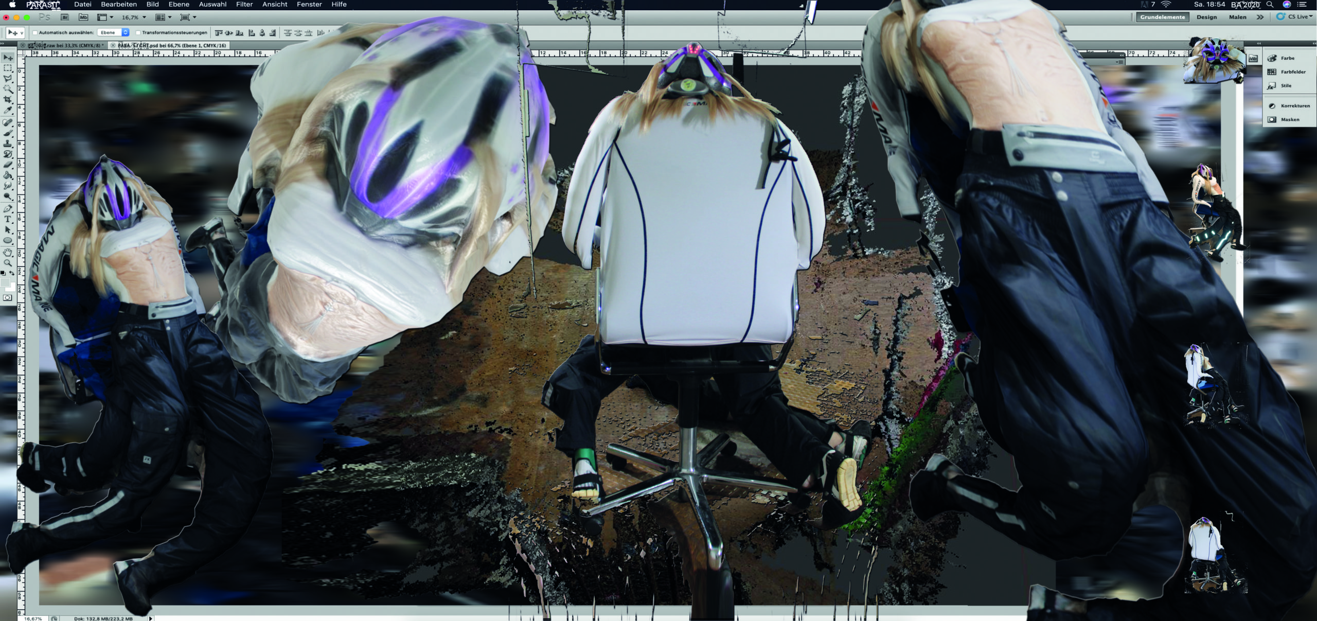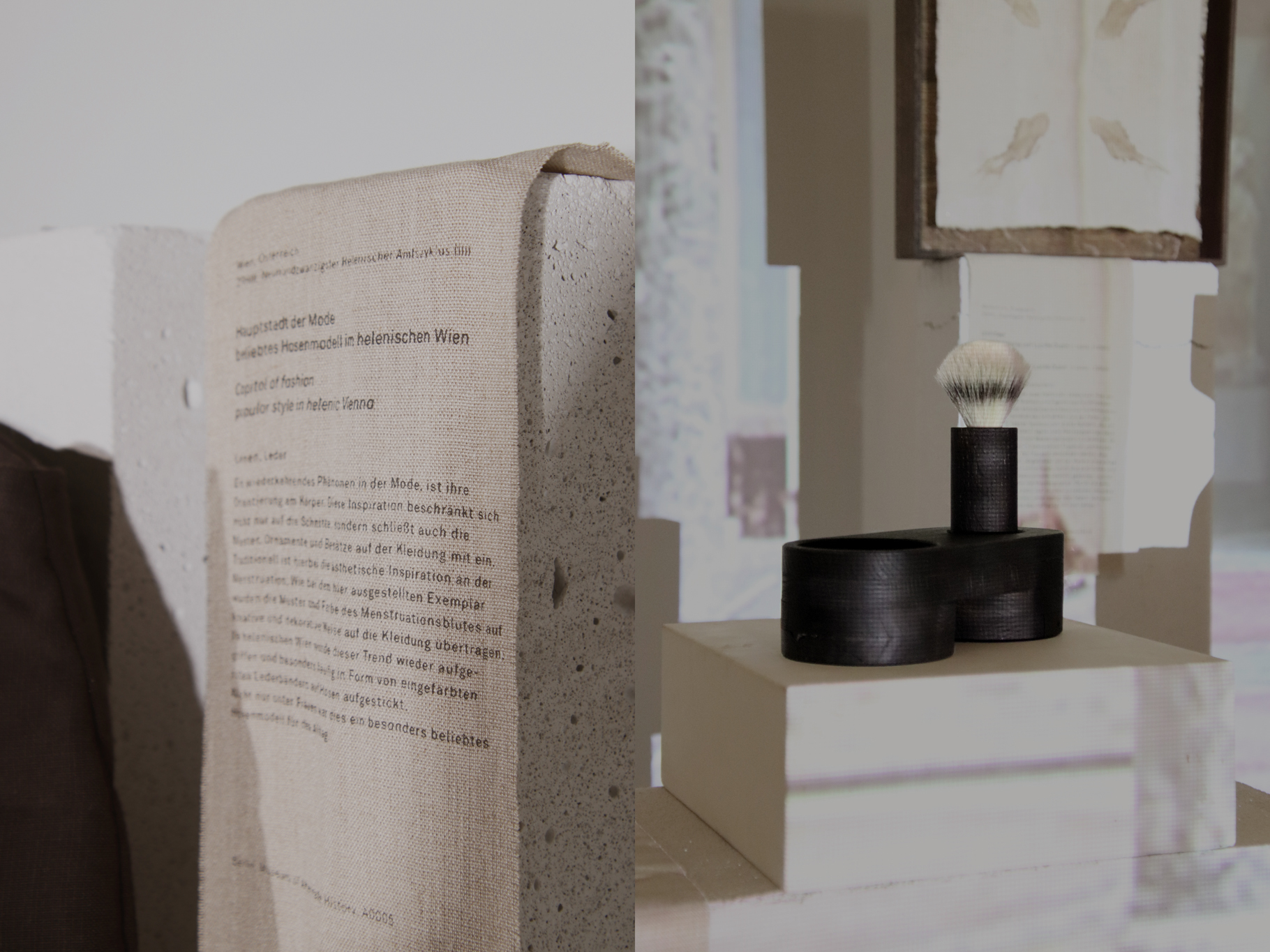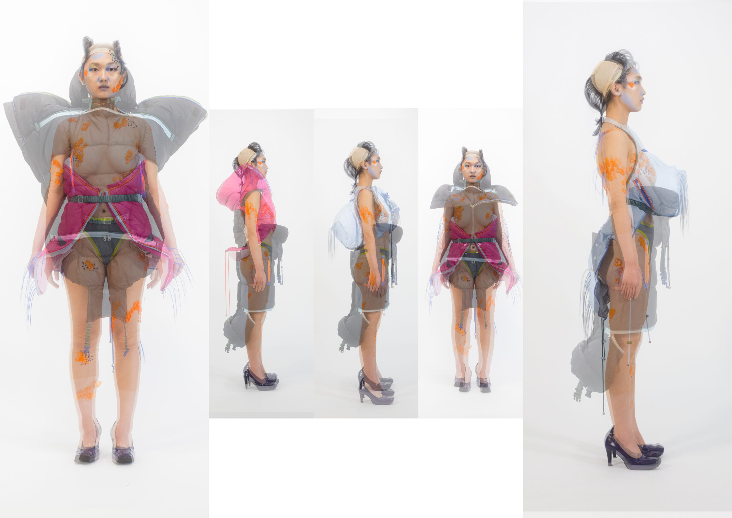 The simplest form of concealment can be done by deforming the body with the help of clothes. Among these is the contour-dissolving hoodie. In contrast, the corset puts the focus on sexualized limbs, additi-vely is straining the body and leaves drawings in the name of restrictive gender roles. The work deals with the process of differentiation and becoming aware of one‘s own gender identity and the accompany-ing dysphoric relationship to the body. The original points of view of the corset are intentionally shifted to other points.