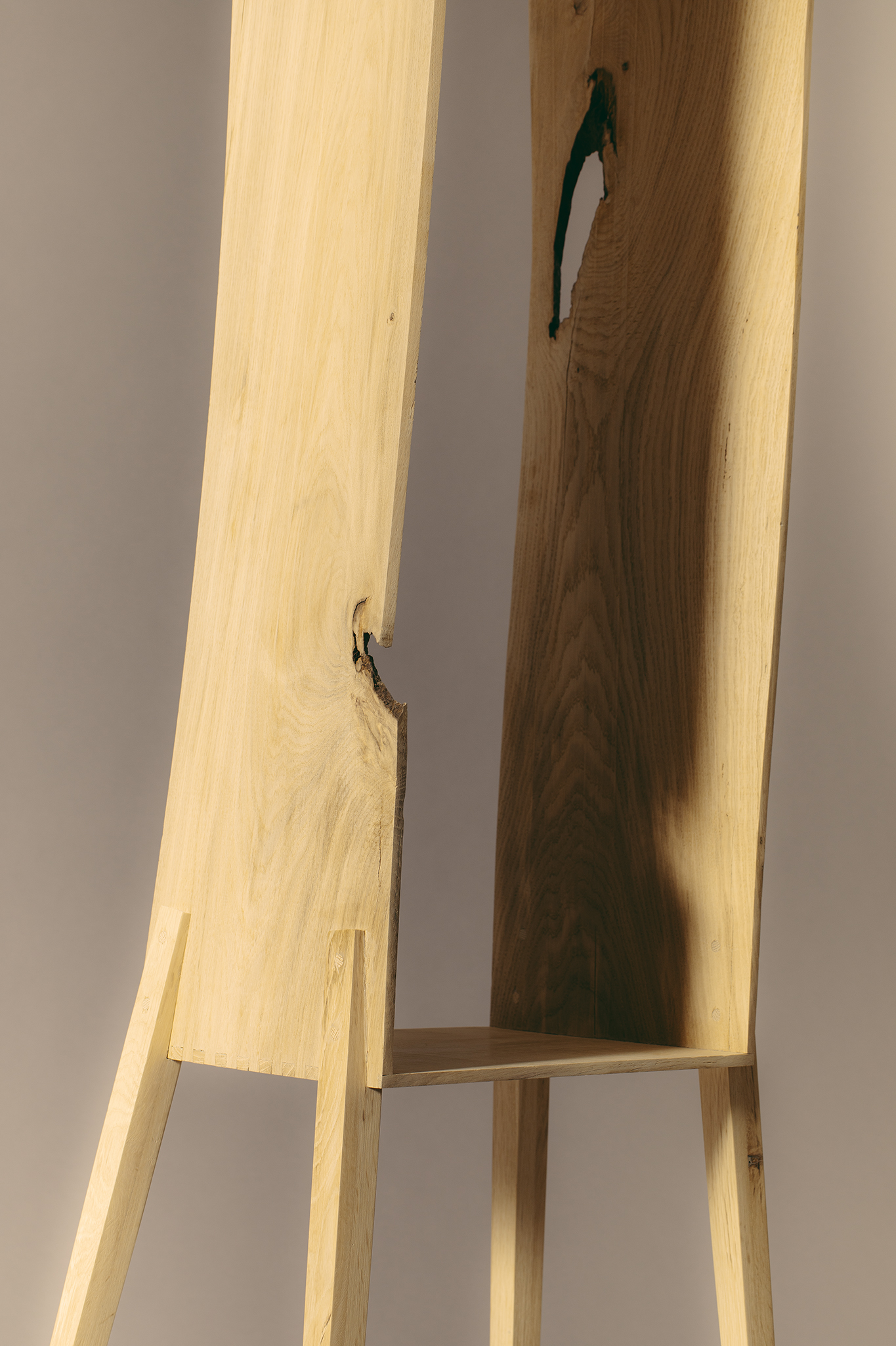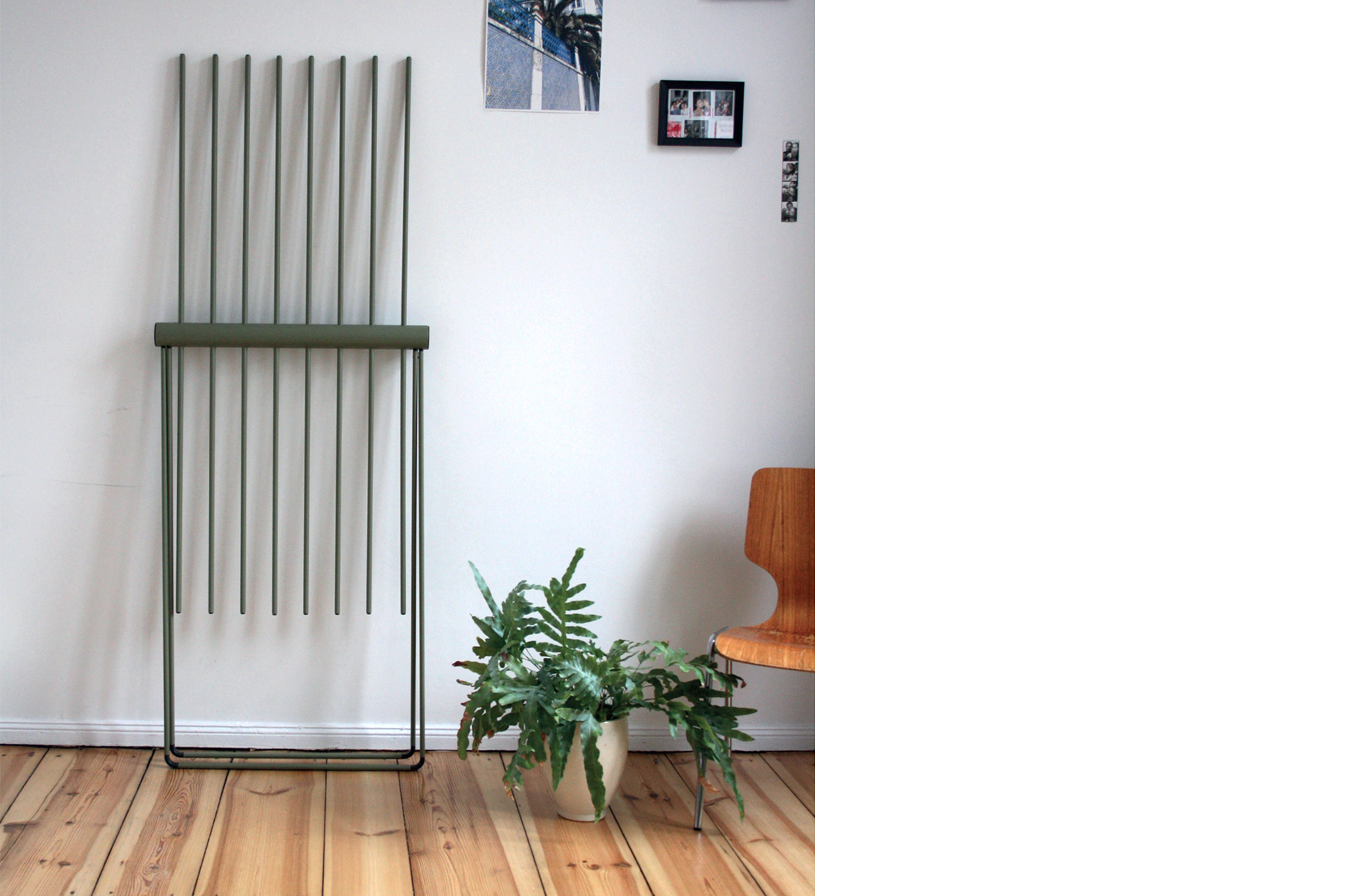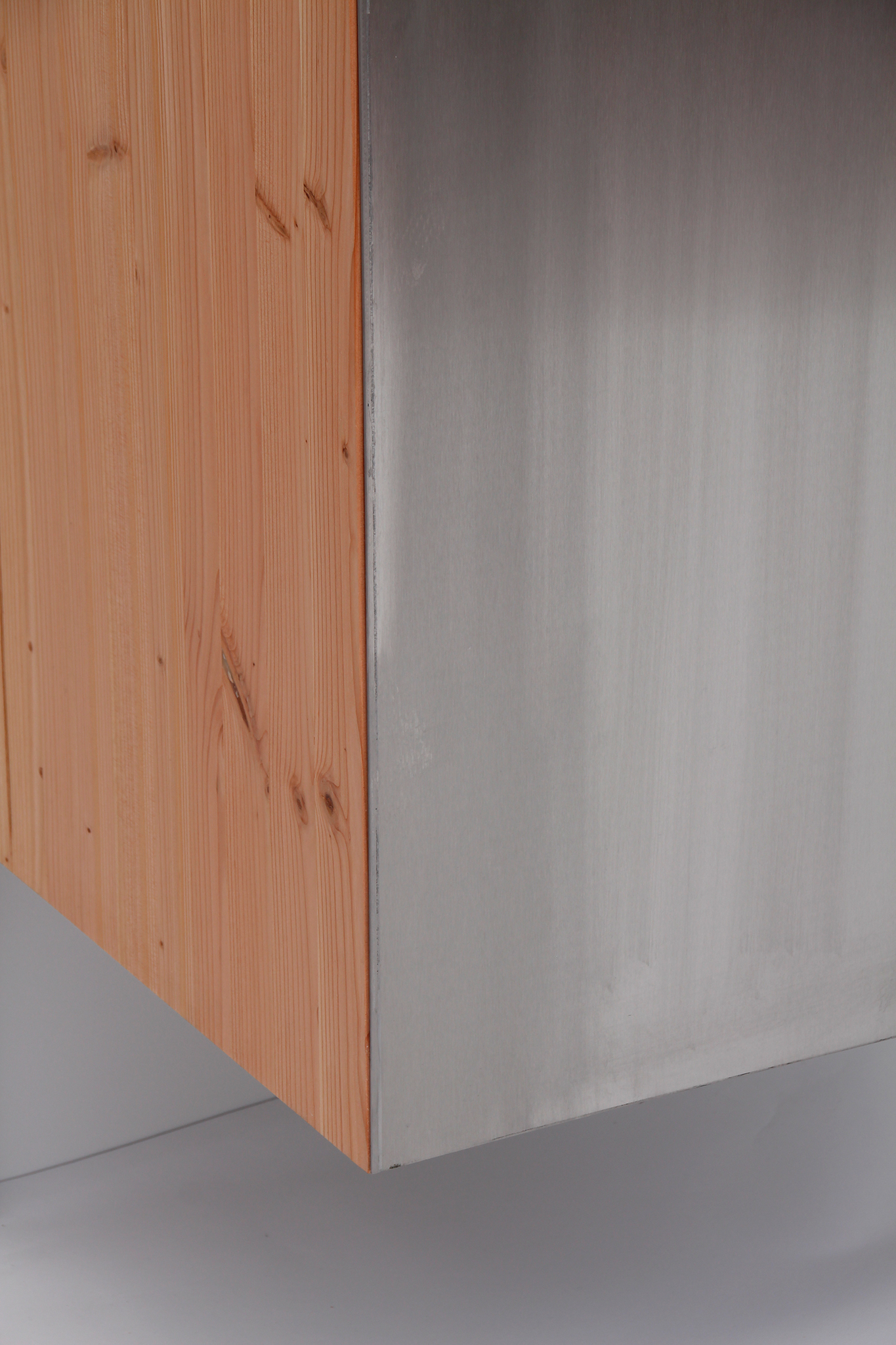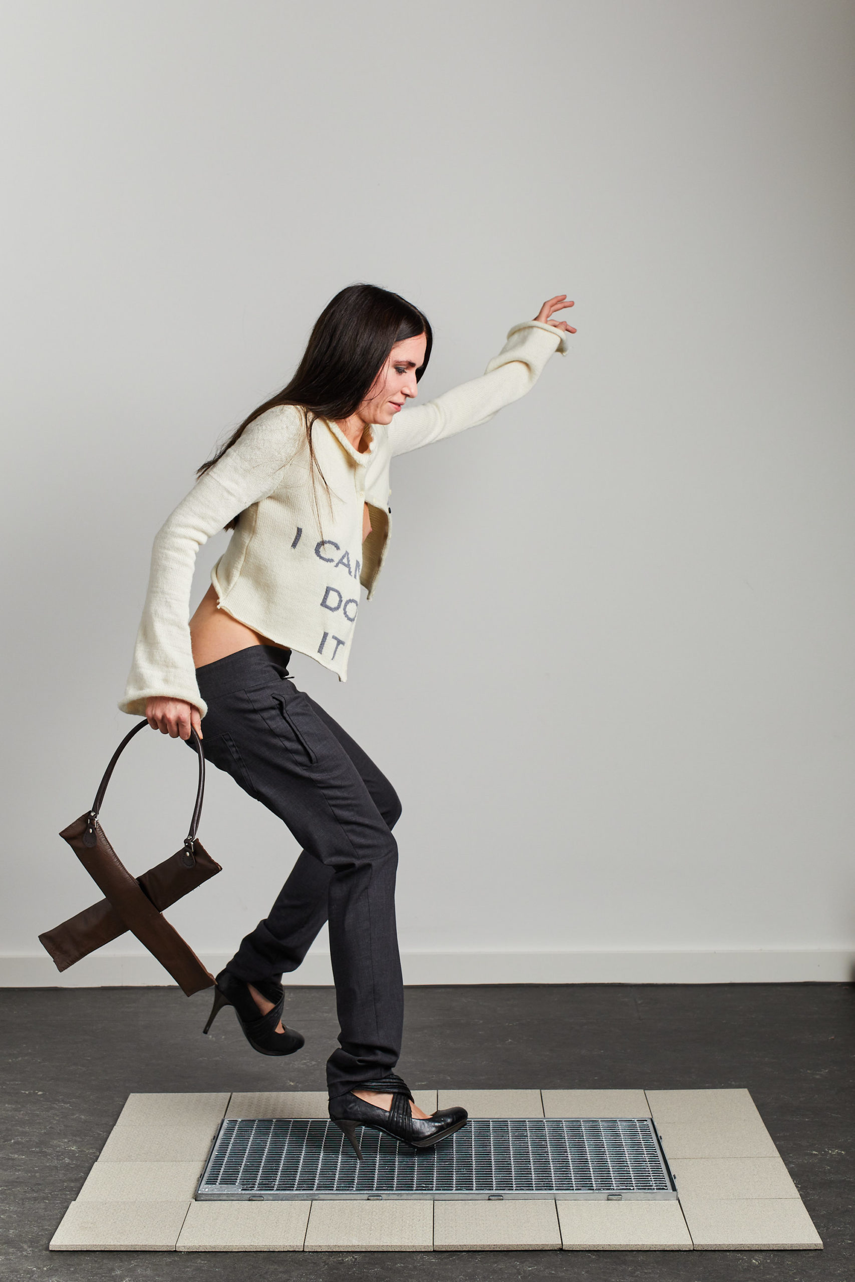 Der Entwurf verdeutlicht das Gefühl von Gewicht in meinem Inneren.Es bedeutet das Maß an Verantwortung, die ich fühle oderder Grad der Atmosphäre, die ich empfinde, wenn ich bestimmte Dinge sehe.Der Oberkörper (Weste) des Hoodies erscheint schwer, indem breit geschnittene Jerseystreifen aus einem alten Kleid neu verstrickt wurden.Das Wesen des Kleides bleibt somit in einer anderen Form erhalten.Der Kapuzenteil des Hoodies ist großzügig geschnitten und besteht aus leichtem und dehnbarem Jersey. Die Silhouette sollte leicht beginnen und in ein Wechselspiel der Schwere und Leichtigkeit der Materialien übergehen.Der Rock zeigt gewissermaßen eine grobe rechteckige Form. Durch die Beschaffenheit der Seide klebt der Rock am Körper und zeigt die Silhouette im Inneren.Um den Rock mit dem Oberkörper zu verbinden, habe ich eine dünne Kette verwendet.Ich mag die Harmonie der leichten Seide verbunden mit der dünnen Kette.Fein aber stark, verschwommen und dennoch sicher.