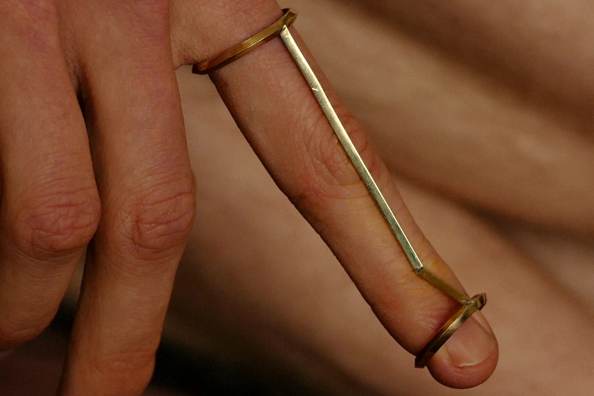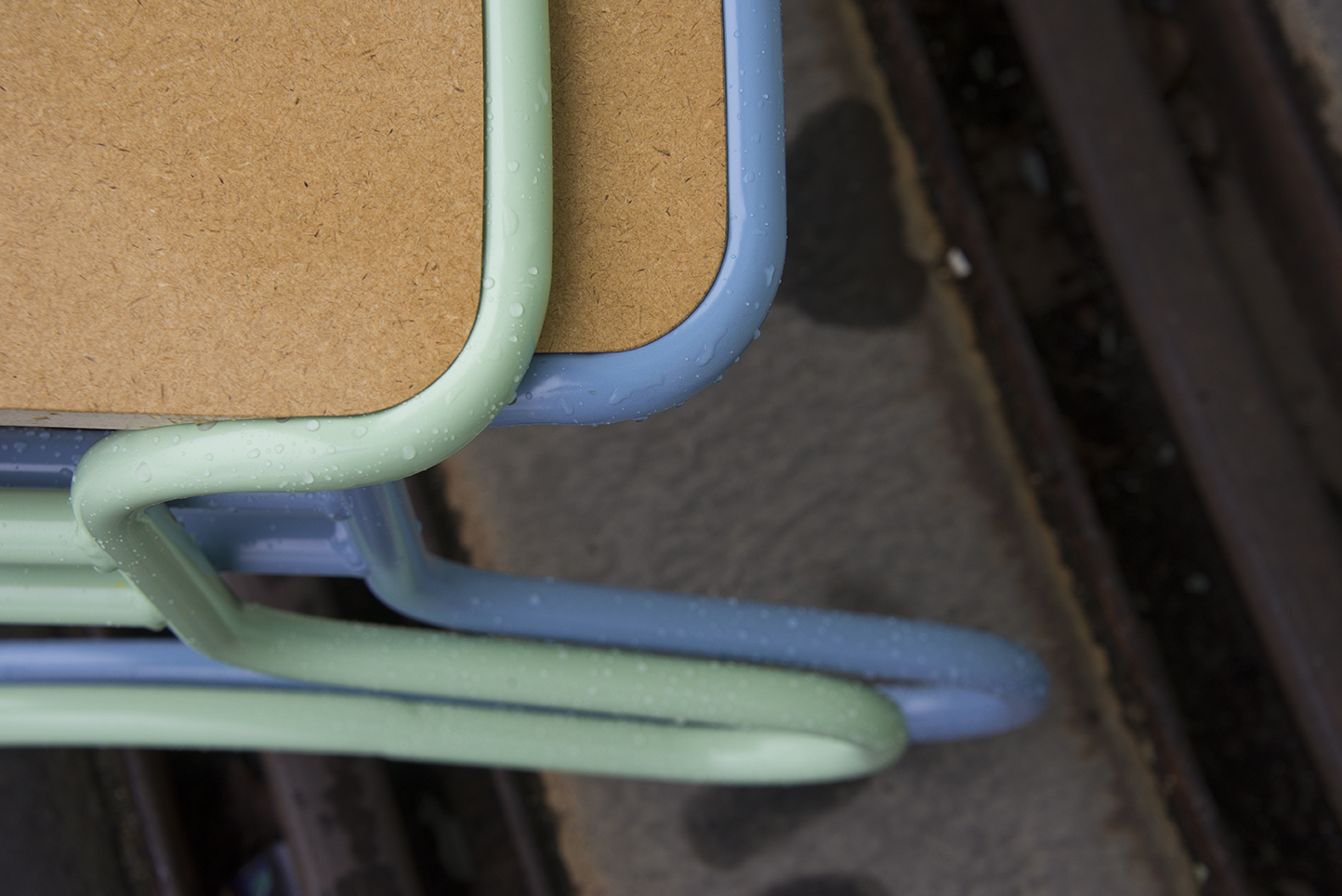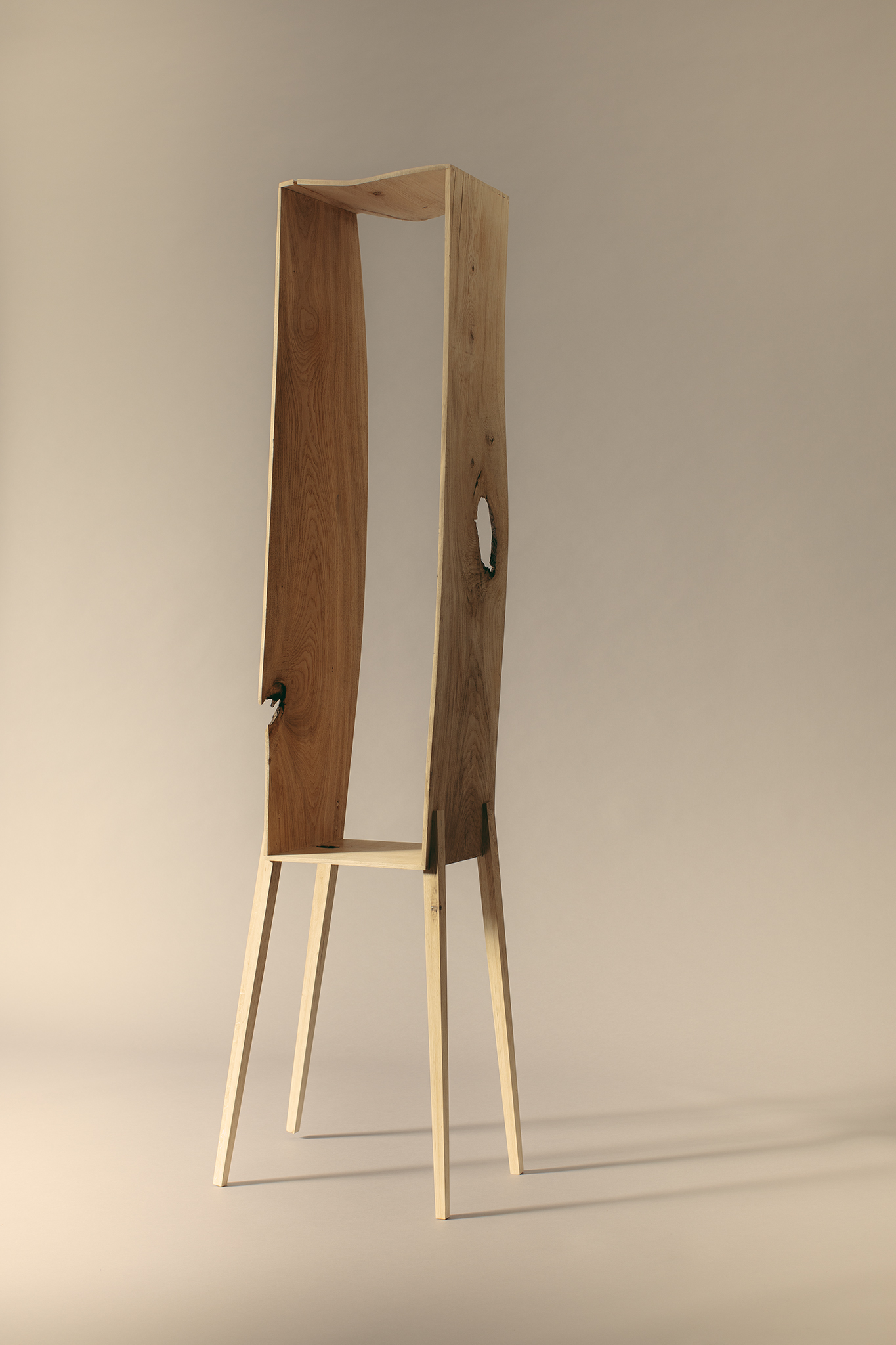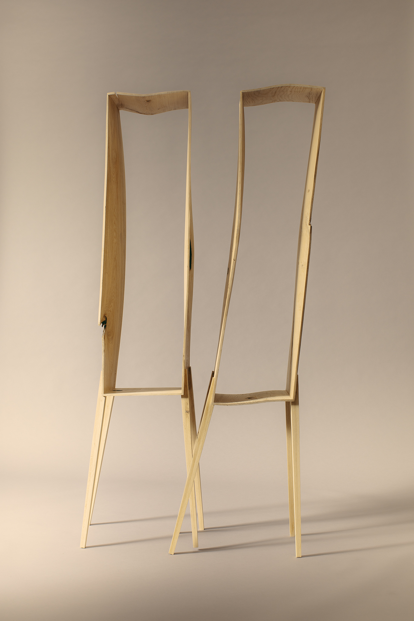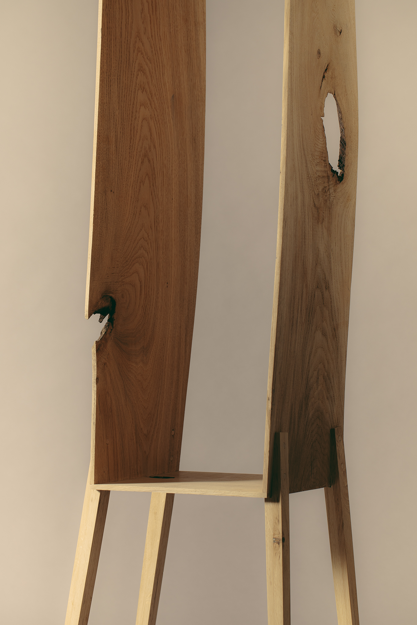 Der Entwurf verdeutlicht das Gefühl von Gewicht in meinem Inneren.Es bedeutet das Maß an Verantwortung, die ich fühle oderder Grad der Atmosphäre, die ich empfinde, wenn ich bestimmte Dinge sehe.Der Oberkörper (Weste) des Hoodies erscheint schwer, indem breit geschnittene Jerseystreifen aus einem alten Kleid neu verstrickt wurden.Das Wesen des Kleides bleibt somit in einer anderen Form erhalten.Der Kapuzenteil des Hoodies ist großzügig geschnitten und besteht aus leichtem und dehnbarem Jersey. Die Silhouette sollte leicht beginnen und in ein Wechselspiel der Schwere und Leichtigkeit der Materialien übergehen.Der Rock zeigt gewissermaßen eine grobe rechteckige Form. Durch die Beschaffenheit der Seide klebt der Rock am Körper und zeigt die Silhouette im Inneren.Um den Rock mit dem Oberkörper zu verbinden, habe ich eine dünne Kette verwendet.Ich mag die Harmonie der leichten Seide verbunden mit der dünnen Kette.Fein aber stark, verschwommen und dennoch sicher.