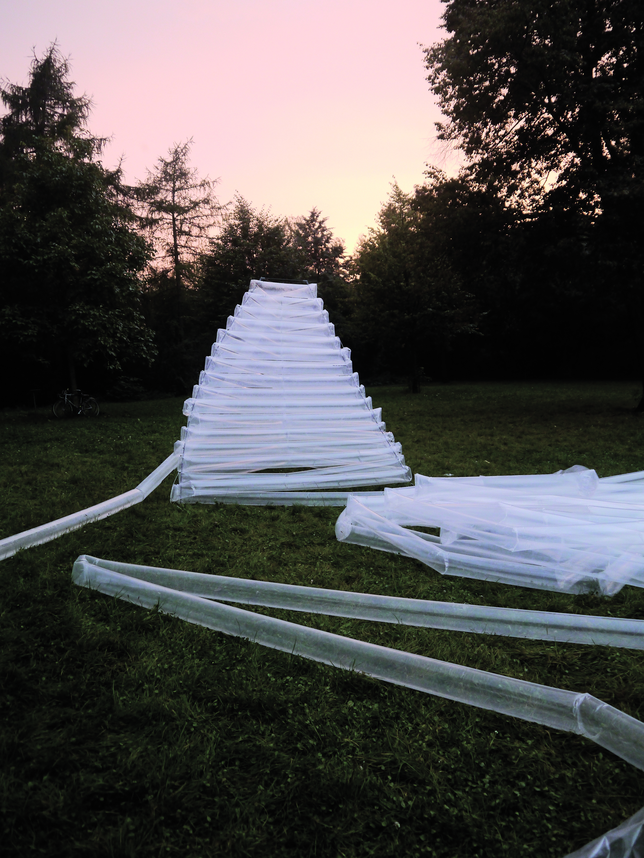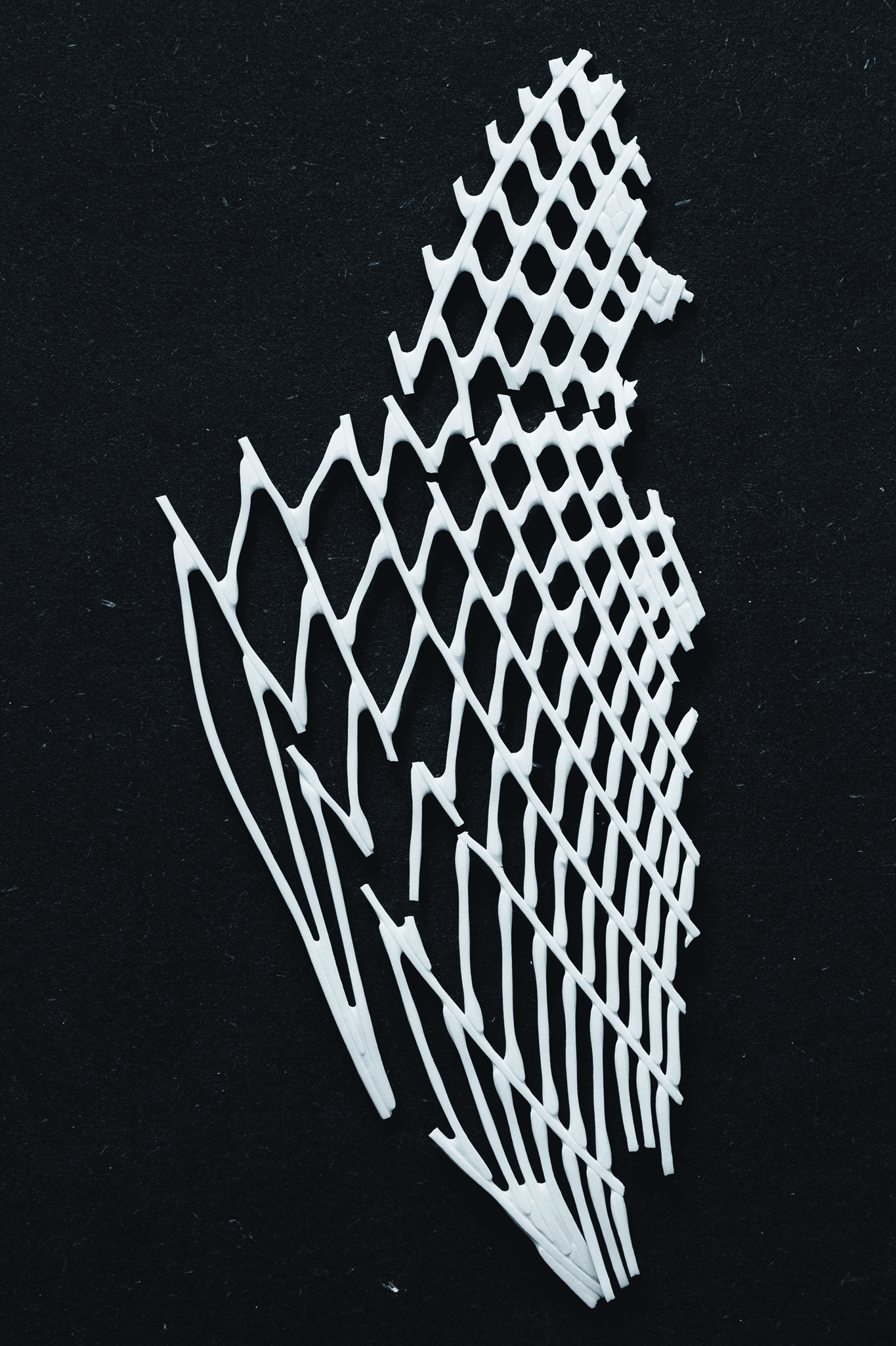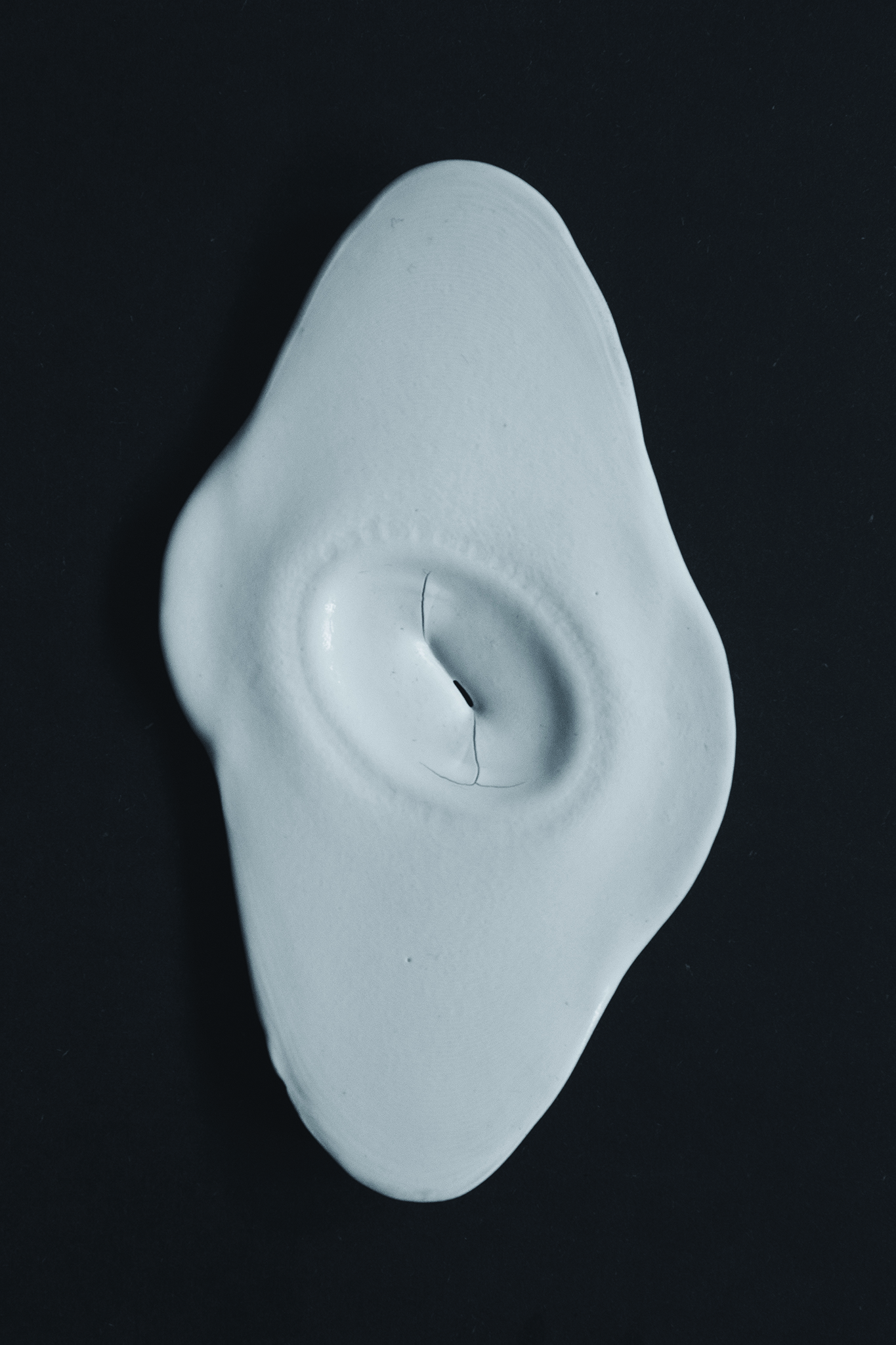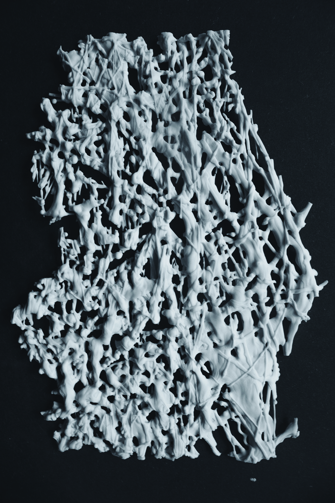 The skin offers us protection and is the visible outer shell of living beings. As well as the hoodie as a second layer becomes a very personal, own part of our body, of our existence. Safe, protected, as if fitted to one’s own body, the garment exists on and connected to the human being. The play between the natural and an outer shell, becomes one.My project deals with the human surface in its biological form, designed by self-produced bioplastics that, like us, will eventually decay. Inspired by nature, water and waves, the garment wraps asymmetrically and organically around the body. It is reminiscent of a mystical transformation of the human being in the hoodie. This installation represents the excursion of bio-based materials, which are our future, with the abstract representation of the human form.