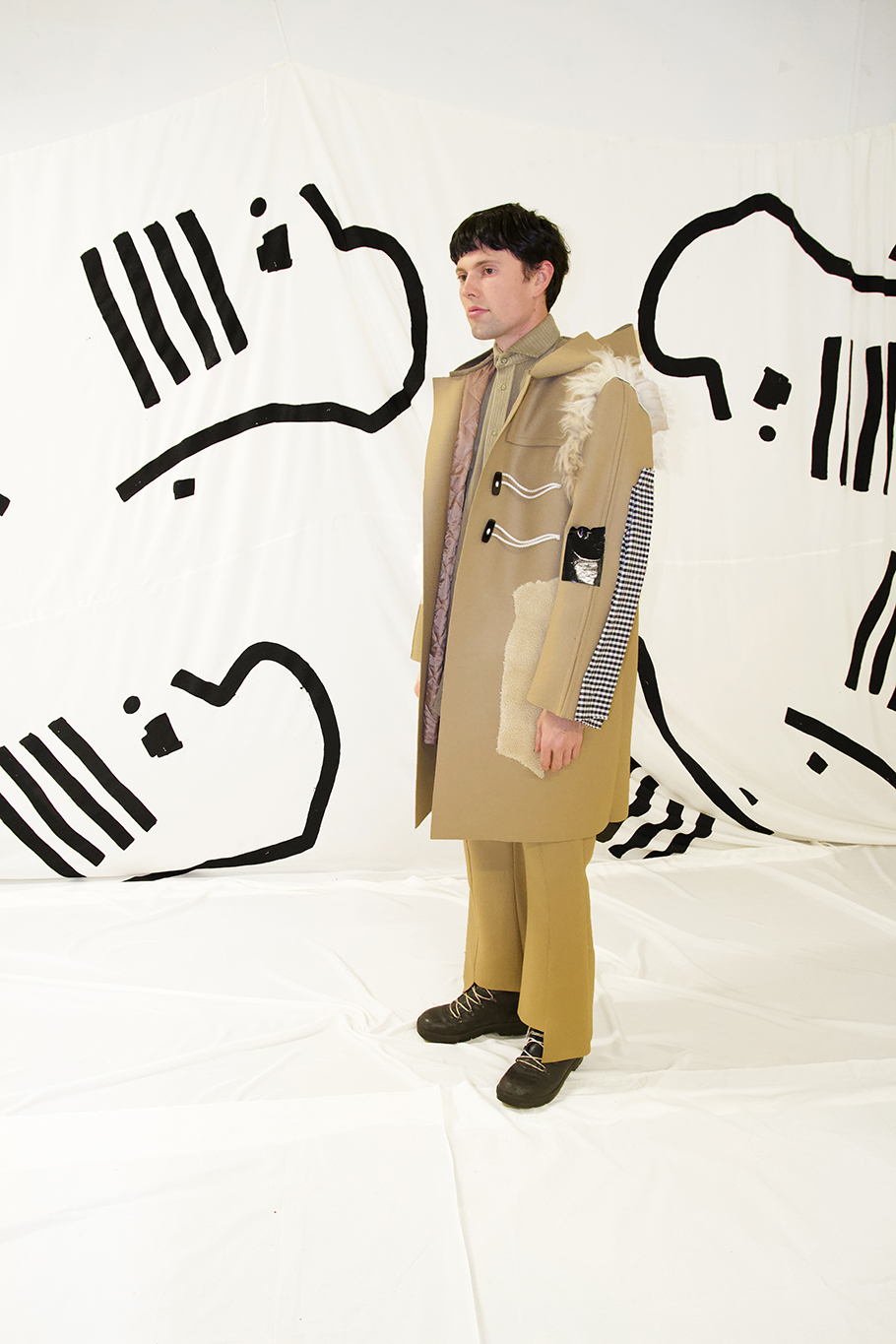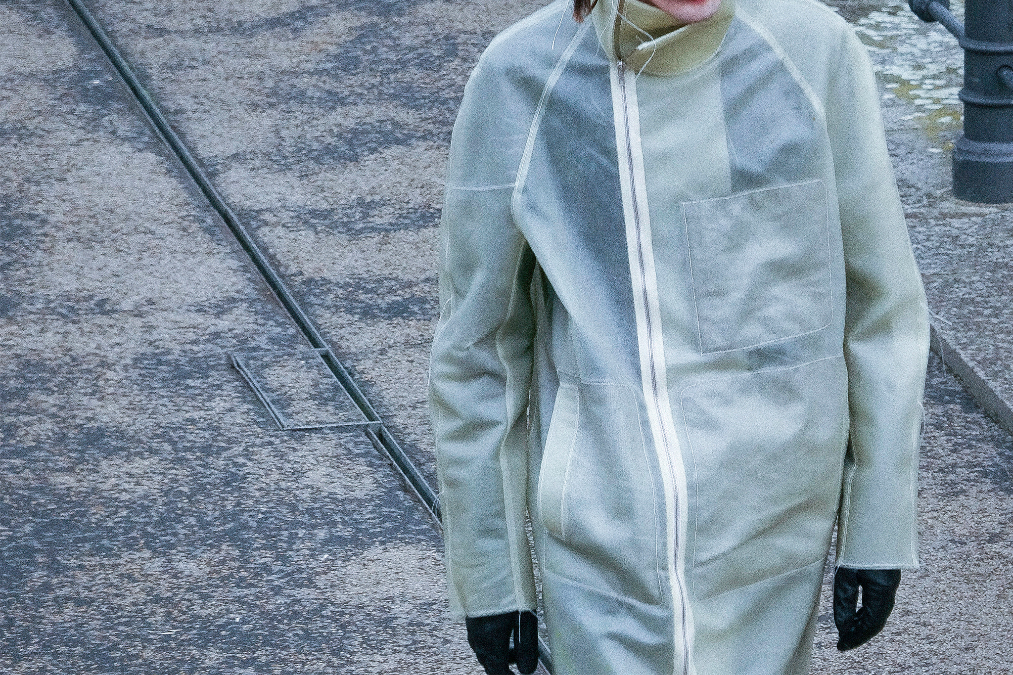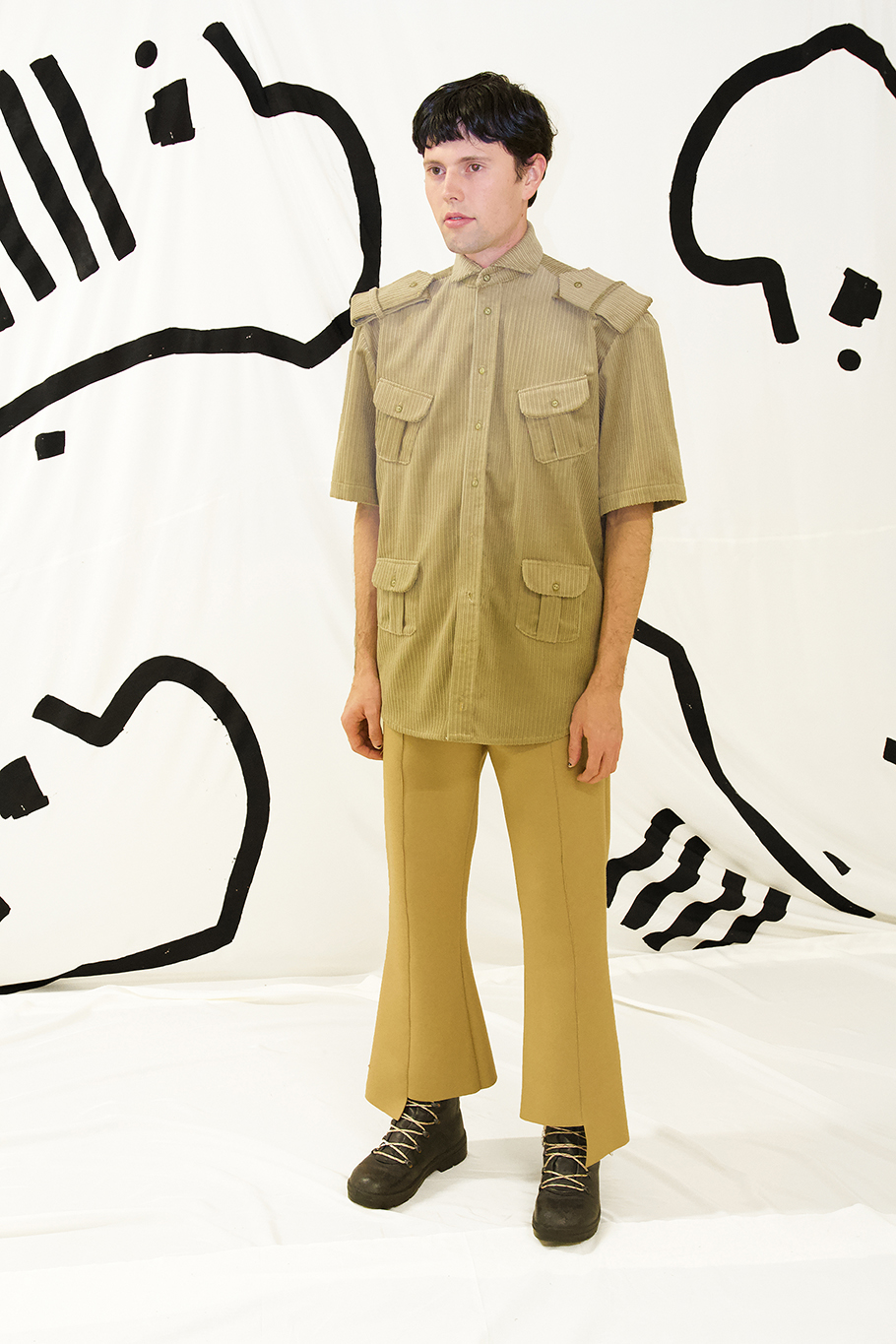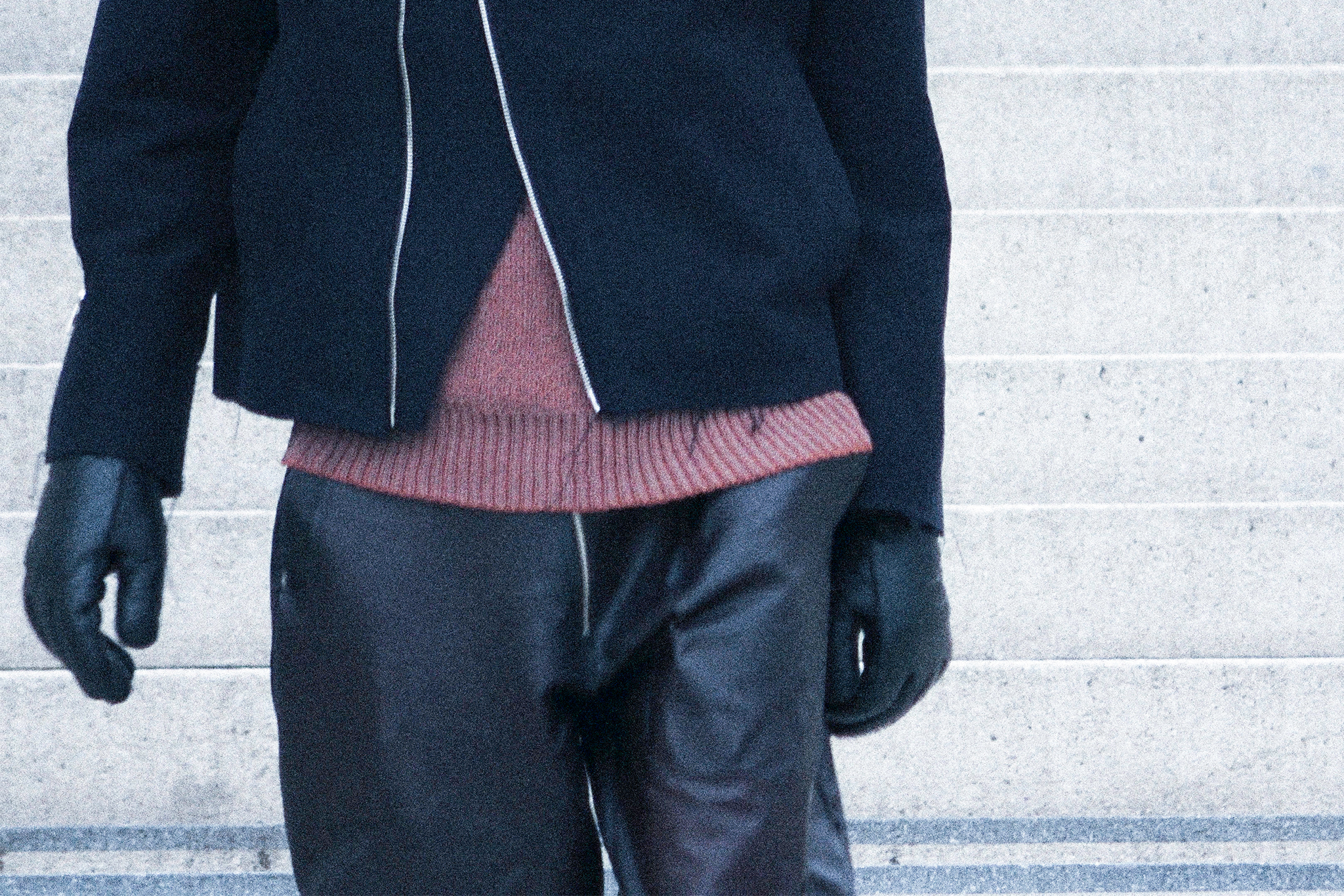 „Ärmel hoch, Hose runter“ geht ehrlich mit der Rolle der Workwear als Dekoration um und entzieht ihr konsequent den Nutzen. Medizinische Schuhe werden zu hoch um drin zu laufen, Schutzhandschuhe werden aufgeschnitten und Helme werden weich. Die Kapuze wird zu dem dekorativen Element, dass sie eigentlich schon immer war. Und einige Elemente erscheinen auch nur, weil sie schön sind – denn nicht alles in Menswear bedarf einer Erklärung.