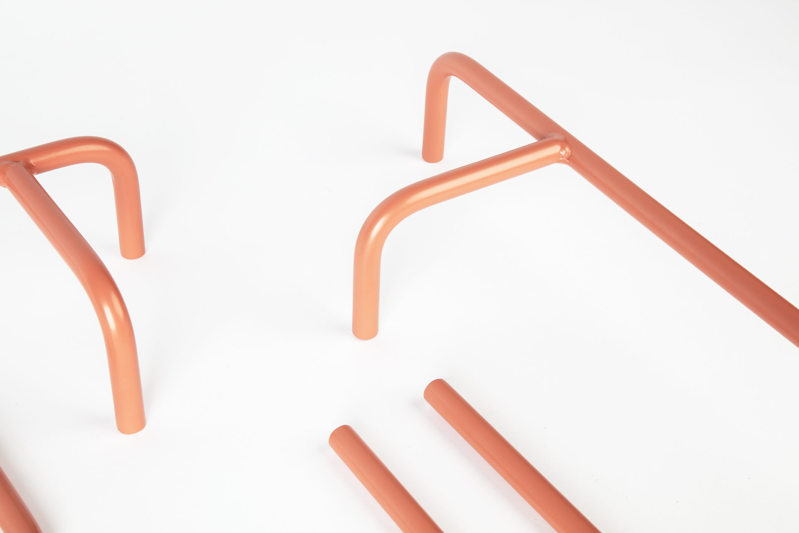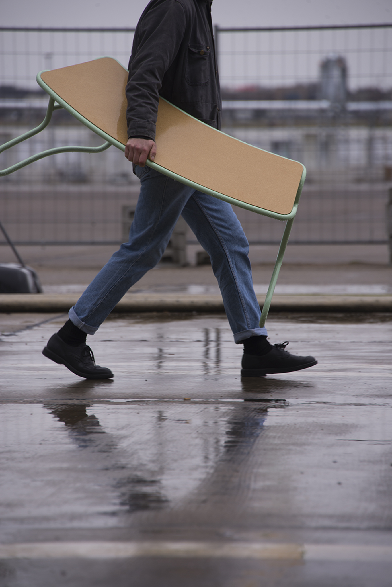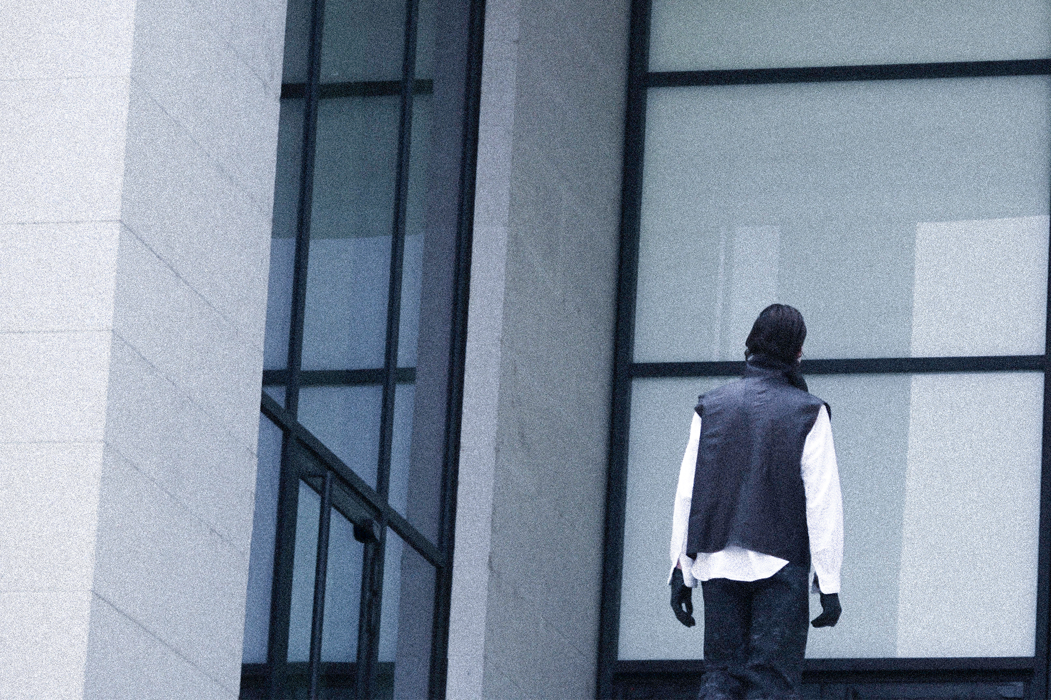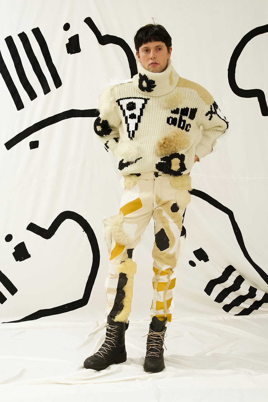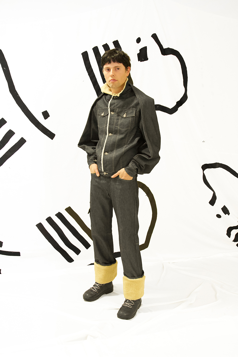 „Ärmel hoch, Hose runter“ geht ehrlich mit der Rolle der Workwear als Dekoration um und entzieht ihr konsequent den Nutzen. Medizinische Schuhe werden zu hoch um drin zu laufen, Schutzhandschuhe werden aufgeschnitten und Helme werden weich. Die Kapuze wird zu dem dekorativen Element, dass sie eigentlich schon immer war. Und einige Elemente erscheinen auch nur, weil sie schön sind – denn nicht alles in Menswear bedarf einer Erklärung.