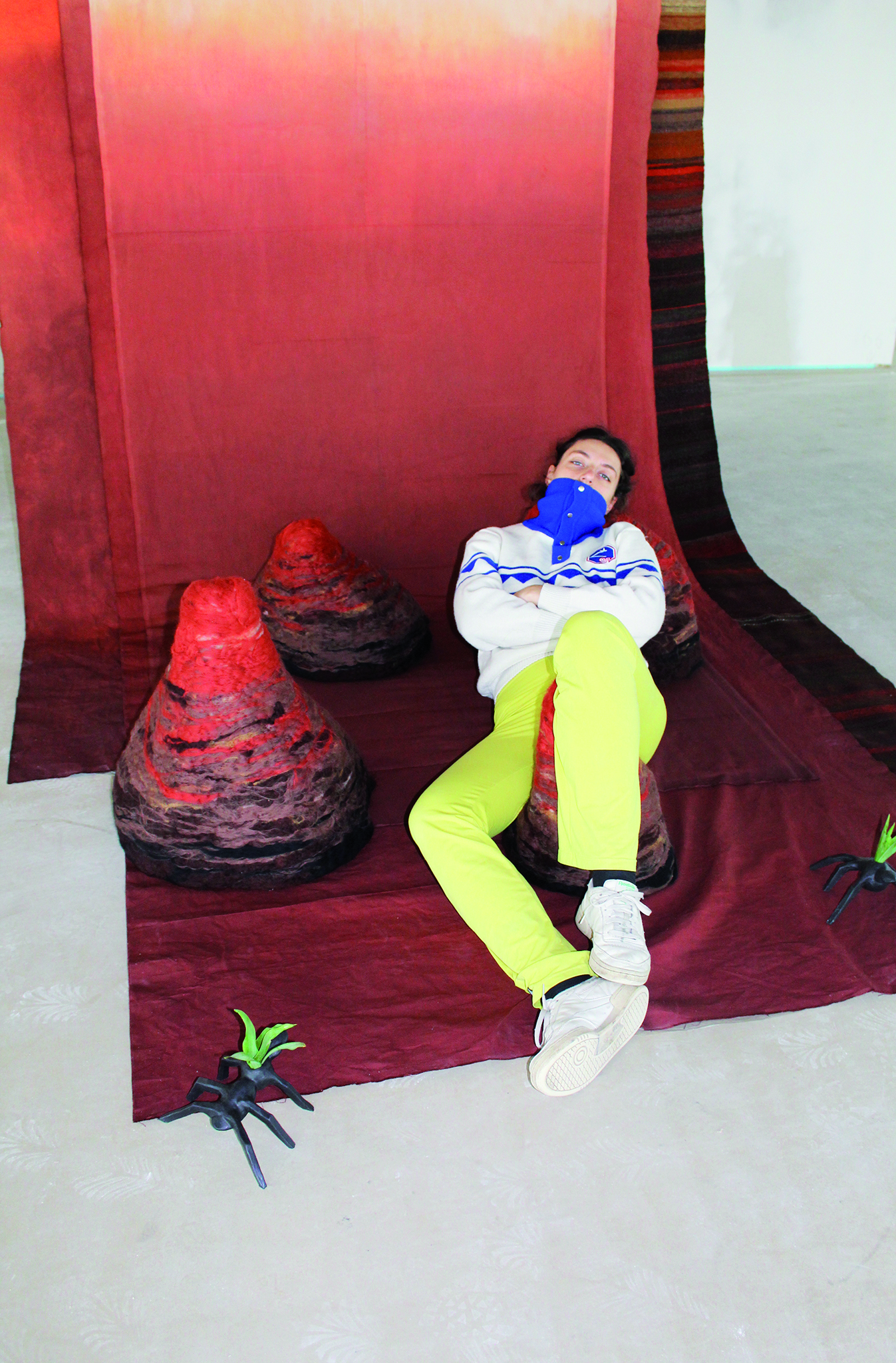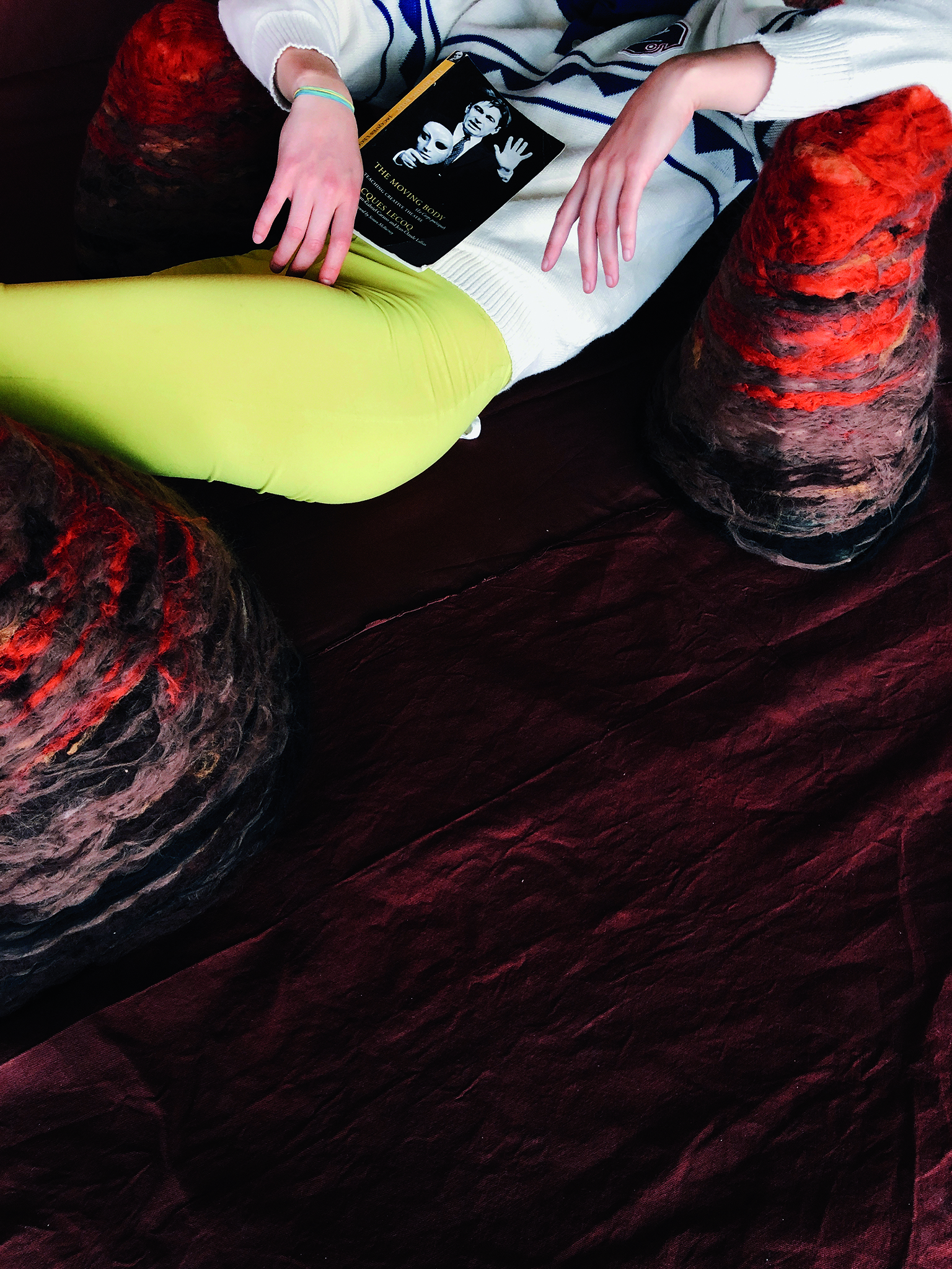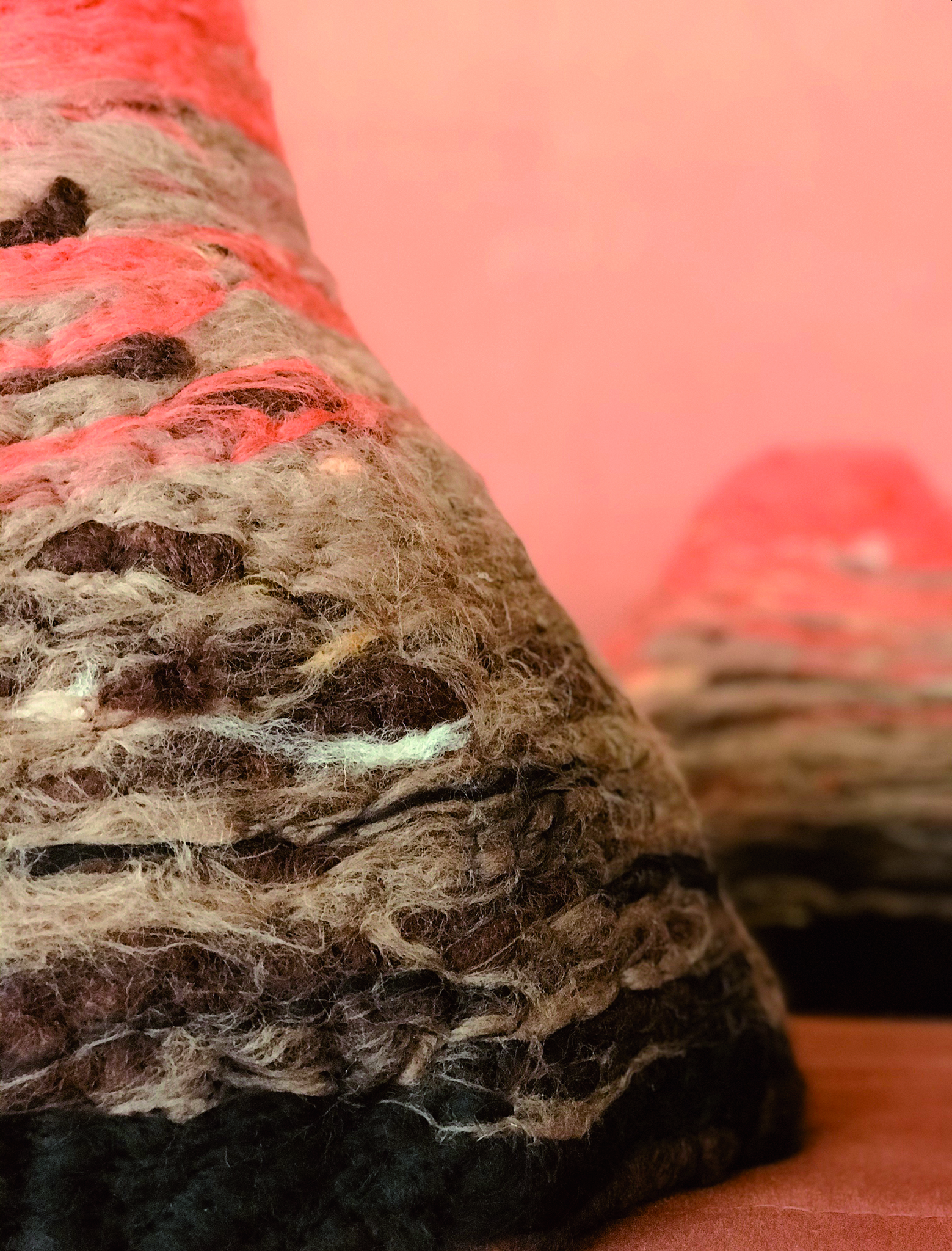 For my project I was inspired by the beauty of nature in its primal state. I wanted to focus on contrasting accents such as solid and liquid, cold and burning hot, dark and light, life in motion versus stillness, and movement as something deadly yet beautiful. In my video I wanted to emphasize these contradictory elements to show the flow of life and its integration with nature, as well as the melancholy of motionlessness. The volcano was the main inspiration for my hoodie, which was the mood board not only for the colors but also for the textures I chose.The volcano rewards with life through its stillness and punishes with death through its movement – for me this reflects the embodiment of beauty.Through the smocking technique, the pleats and wavy lines, I wanted to translate the organic texture of the stone into the garment, and the knitted red rough lines hidden between the pleats and revealed at the top represent burning, flowing lava erupting in the form of the hood over the hoodie.