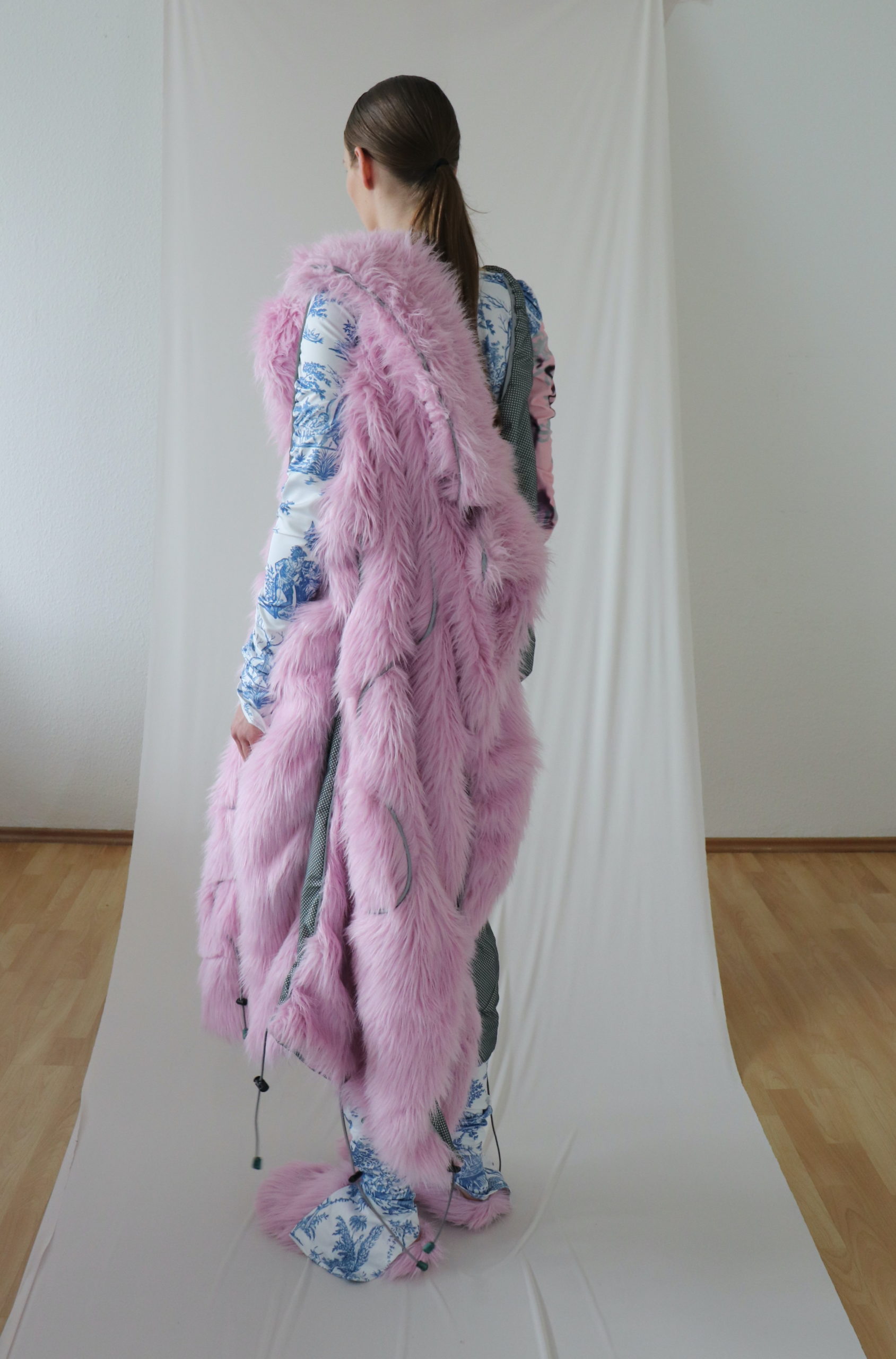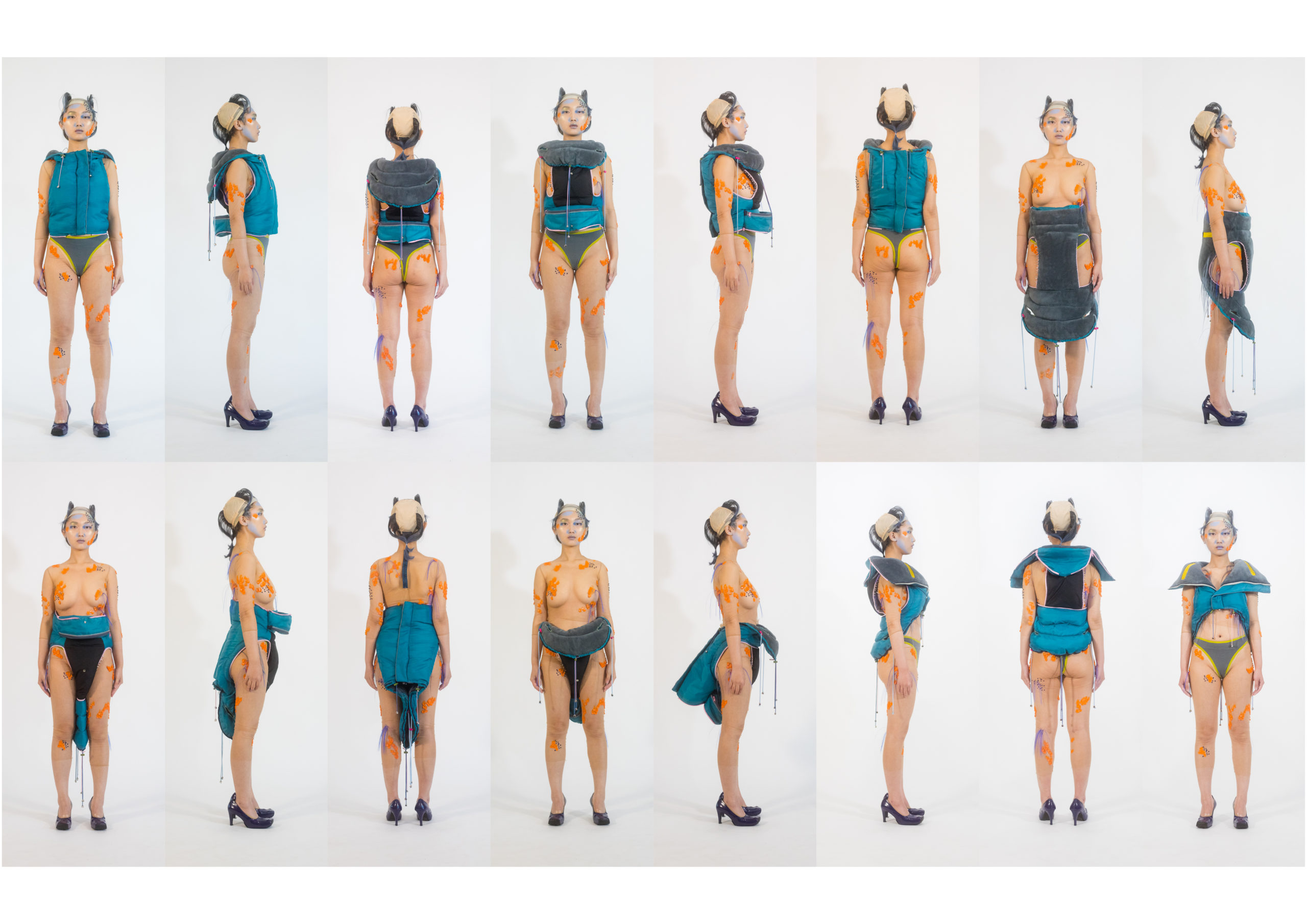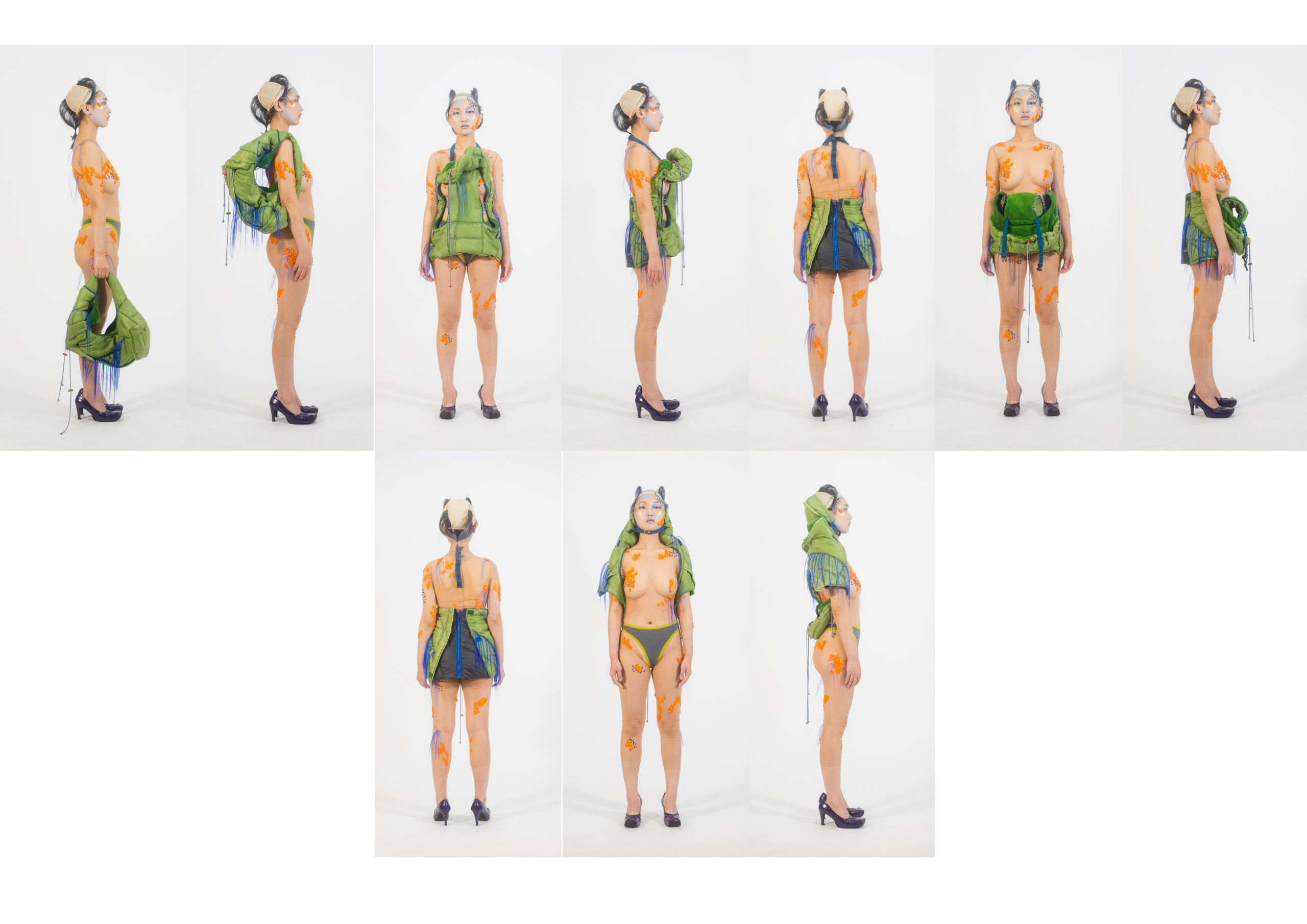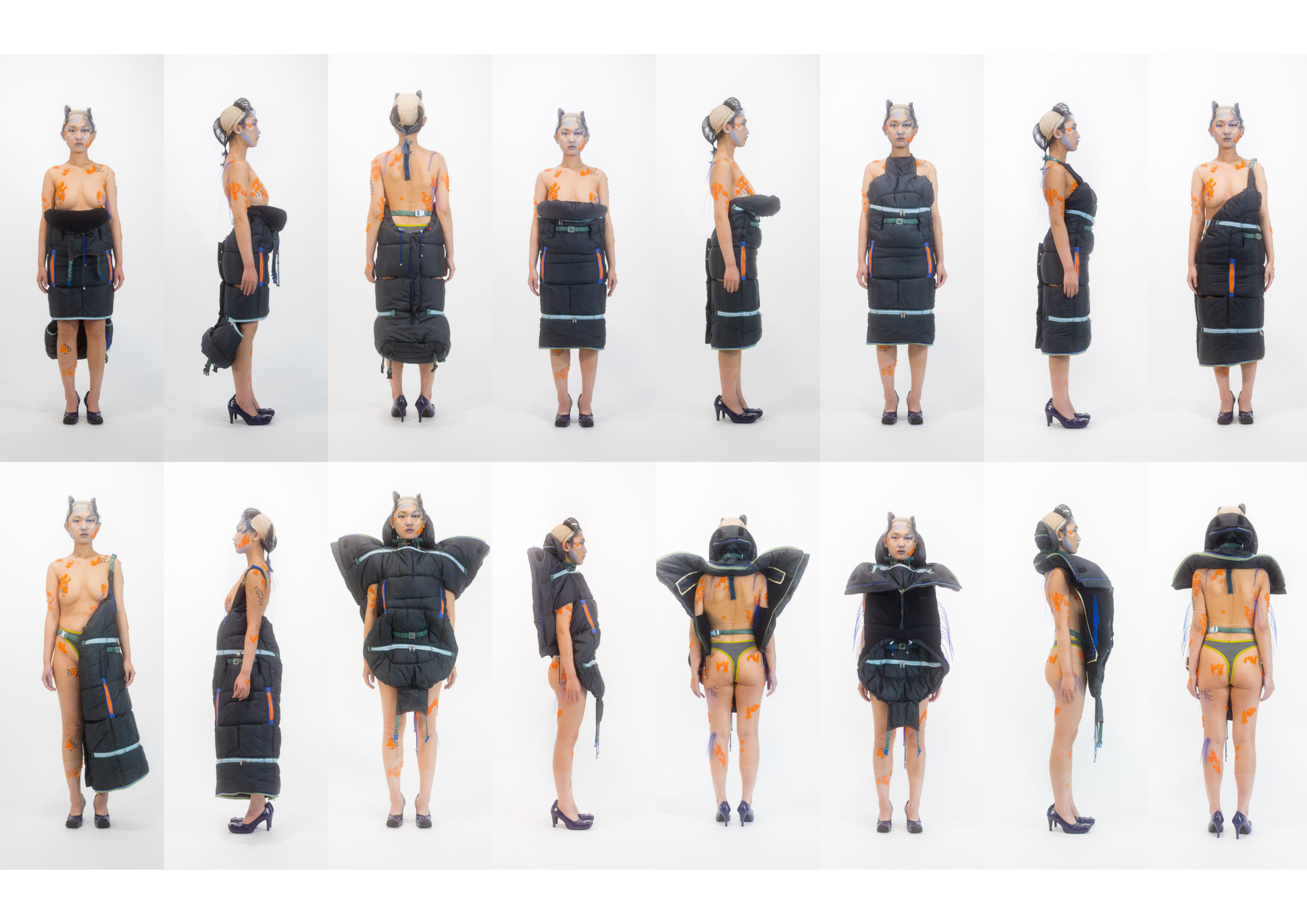 Throughout history, an ideal body has developed that people have not been able to distance themselves from for a long time. People who do not fit into this perfect image are prisoners in their body, which is not perceived as perfect by society. The hoodie serves as protection and a place of retreat from contemptuous looks and comments. Dealing with this subject has led me to develop a distorted perception of the body. Between stigmatized classical beauty, a sculptural figure develops that distorts/deconstructs the body as it is known and is meant to bring it into new dimensions. A play between space and body emerges that both relate to the body and distances itself from it. By modifying the silhouette, a positive reference is drawn to inequalities that are inherent in everybody.By creating a manifestation, the viewer is encouraged to distance himself from the „normal“ ideal image. The wearer must turn away from familiar body shapes in his appearance, which creates a stadium between sculpture and human being. They should feel comfortable and fade out the reduction to society’s ideal image.