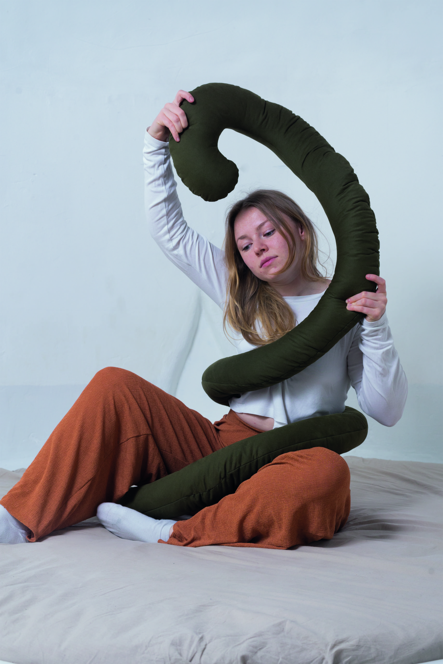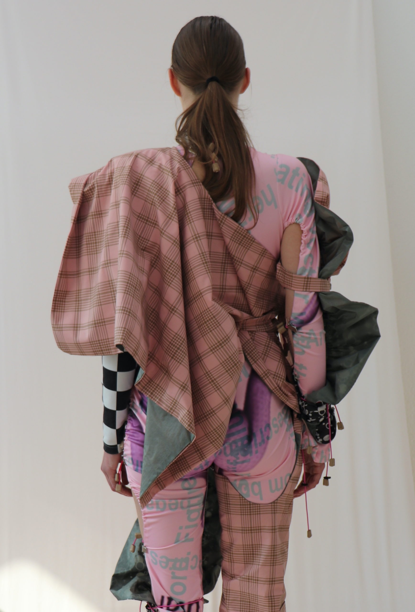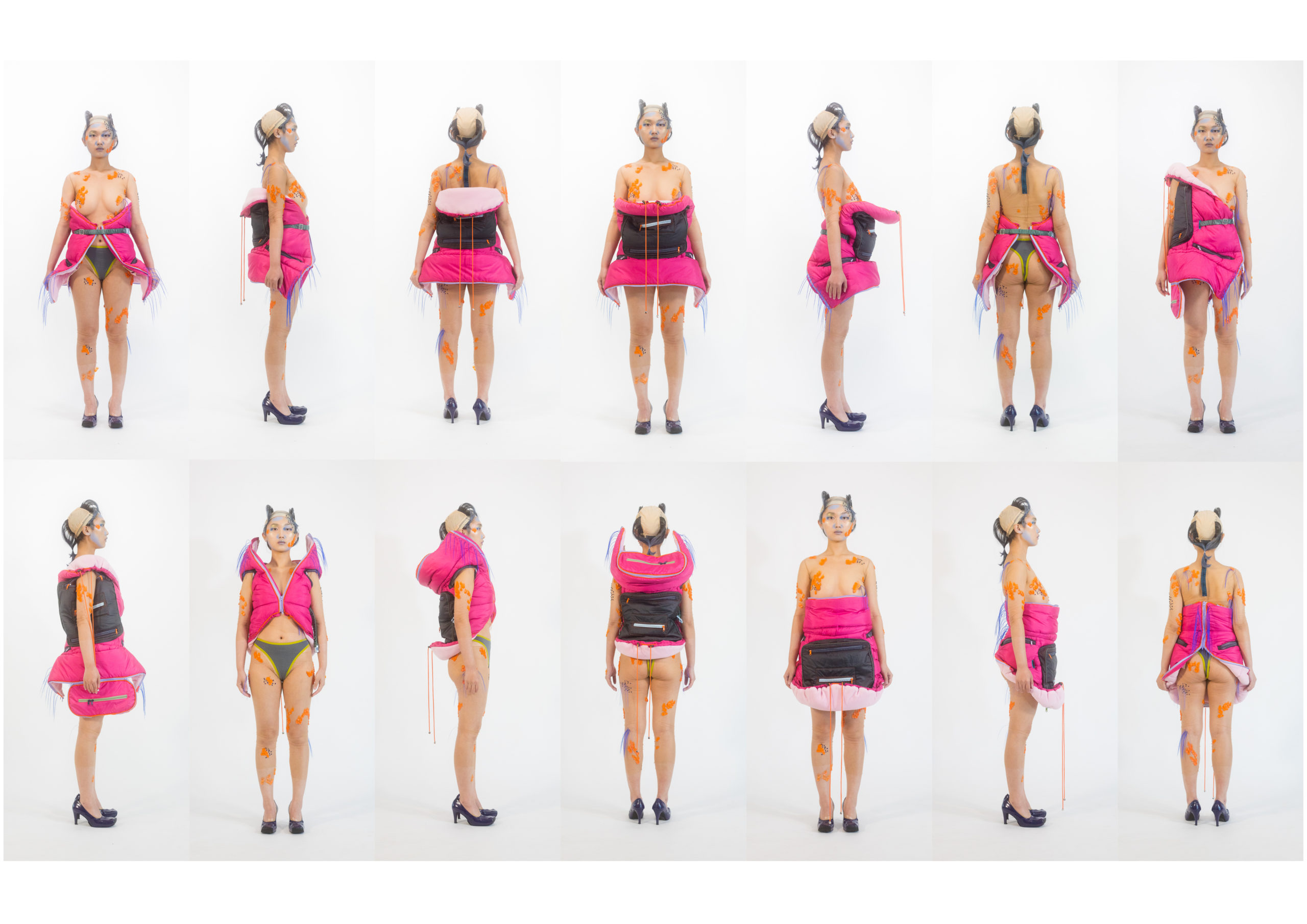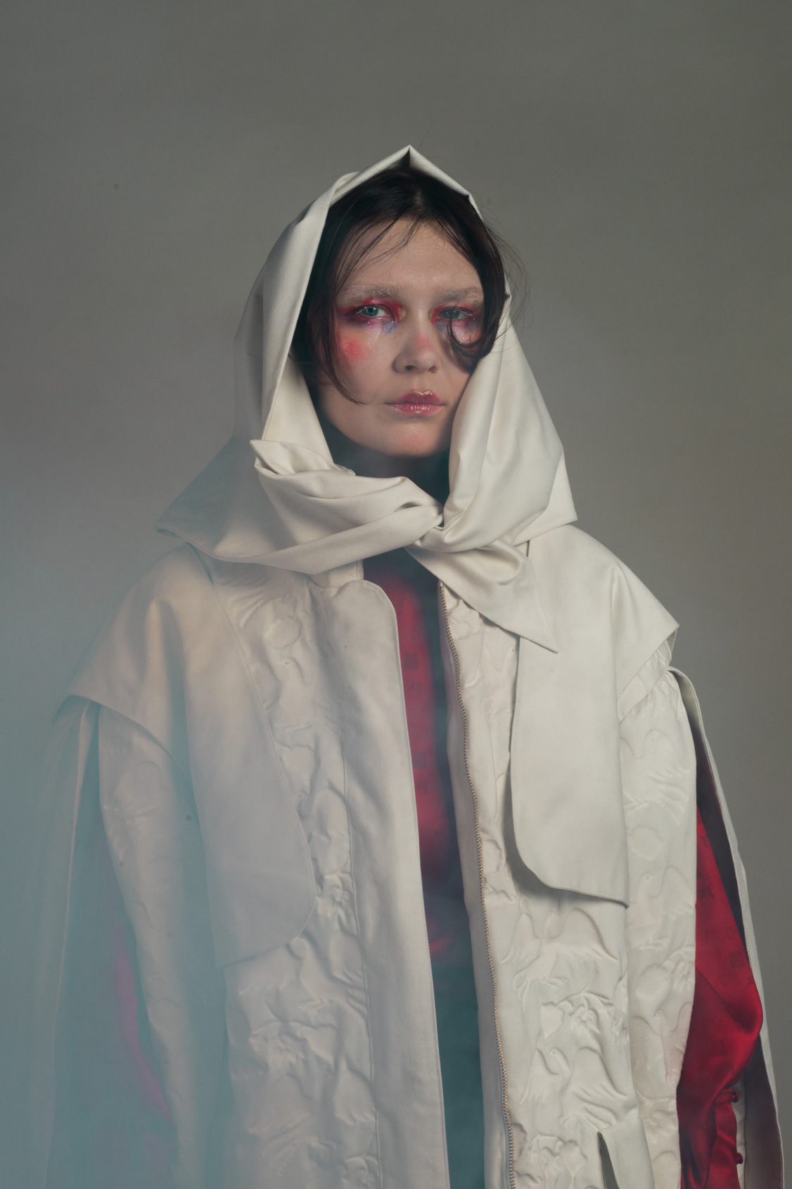 Throughout history, an ideal body has developed that people have not been able to distance themselves from for a long time. People who do not fit into this perfect image are prisoners in their body, which is not perceived as perfect by society. The hoodie serves as protection and a place of retreat from contemptuous looks and comments. Dealing with this subject has led me to develop a distorted perception of the body. Between stigmatized classical beauty, a sculptural figure develops that distorts/deconstructs the body as it is known and is meant to bring it into new dimensions. A play between space and body emerges that both relate to the body and distances itself from it. By modifying the silhouette, a positive reference is drawn to inequalities that are inherent in everybody.By creating a manifestation, the viewer is encouraged to distance himself from the „normal“ ideal image. The wearer must turn away from familiar body shapes in his appearance, which creates a stadium between sculpture and human being. They should feel comfortable and fade out the reduction to society’s ideal image.